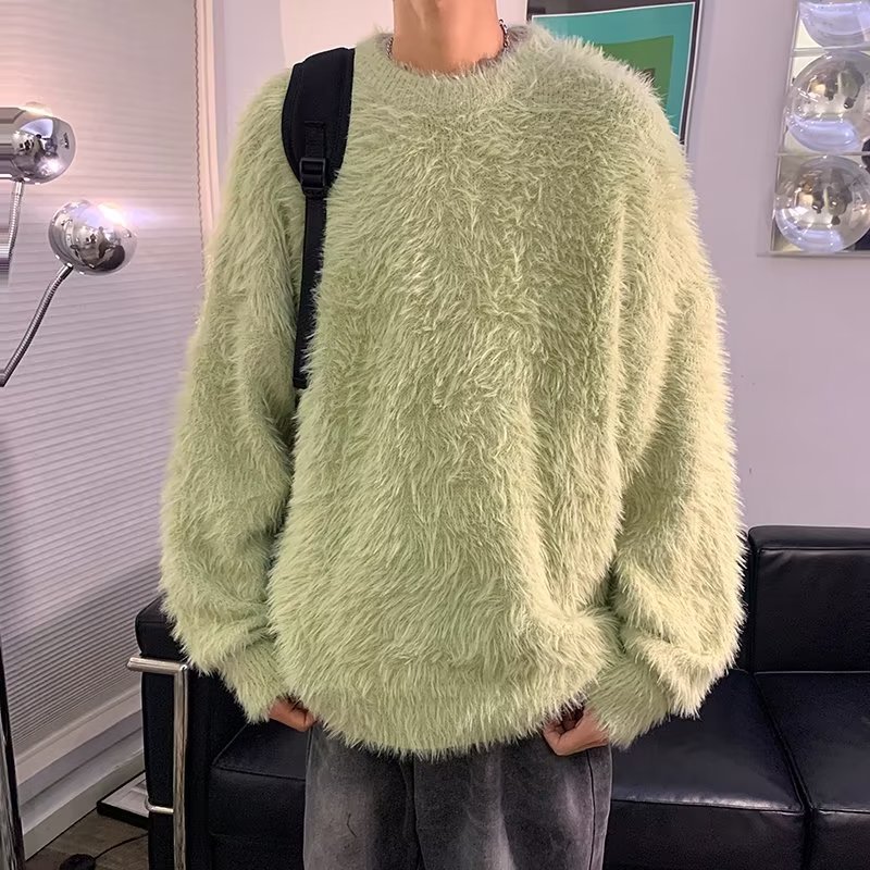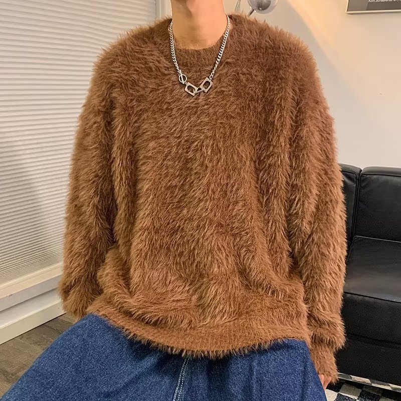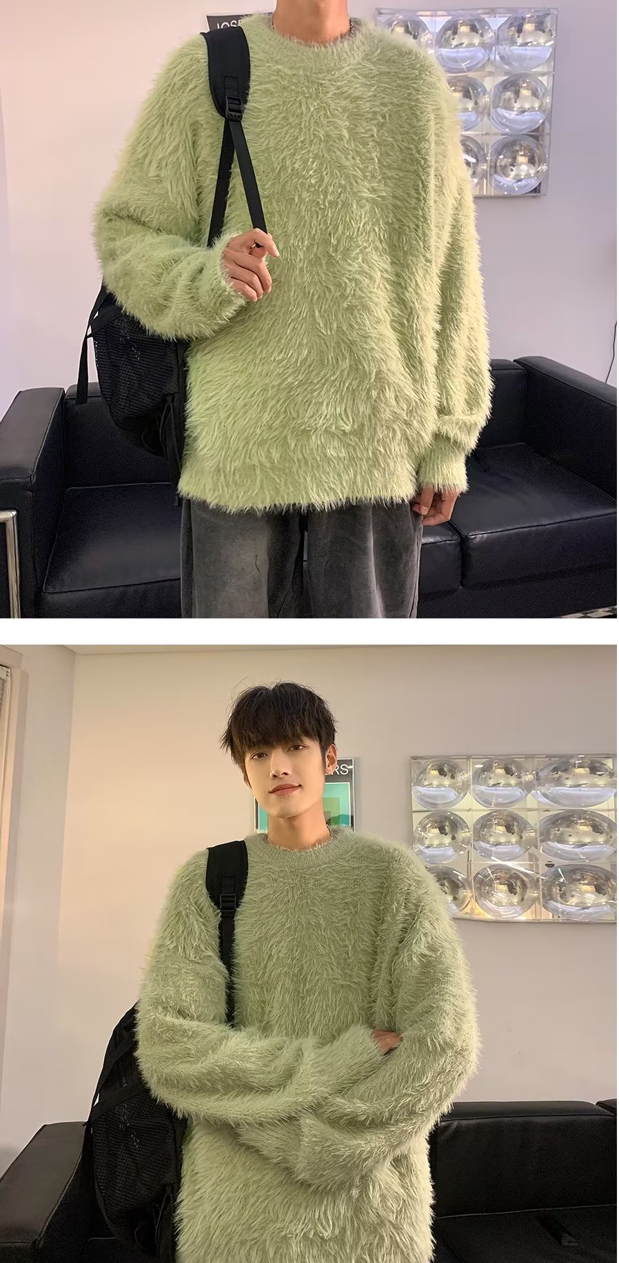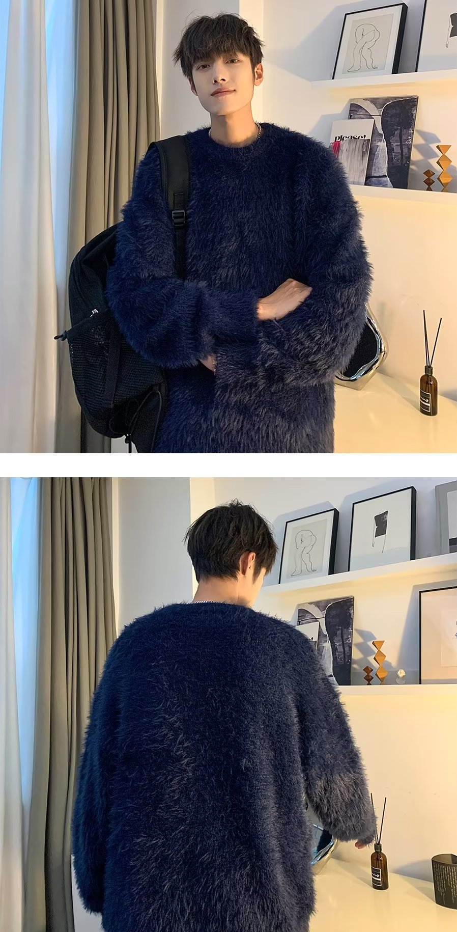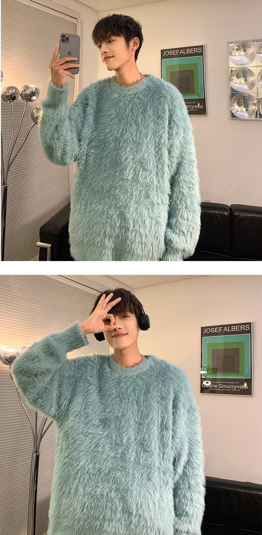 모헤어 푹신한 스웨터 남성용 트렌디 브랜드 게으른 스타일 고급 소프트 왁스 화이트 크루넥 스웨터 오버 사이즈스토어 가기