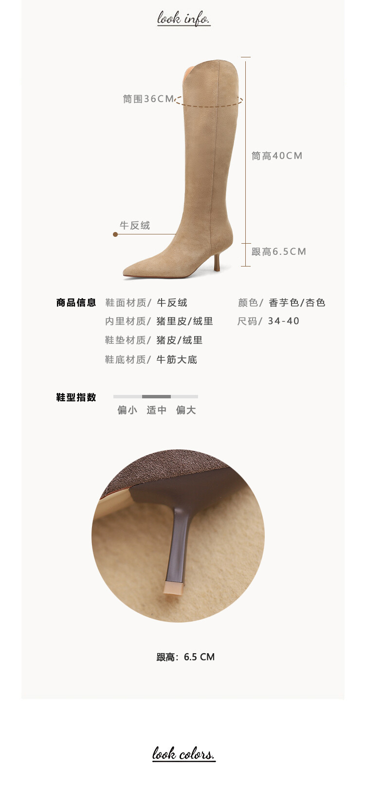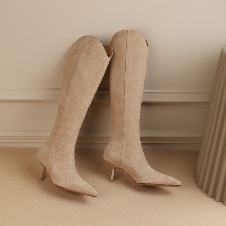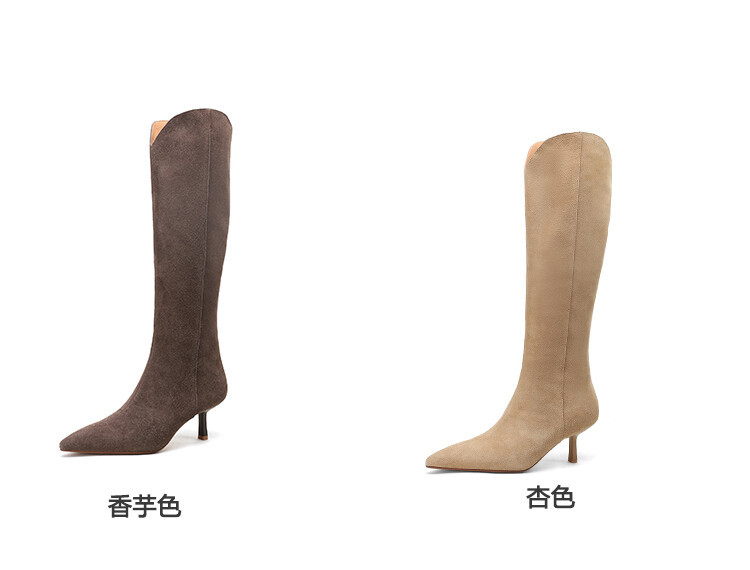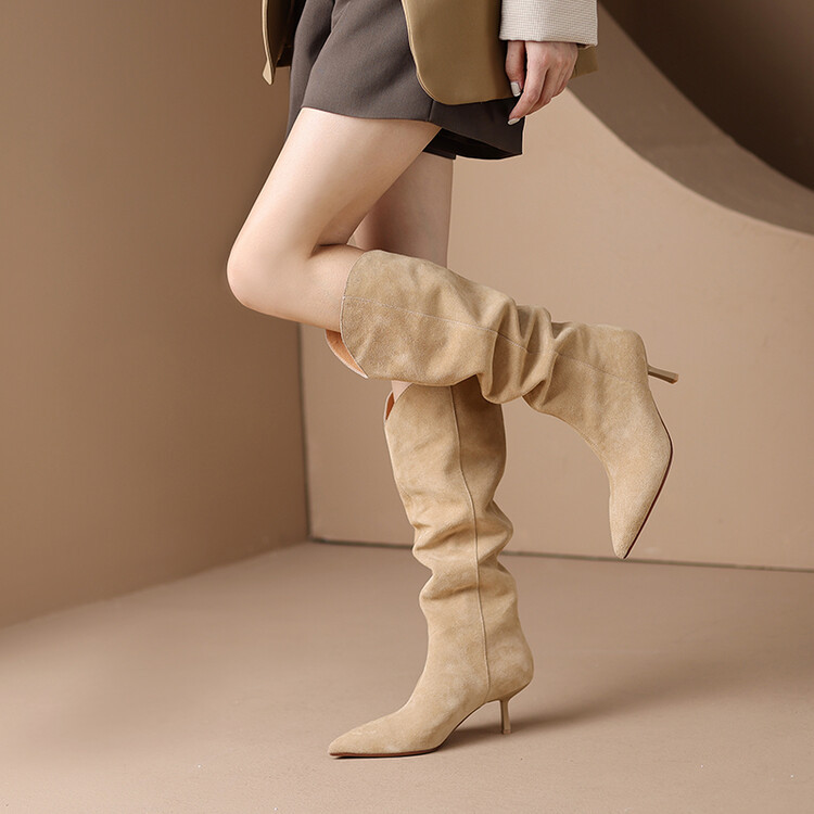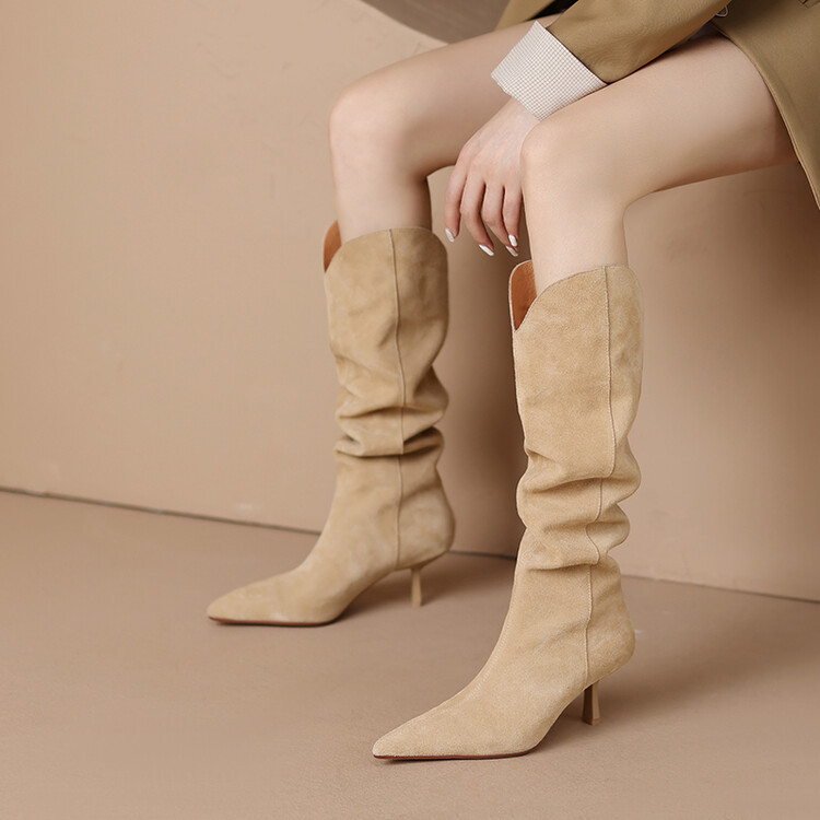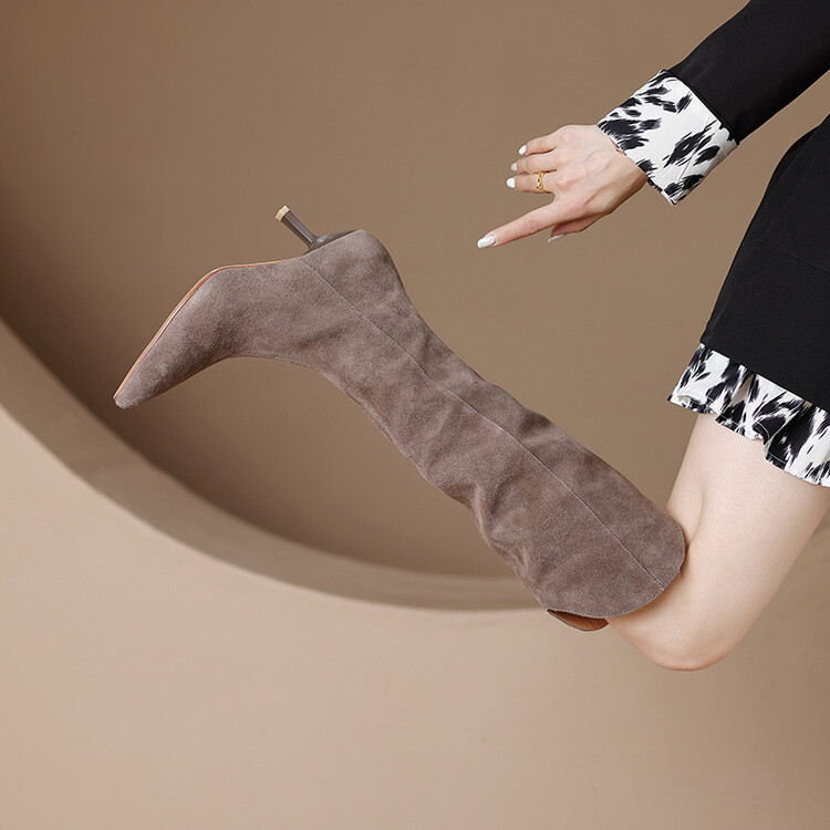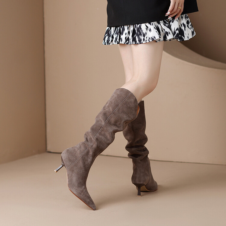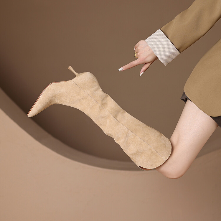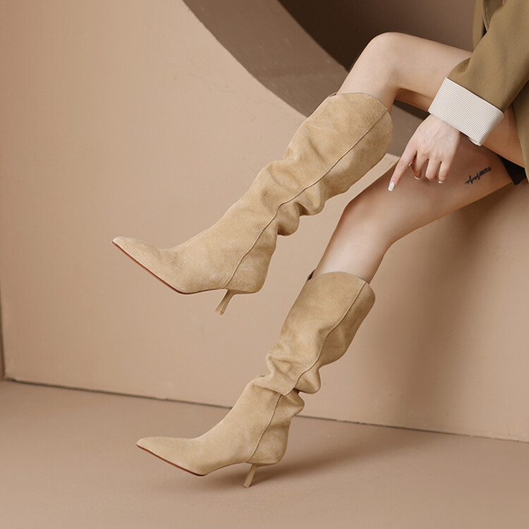 패션 다리 고급 ~ 젖빛 가죽 힙 부츠 뾰족한 단일 얇은 뒤꿈치 주름 소 스웨이드 하이힐 기사 부츠 여성용 하이 부츠