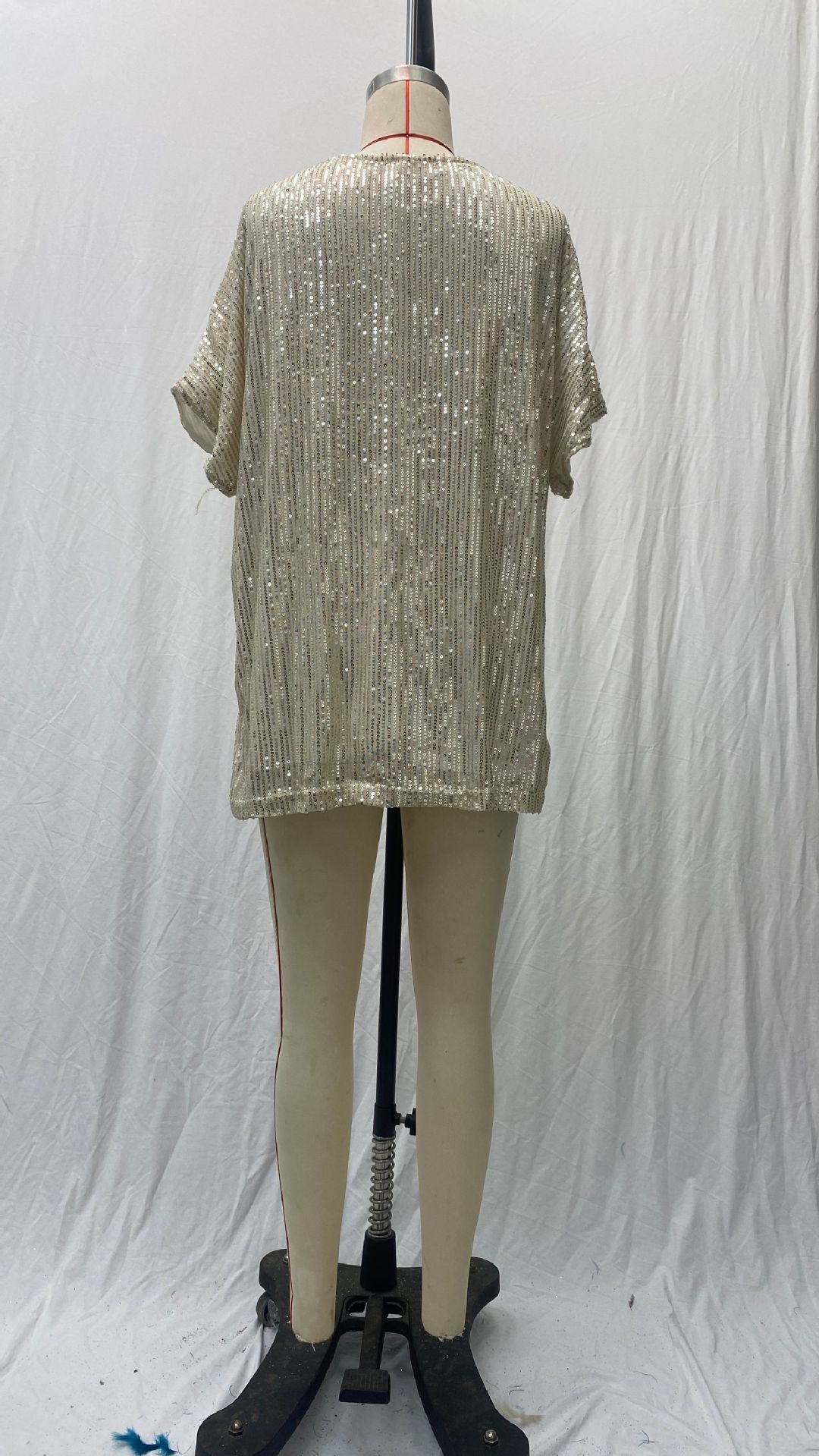 2025 새로운 유럽과 미국의 아마존 반팔 도시 캐주얼 컬러 루즈 풀오버 스팽글 v 넥 티셔츠 탑 여성 의류
