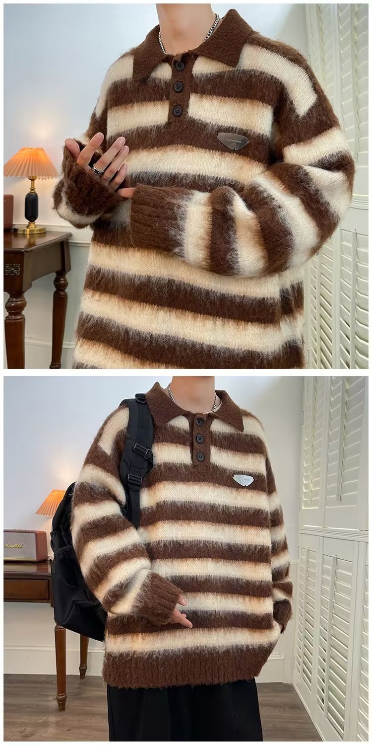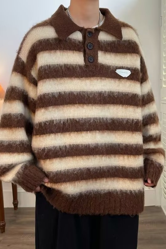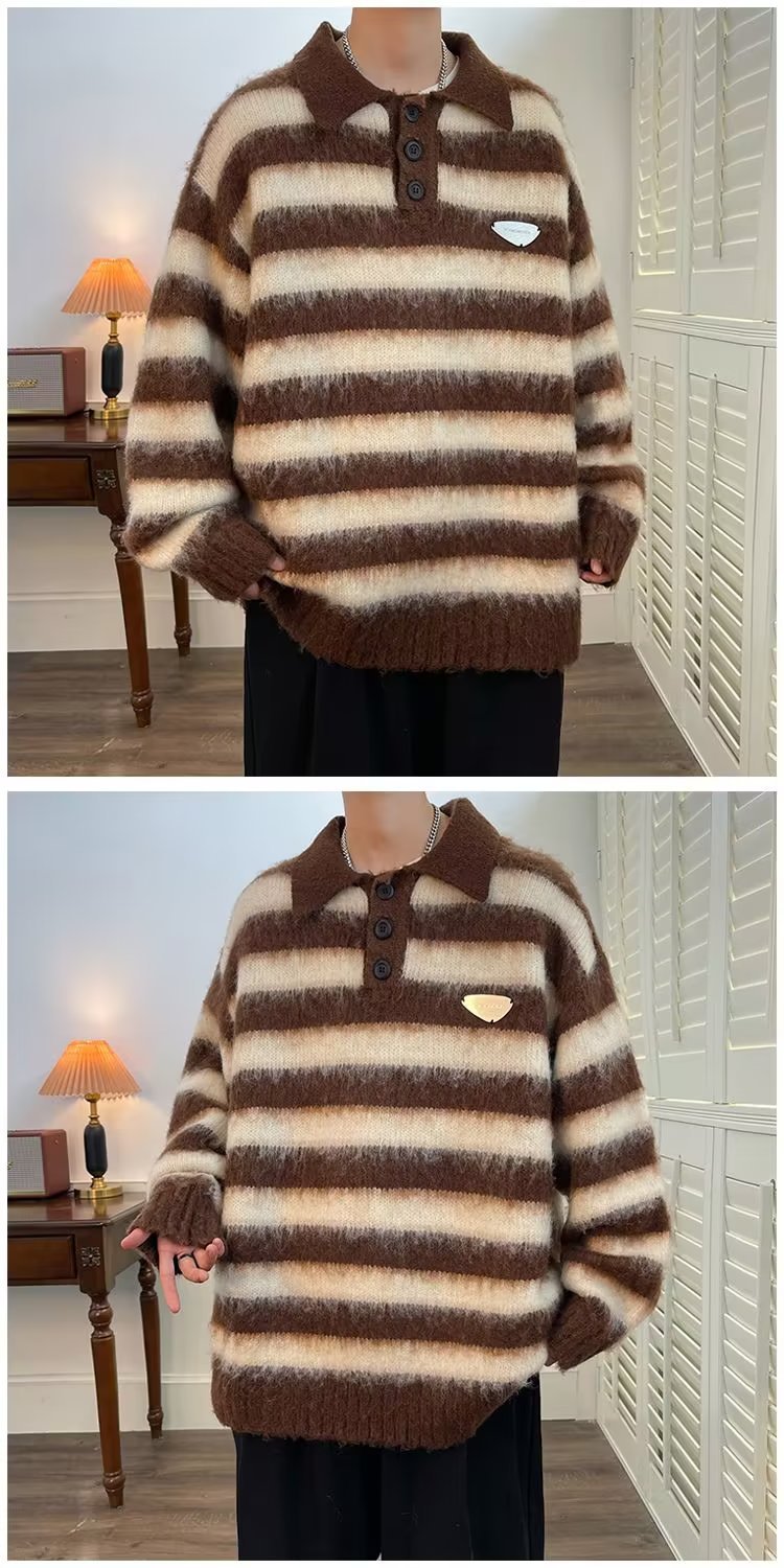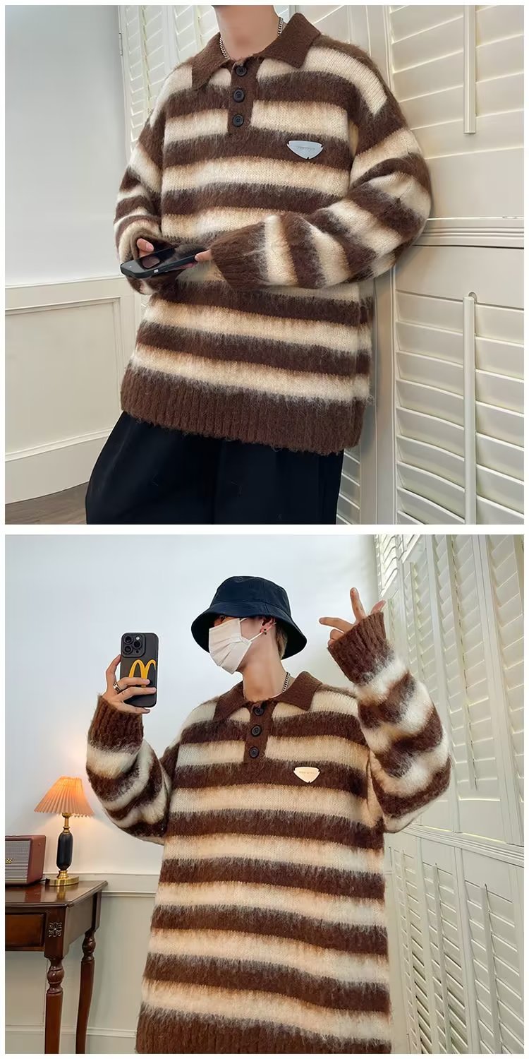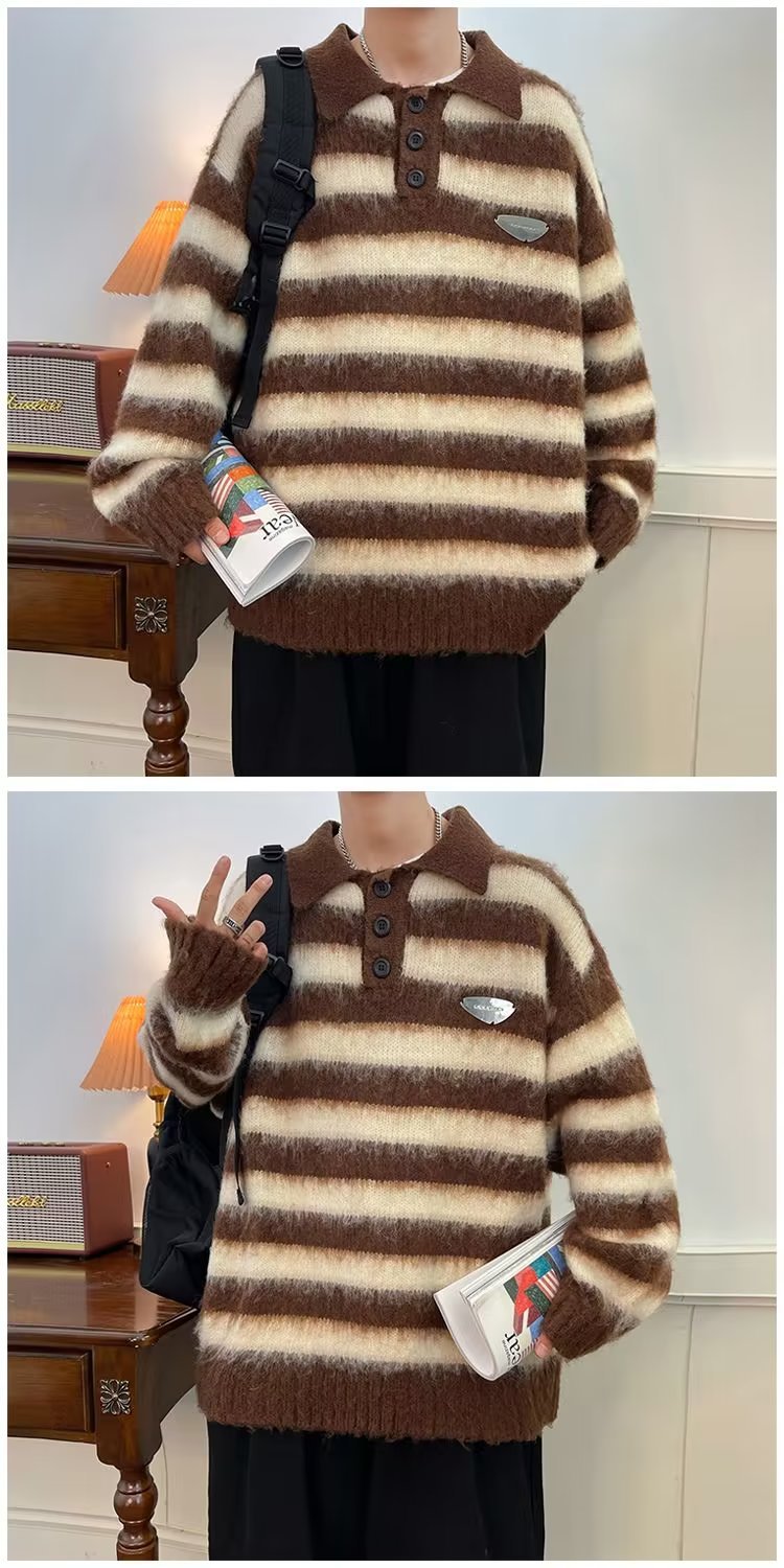 하이 엔드 패션 브랜드 스웨터 남성 가을과 겨울 다크 브라운 스트라이프 라펠 POLO 느슨한 캐주얼 남성과 여성 스웨터 커플