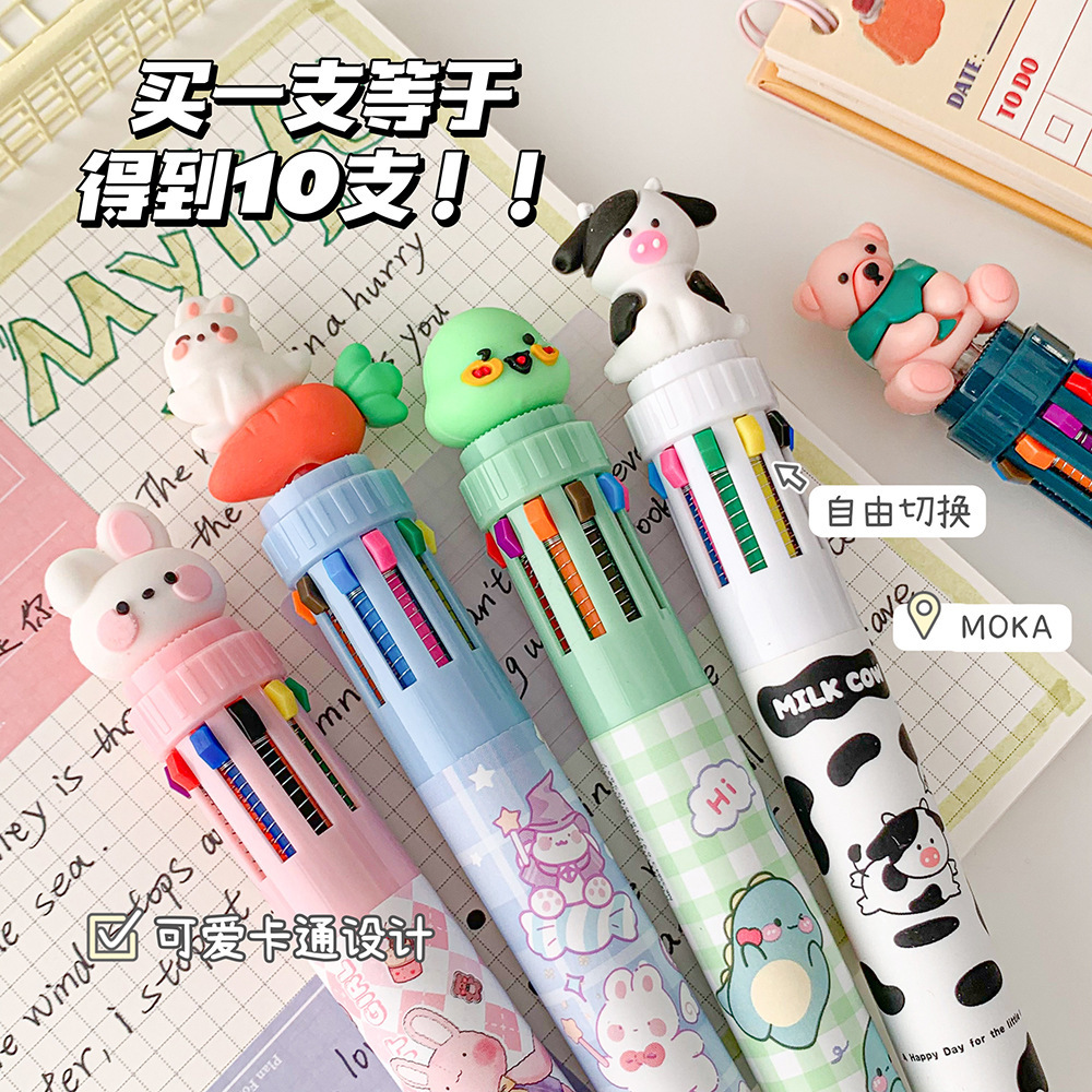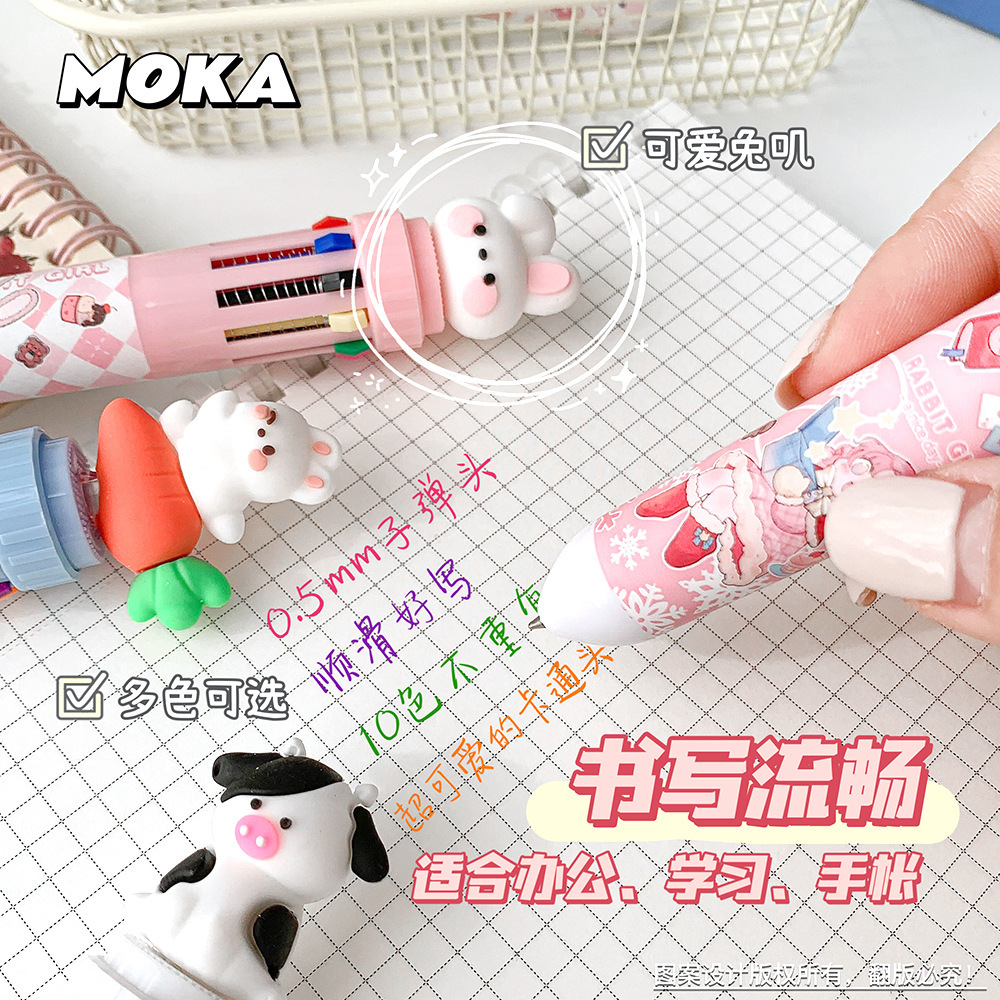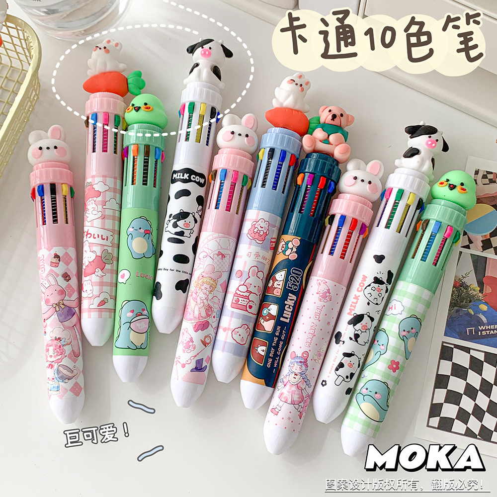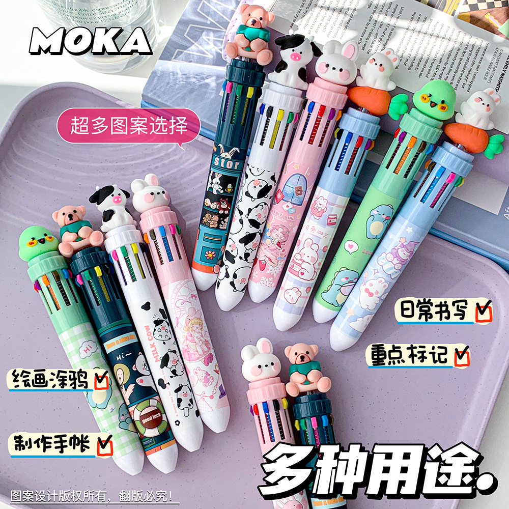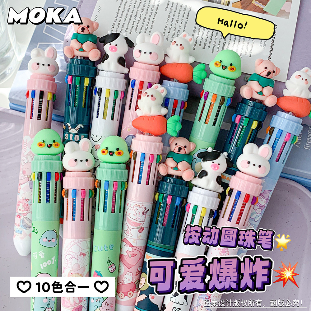 MOKA 동물 만화 머리 10 색 펜 여자 학생 프레스 볼펜 귀여운 동물 머리 총알 볼펜