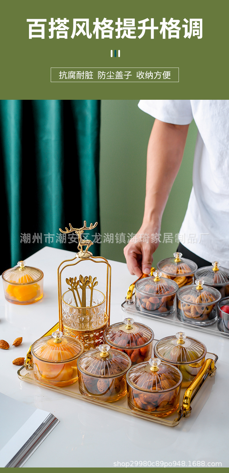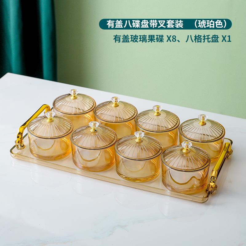 • 앰버 트레이 + 8 접시 유리 + 8 뚜껑 + 엘크 포크 항아리