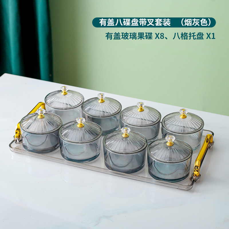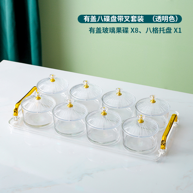 • 투명 트레이 + 접시 유리 8 개 + 뚜껑 8 개 + 엘크 포크 병