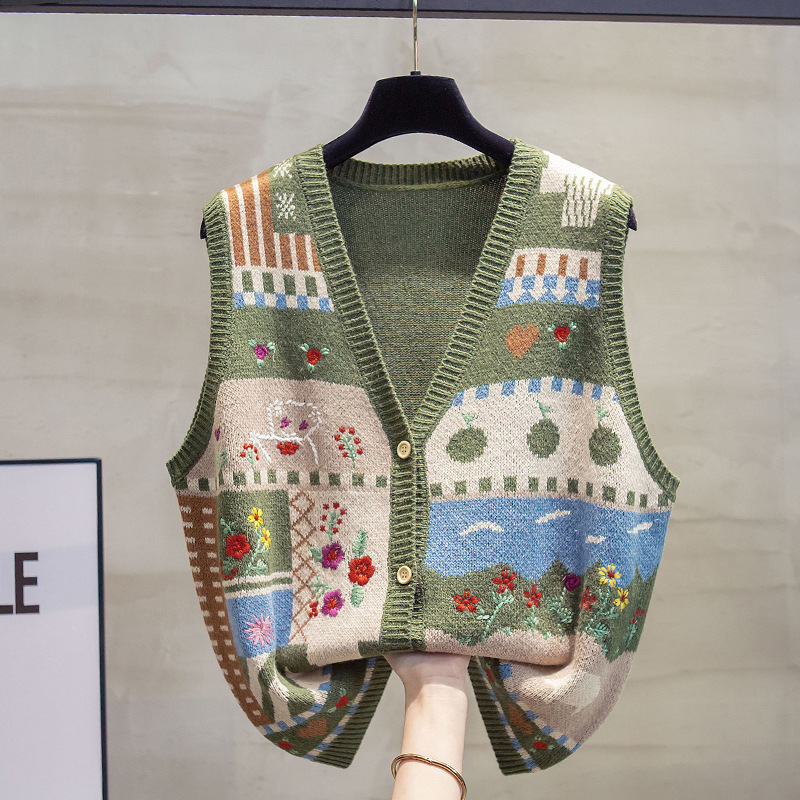 V 넥 니트 카디건 조끼 여성 2025 가을 새로운 느슨한 외부 조끼 낙서 스웨터 양복 조끼 유행스토어 가기