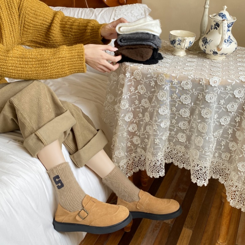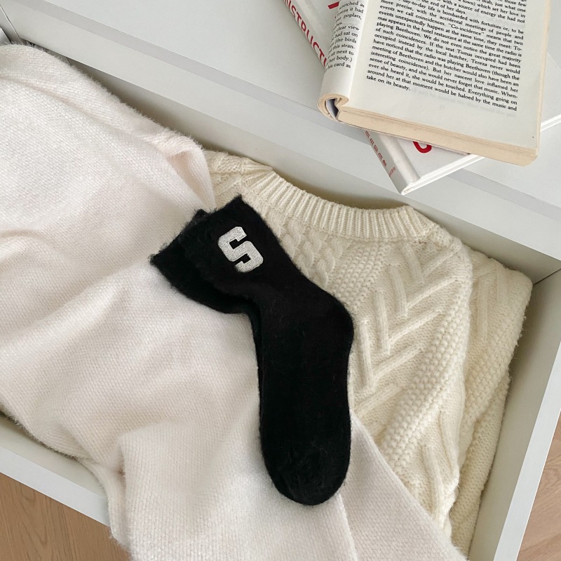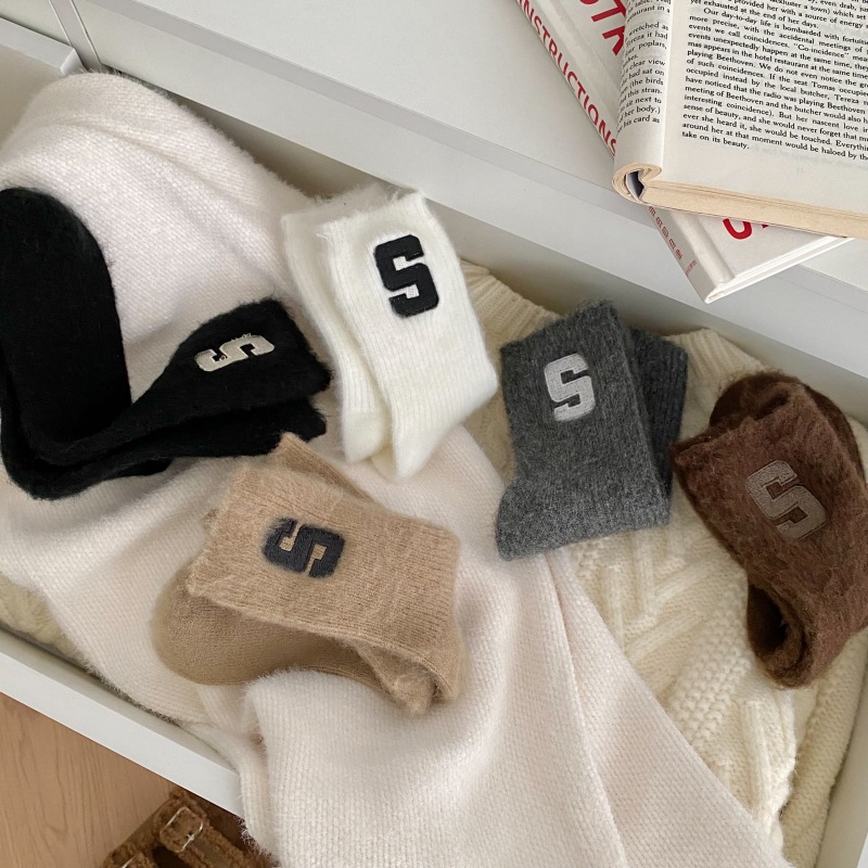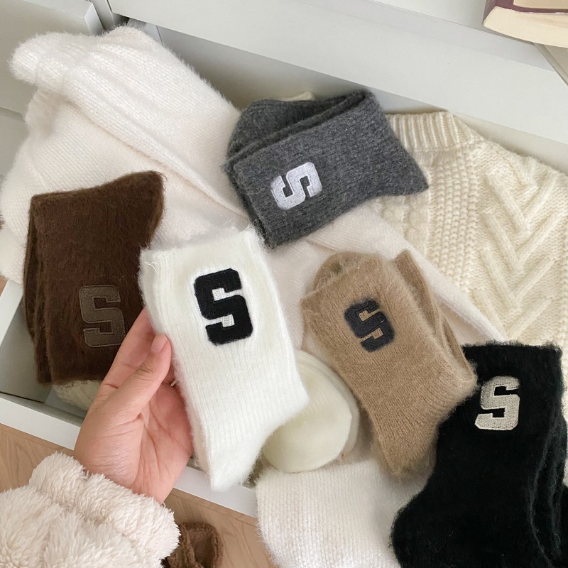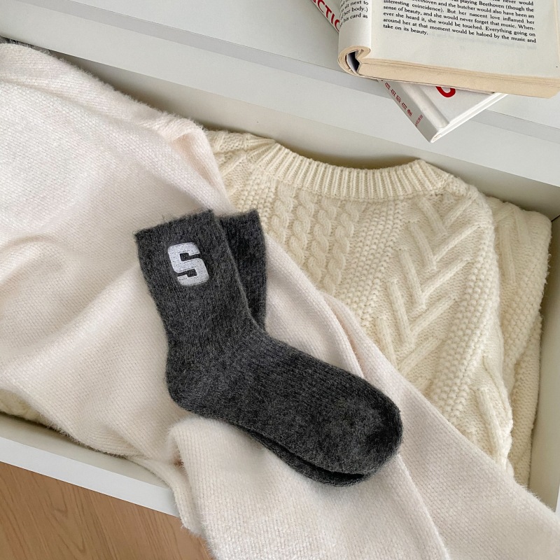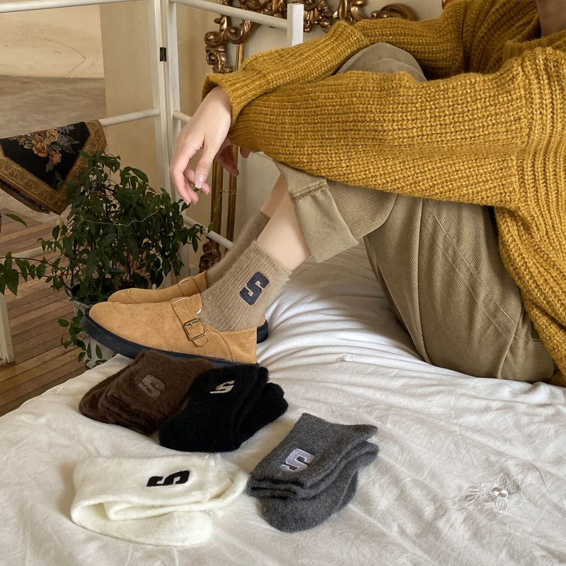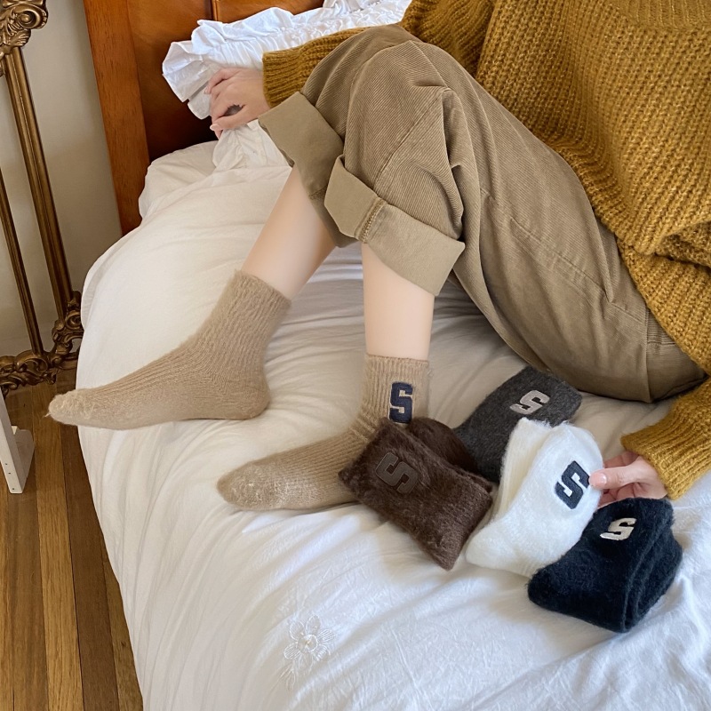 따뜻한 벨벳 울 S 자수 컬러 스크럽 여성 양말 문자 개인화 된 스포츠 중간 길이 양말 유행 의상 상어 바지