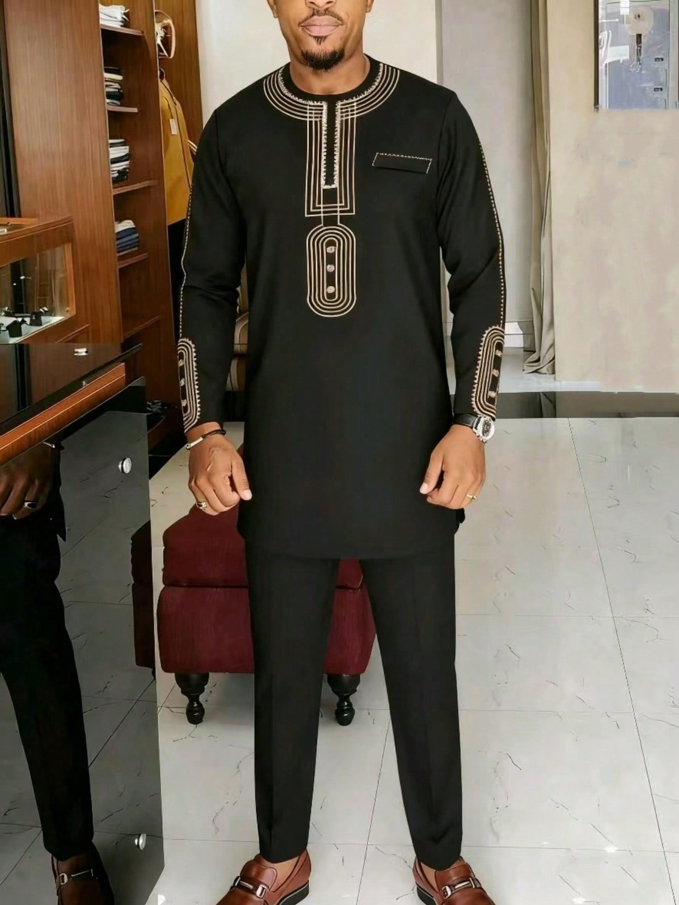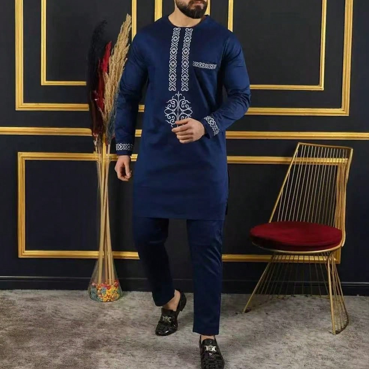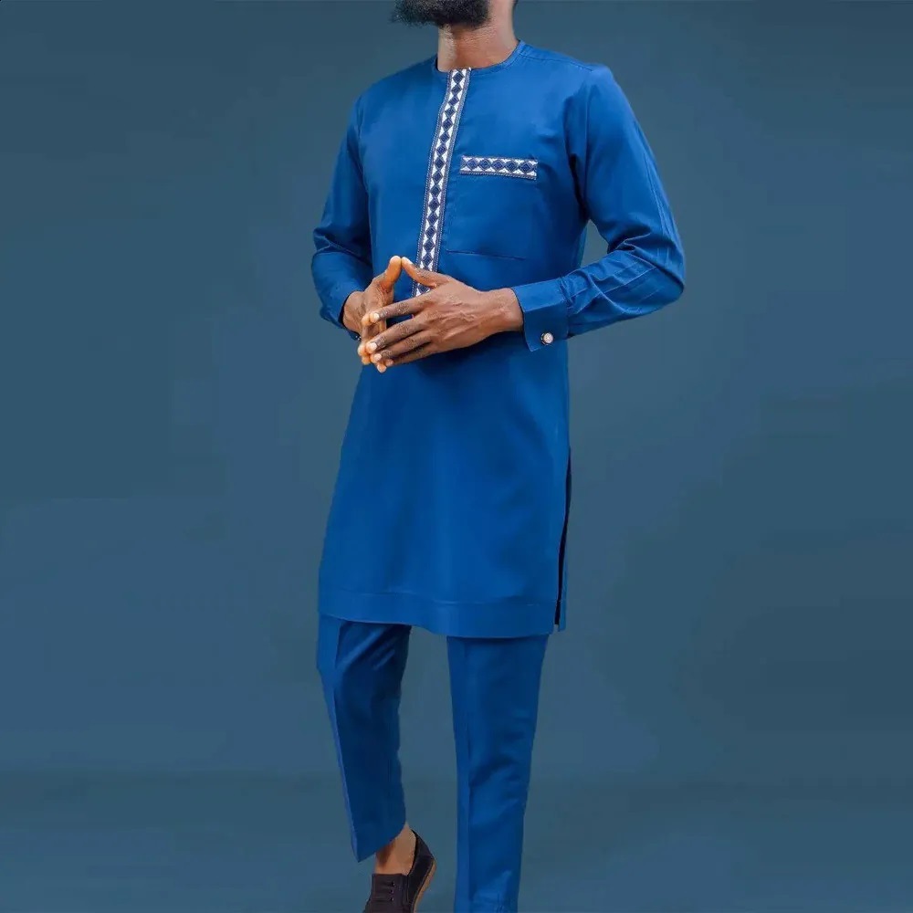 2023 아프리카 에스닉 스타일 남성 캐주얼 세트 2 종 세트 긴 소매 단색 스티치 셔츠와 바지 세트
