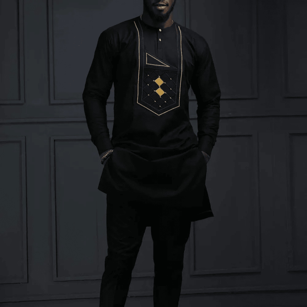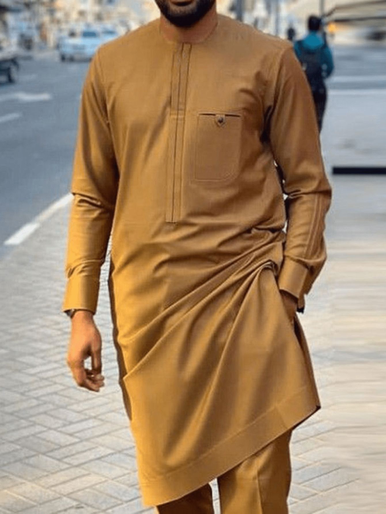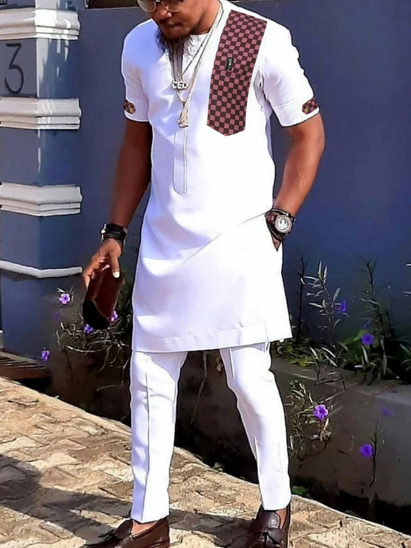 2023 아프리카 에스닉 스타일 남성 캐주얼 세트 2 종 세트 긴 소매 단색 스티치 셔츠와 바지 세트