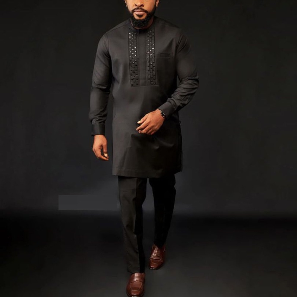 2023 아프리카 에스닉 스타일 남성 캐주얼 세트 2 종 세트 긴 소매 단색 스티치 셔츠와 바지 세트스토어 가기