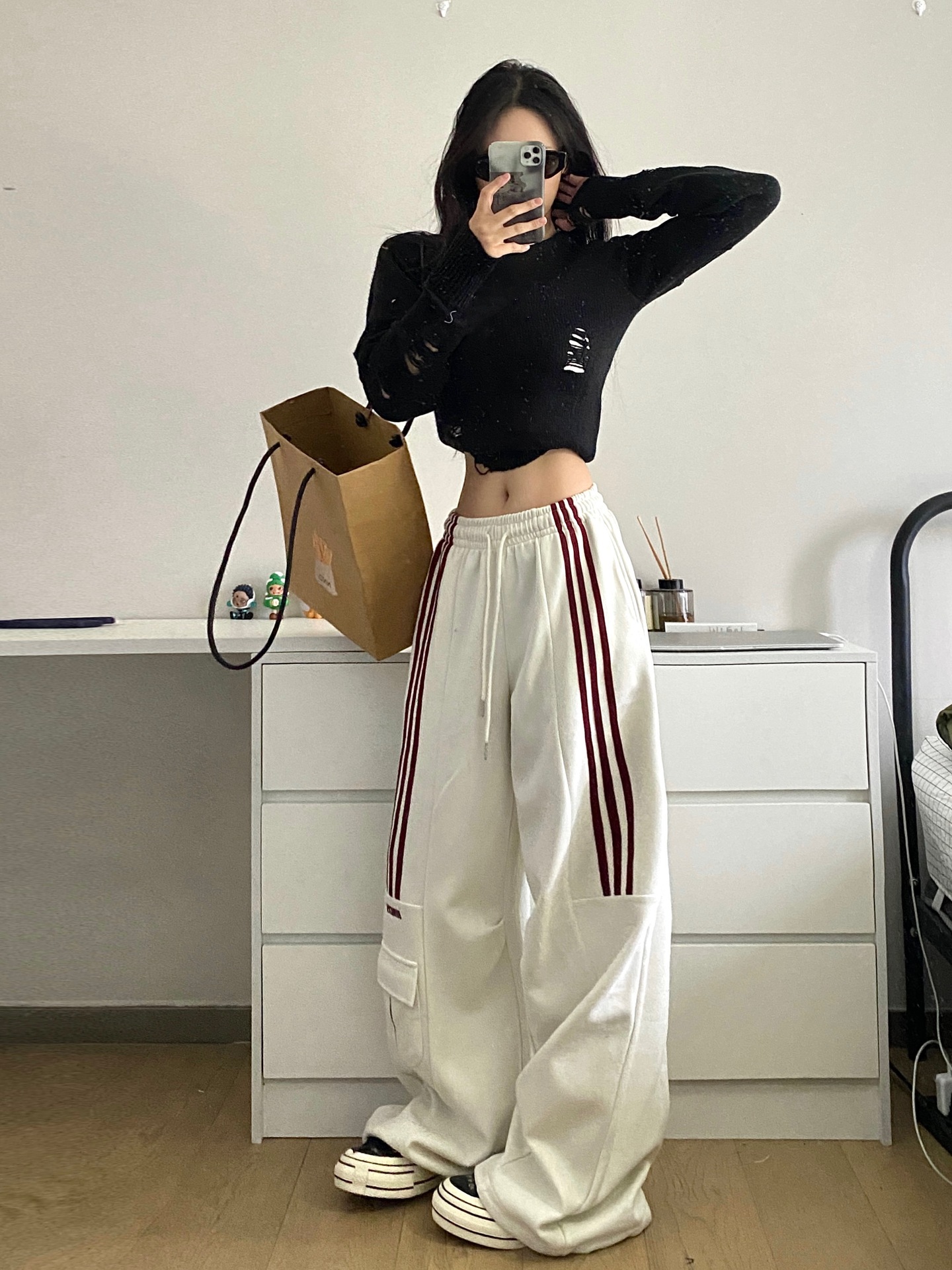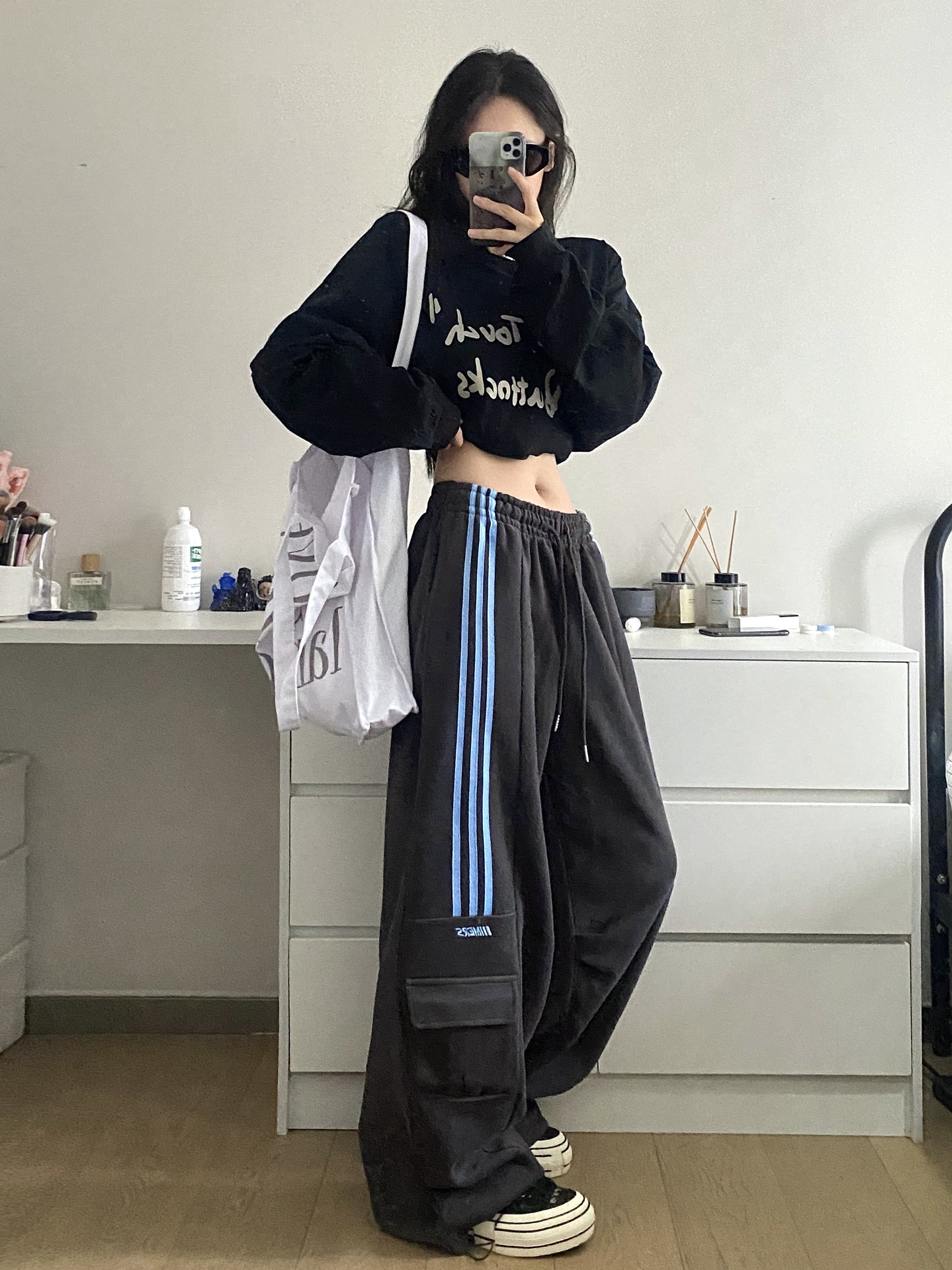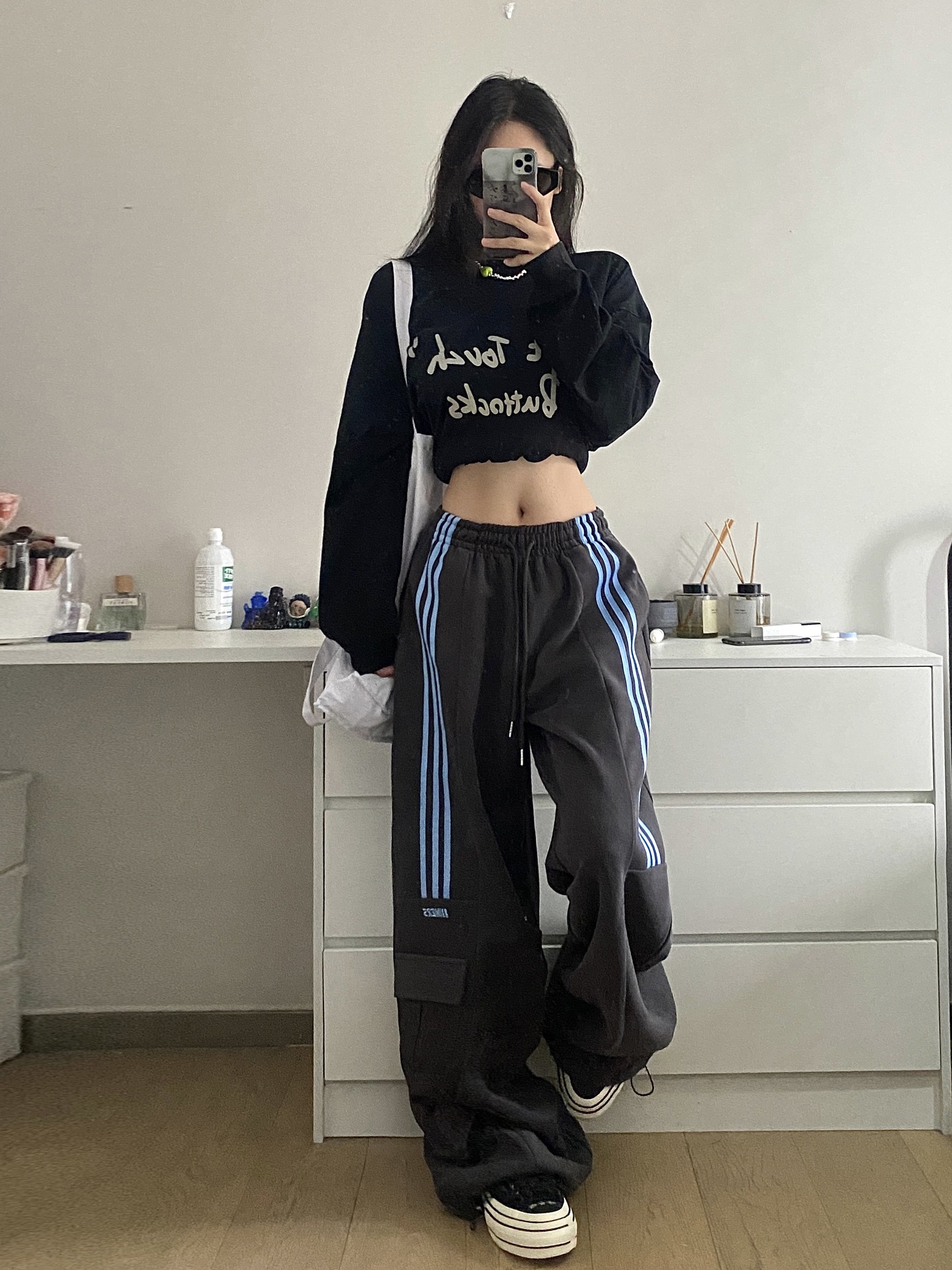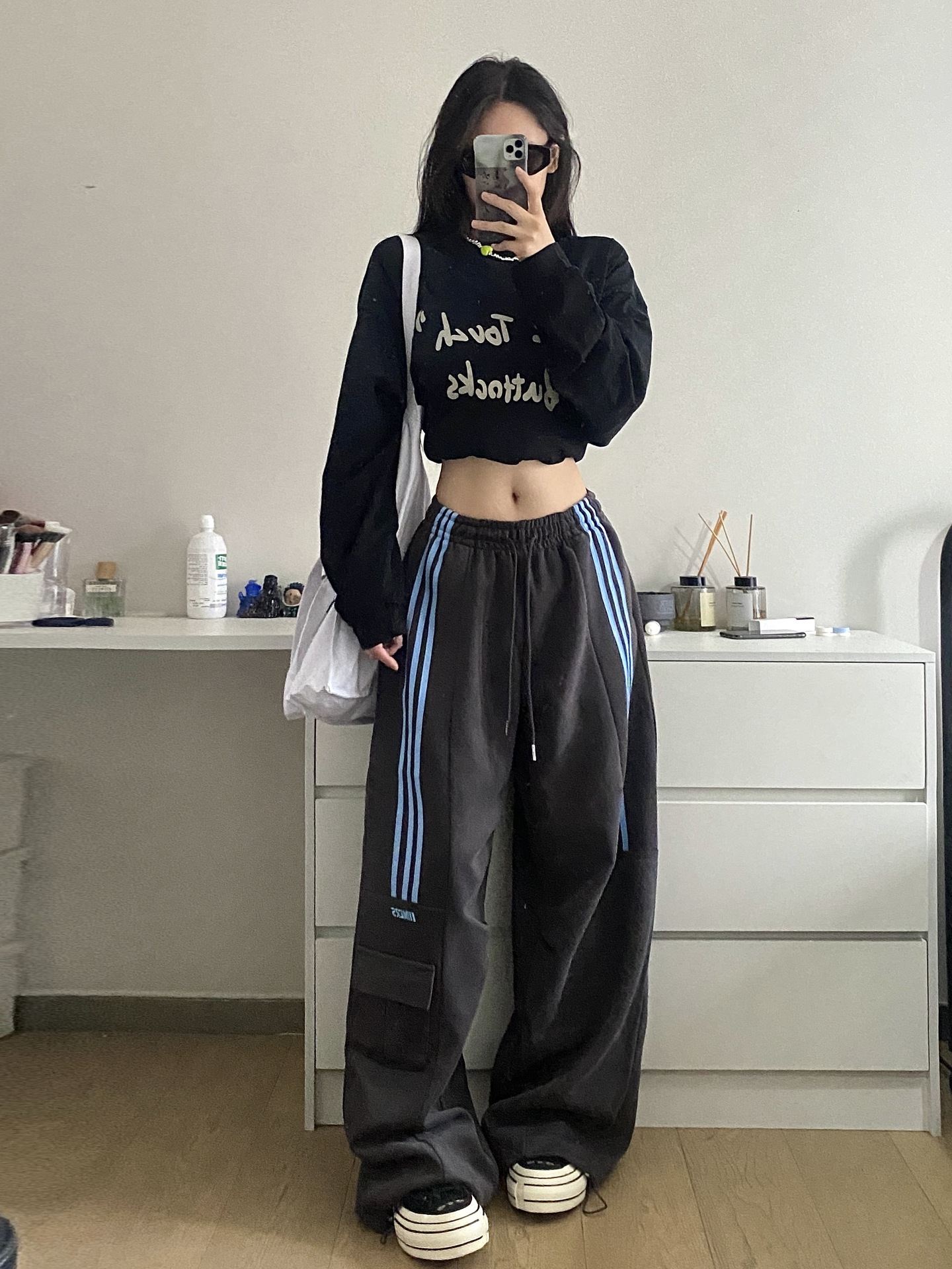 아메리칸 스타일 레트로 힙합 드로스트링 와이드 팬츠 여성용 하이 웨이스트 루즈한 캐주얼 스포츠 스트레이트 팬츠 스트리트 댄스 트렌디 팬츠스토어 가기
