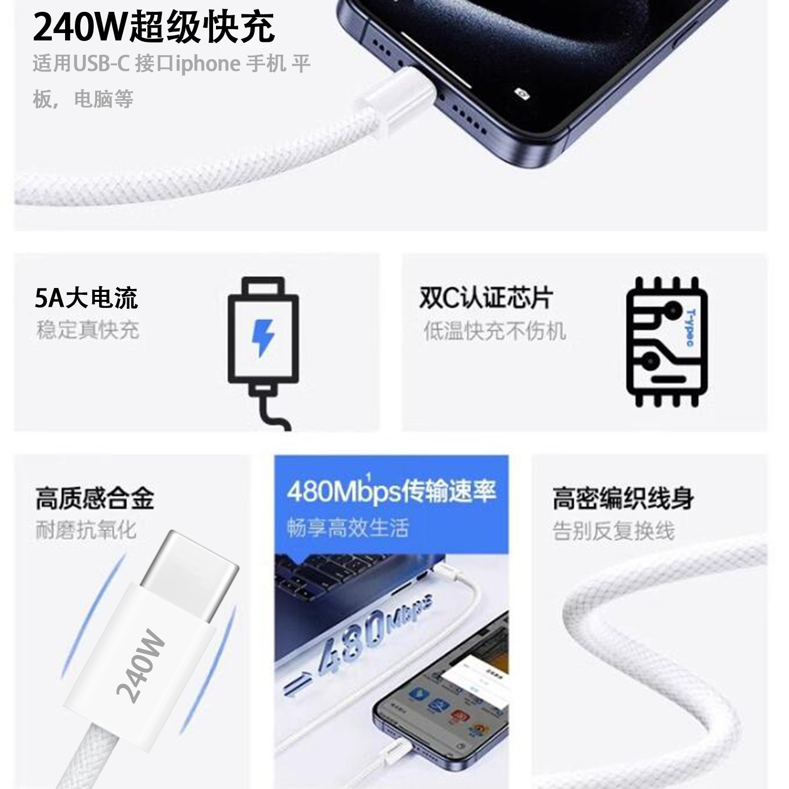 240W 초고속 충전 브레이드 네트워크 듀얼 타입-C 데이터 케이블, 애플, 화웨이, 샤오미 충전 케이블에 적합, 두꺼운 타입