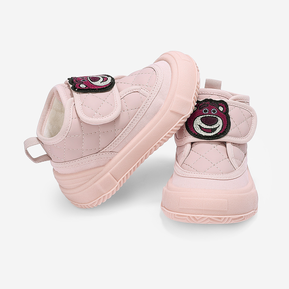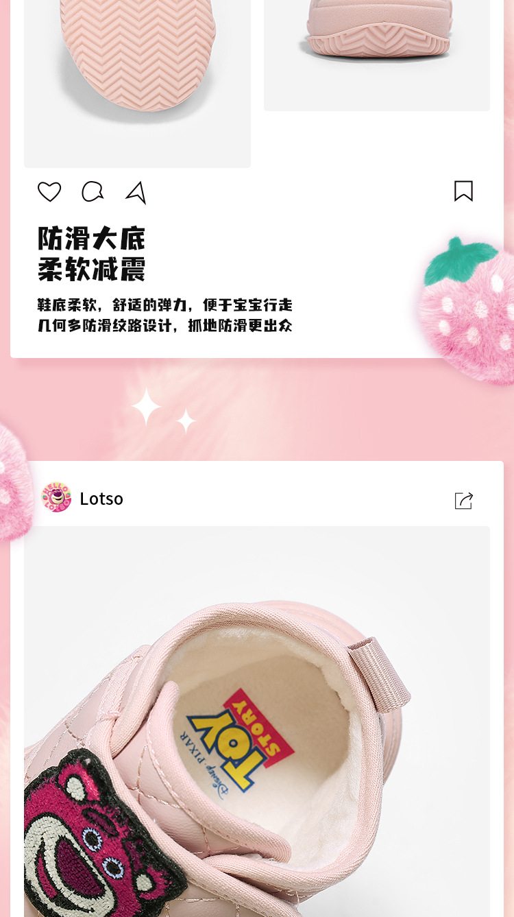 디즈니 2 면 아기 신발 2023 겨울 새로운 기모 딸기 곰 면화 신발 실내 부드러운 바닥 기모 유아 신발