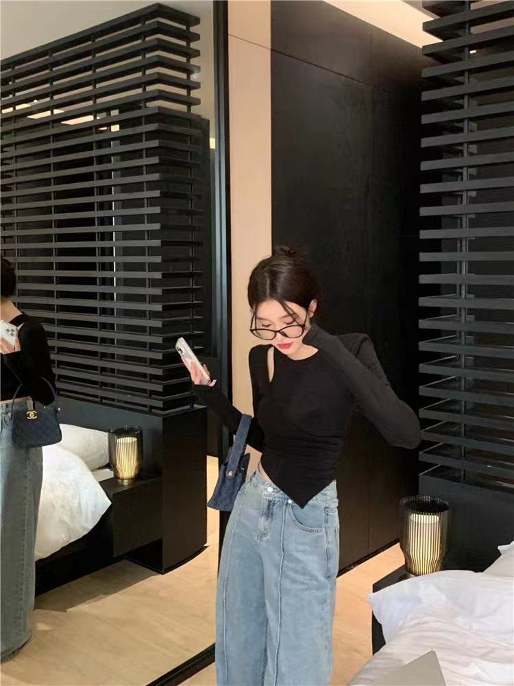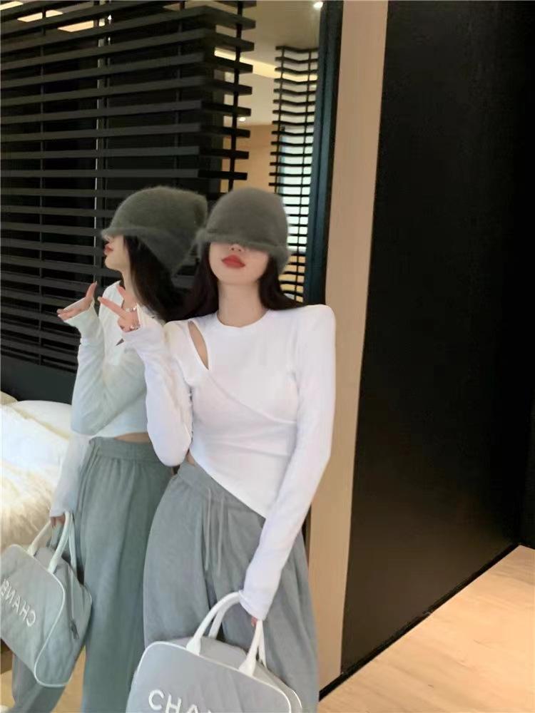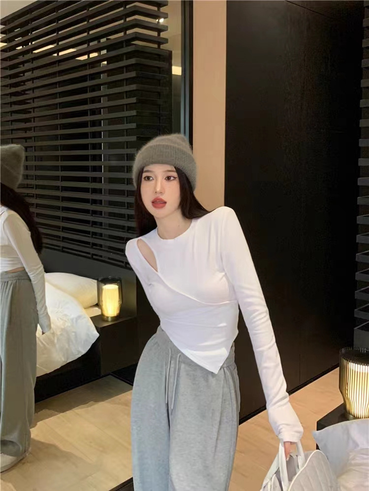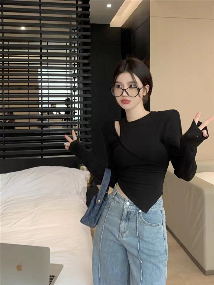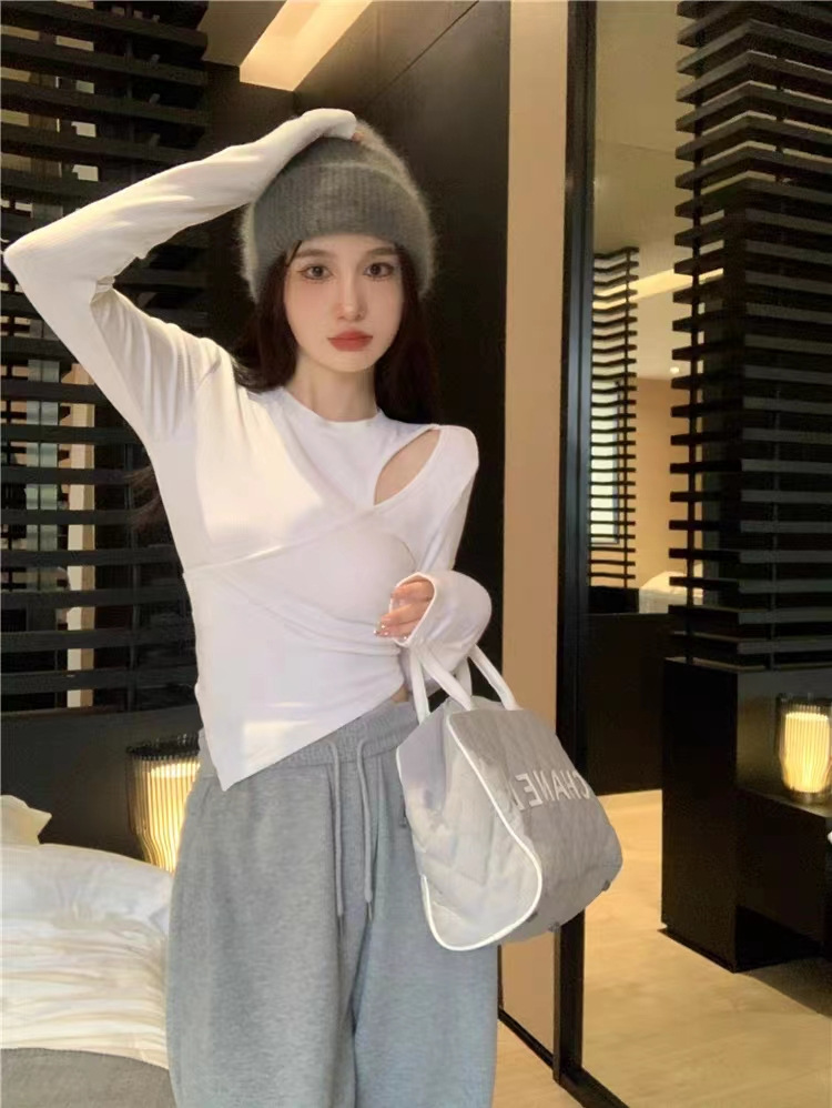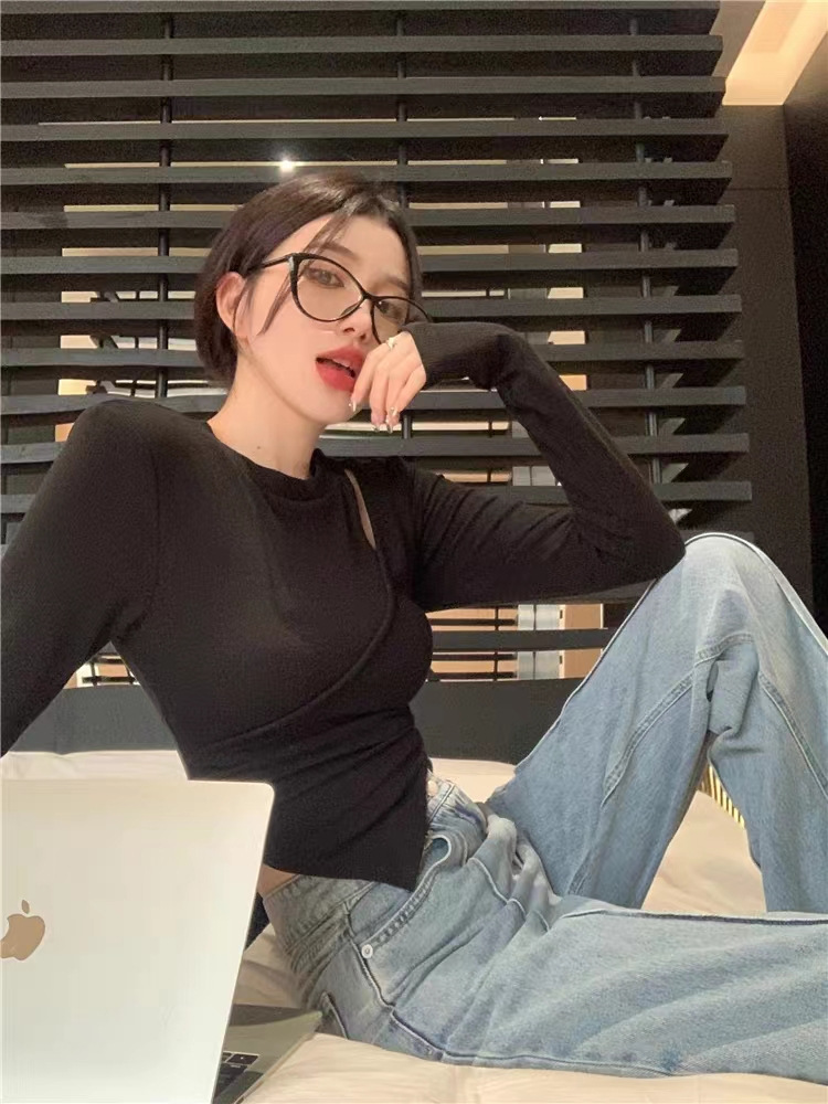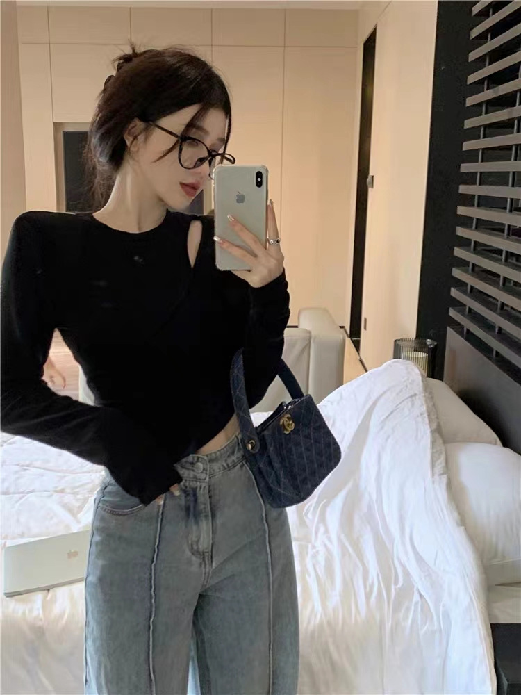 여성 실 벨벳 긴팔 티셔츠 봄과 가을 불규칙한 크로스 슬림 허리 속이 빈 쇼트 탑스토어 가기
