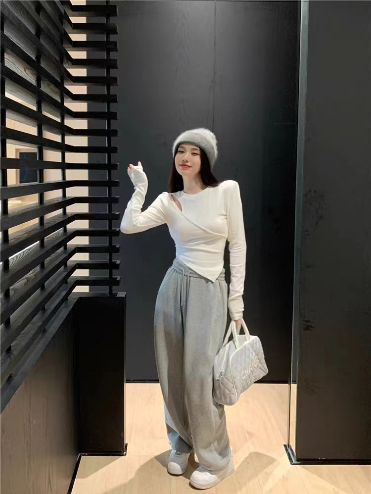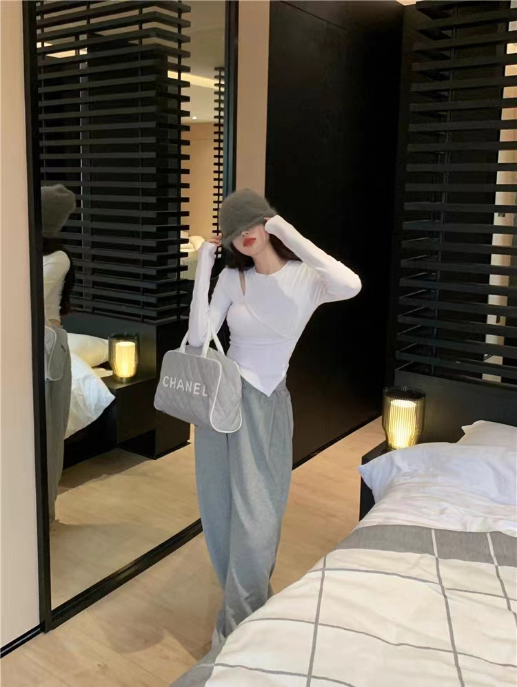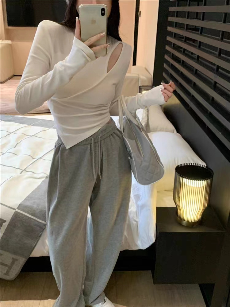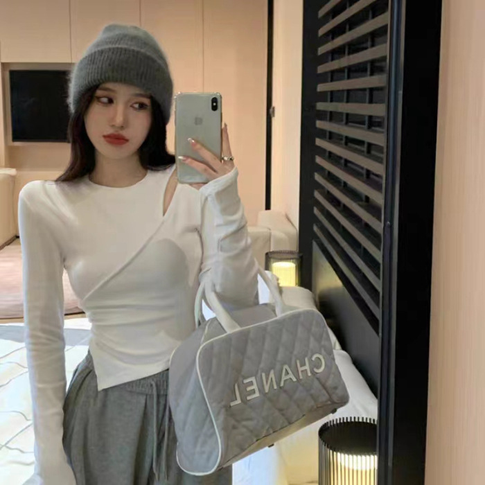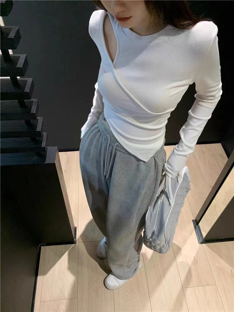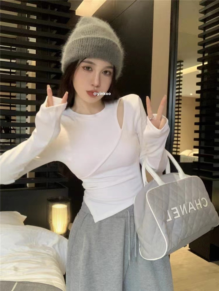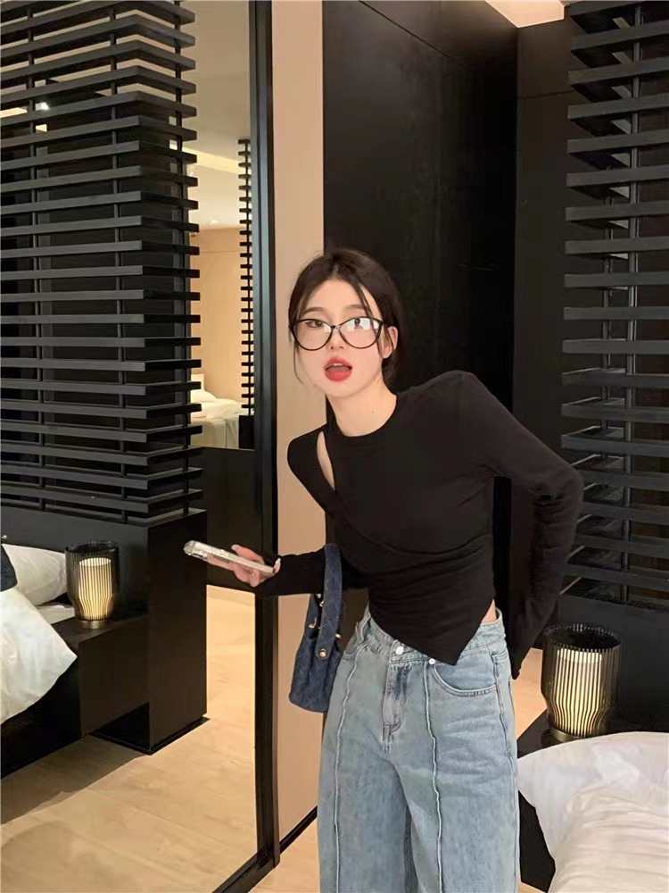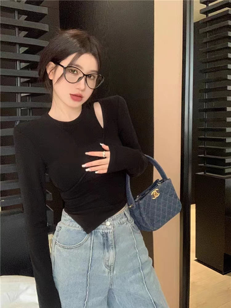 여성 실 벨벳 긴팔 티셔츠 봄과 가을 불규칙한 크로스 슬림 허리 속이 빈 쇼트 탑스토어 가기