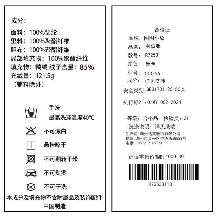 温馨提示:羽绒服分双版本,手臂贴标不同,随机发货哦~