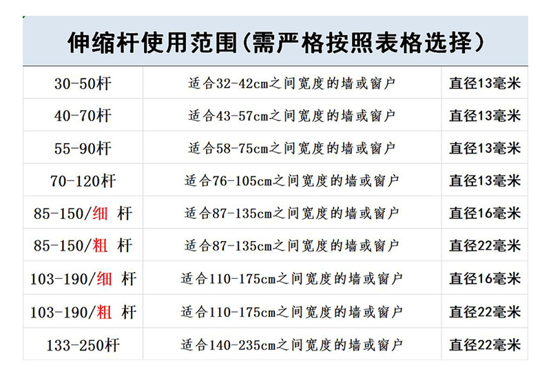 • 85-150 막대 (두꺼운) 85-150 막대 (두꺼운) 는 87-135 cm에 맞습니다.