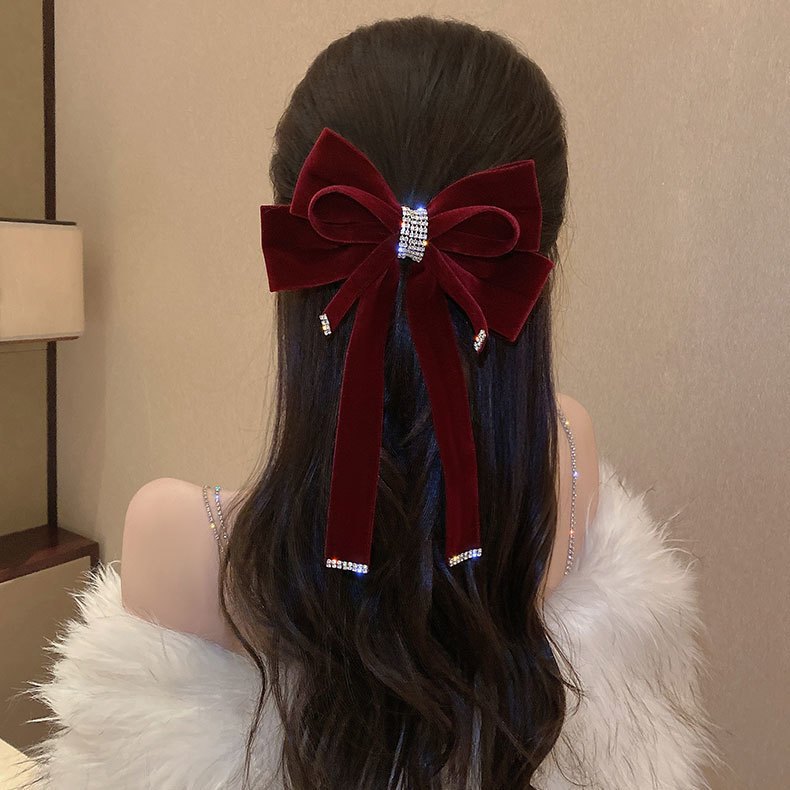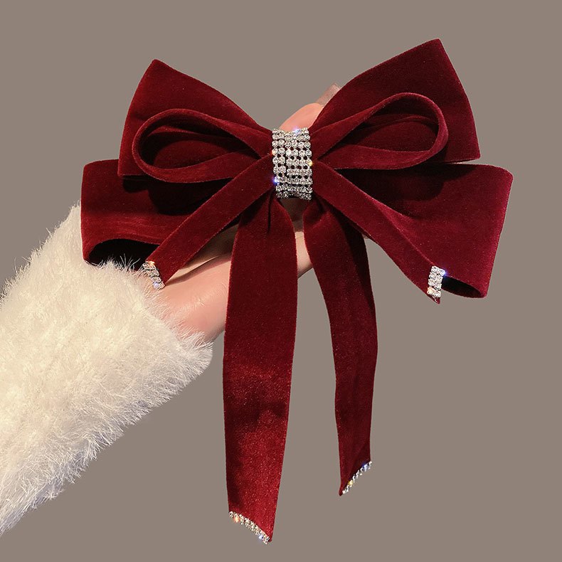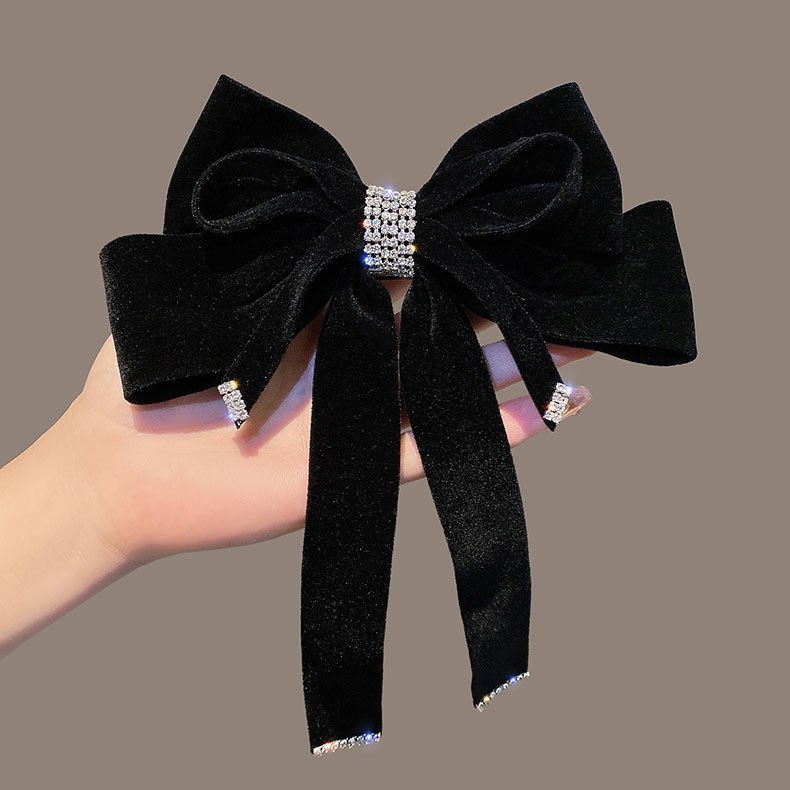 일본과 한국 스타일의 가벼운 럭셔리 플래시 다이아몬드 하이 엔드 보우 술 벨벳 헤어핀 여성의 가을 겨울 머리 머리 액세서리 탑 클립 새로운 패션스토어 가기