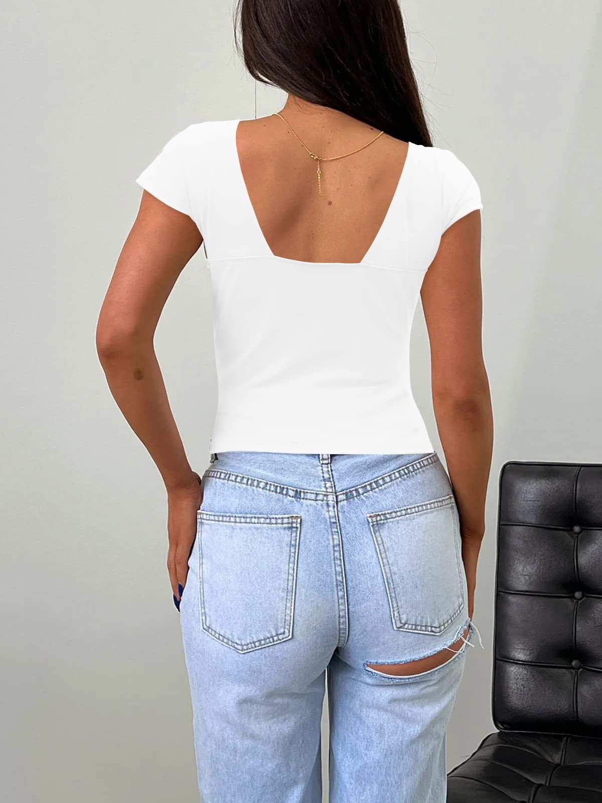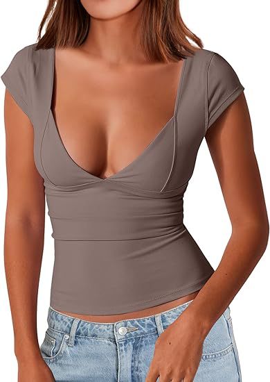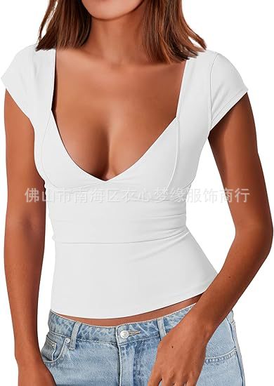 아마존 크로스 보더 패션 여왕 여성의 섹시한 깊은 V-넥 등이없는 탑 짧은 소매 슬림 티셔츠 기본스토어 가기