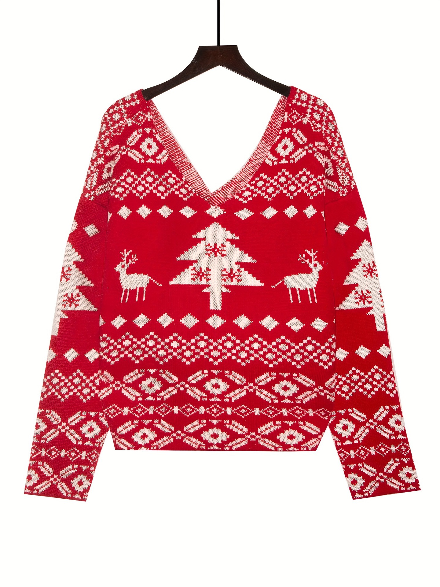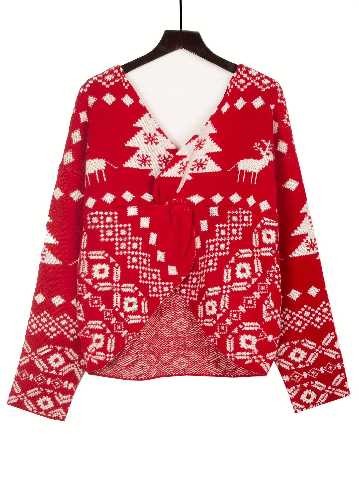 V 넥 양면 불규칙한 블라우스 스웨터 등이없는 스트랩없는 크리스마스 눈송이 패턴 긴 소매 여성용 양모 탑