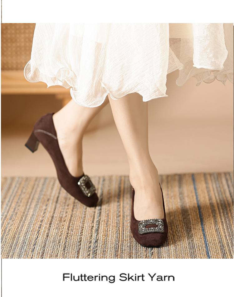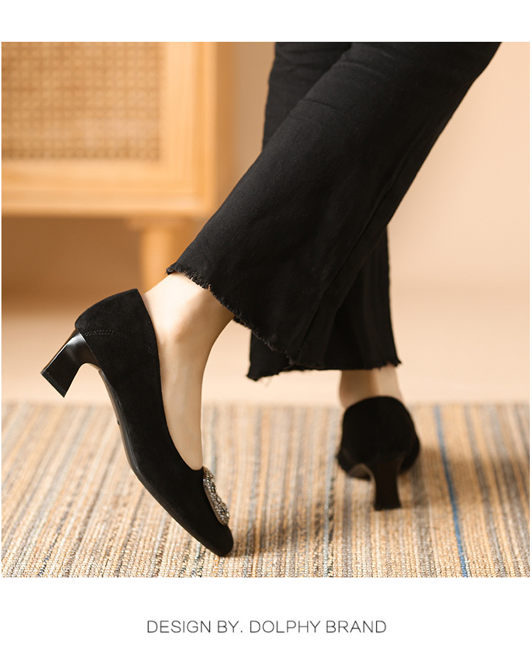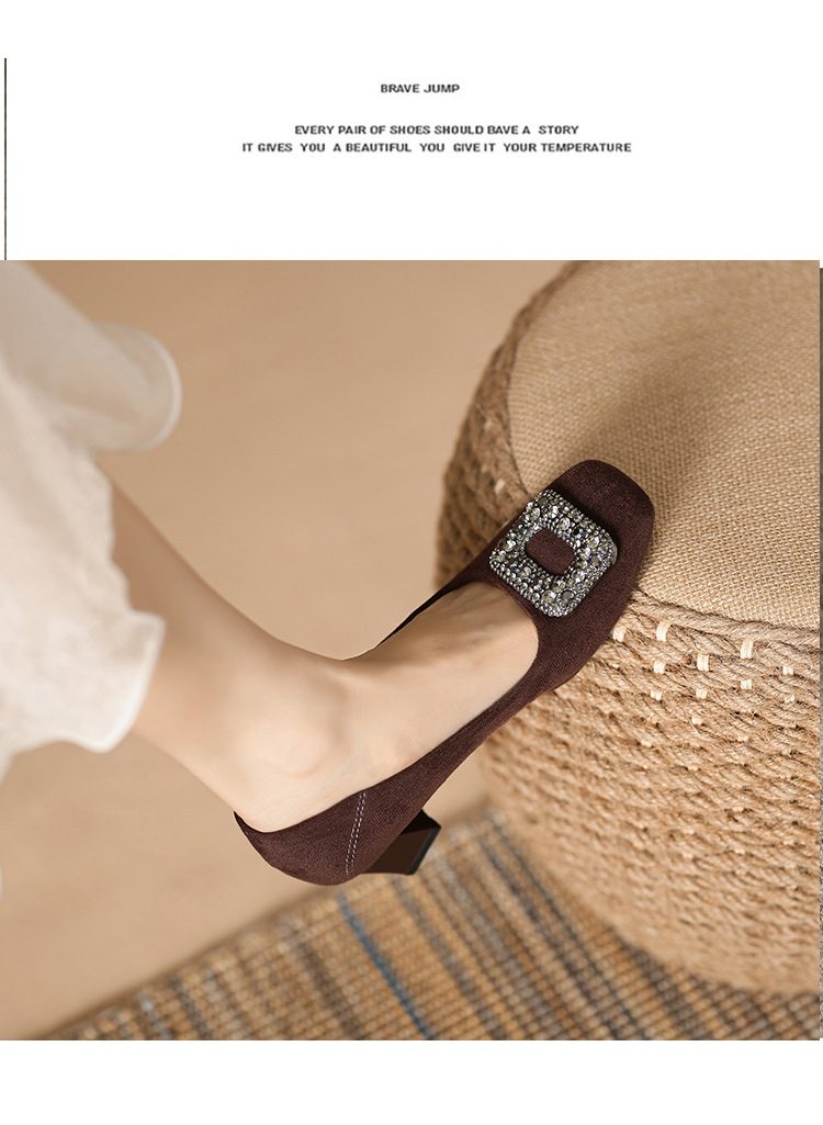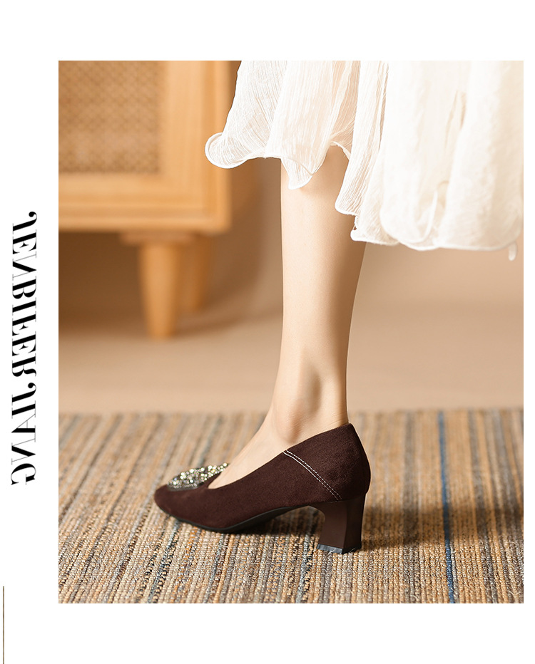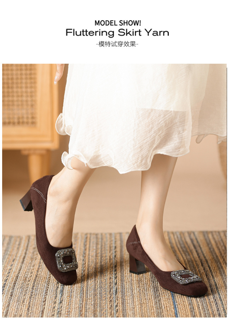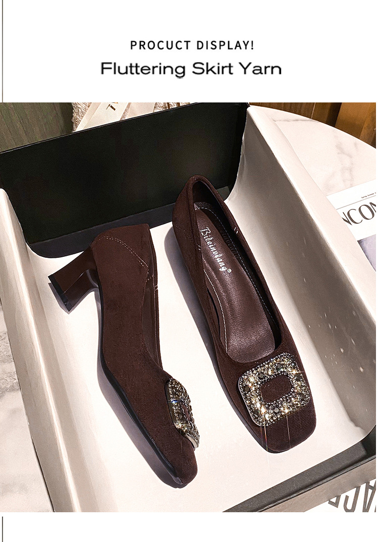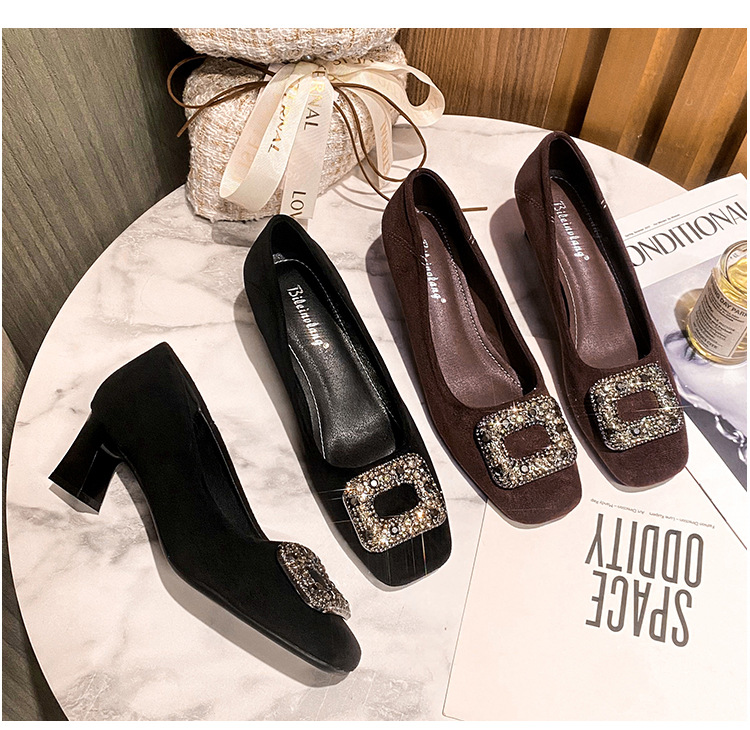 새로운 봄과 가을 스퀘어 헤드 로우 힐 신발 여성 통근 여성 신발 얕은 입 라인 석 스퀘어 버클 피곤하지 않은 발 두꺼운 굽 신발