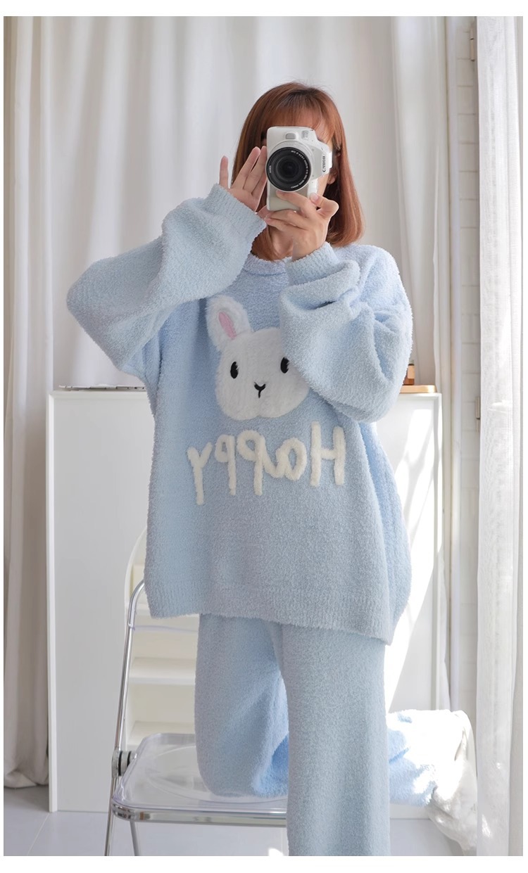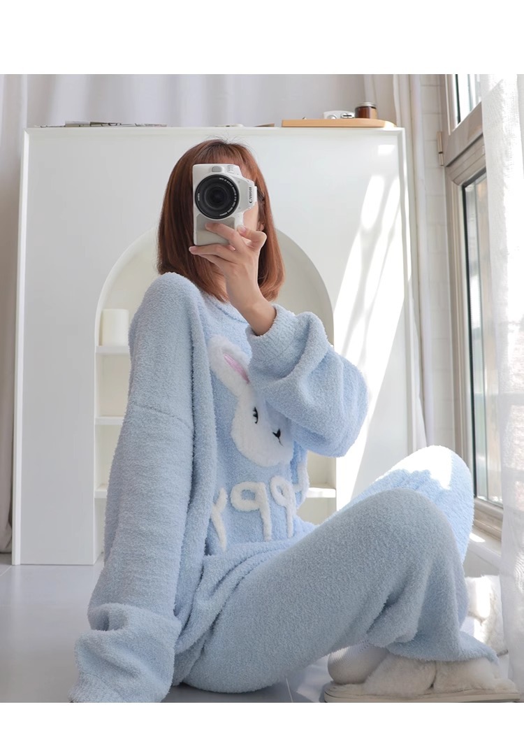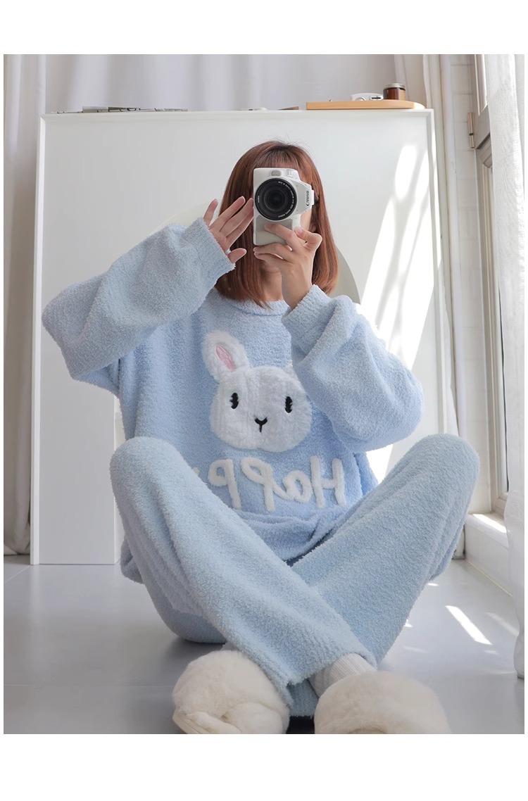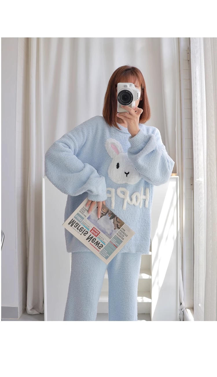 잠옷 여자의 겨울 귀여운 토끼 따뜻한 두꺼운 기모 느슨한 겨울 아웃웨어 산호 양털 가정 옷 세트
