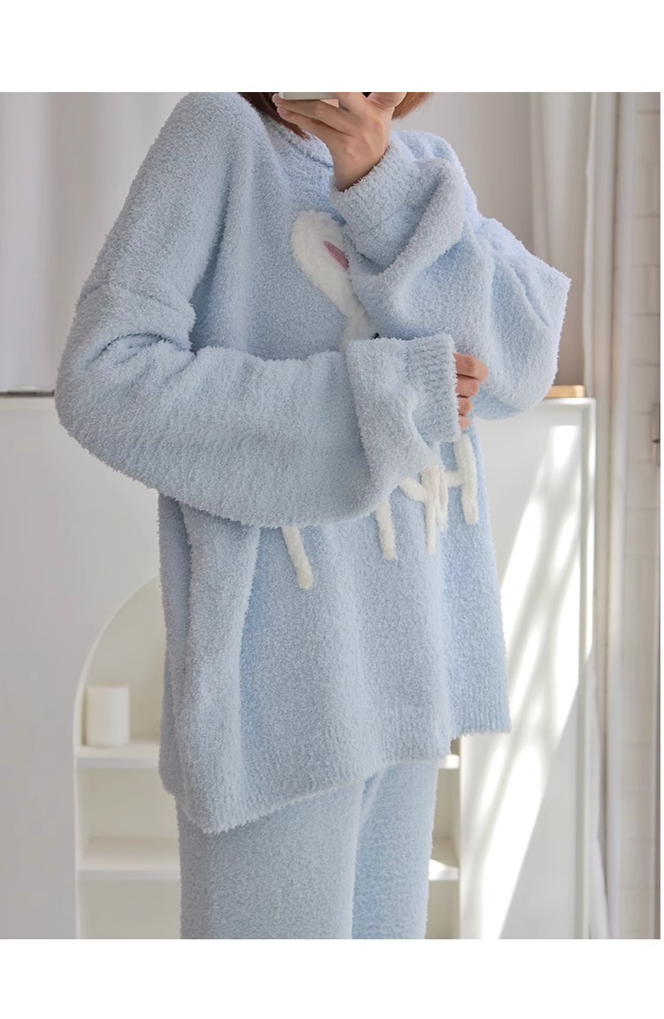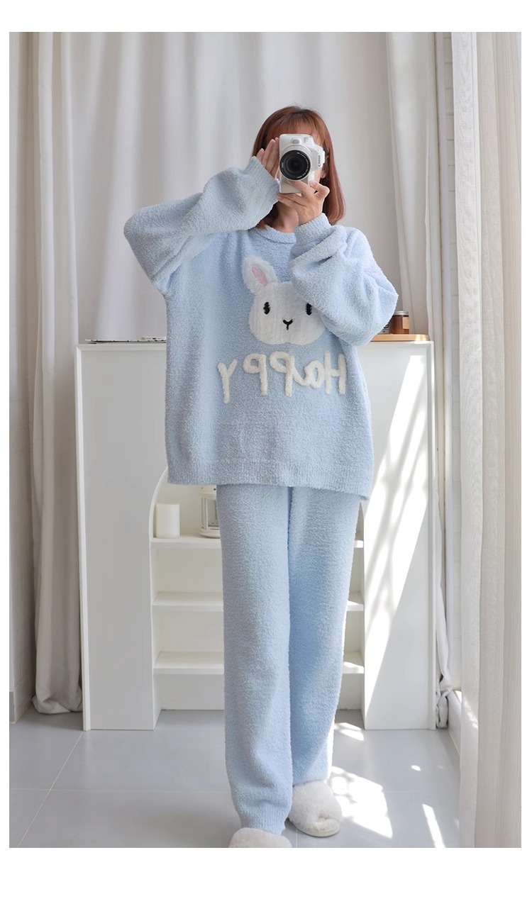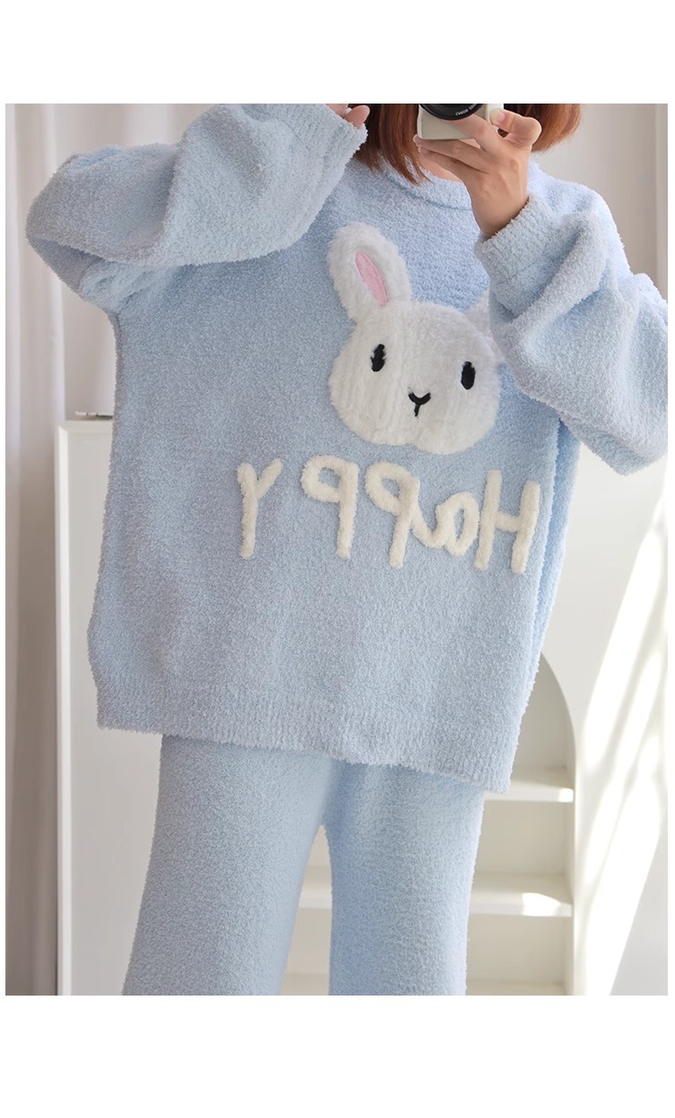 잠옷 여자의 겨울 귀여운 토끼 따뜻한 두꺼운 기모 느슨한 겨울 아웃웨어 산호 양털 가정 옷 세트