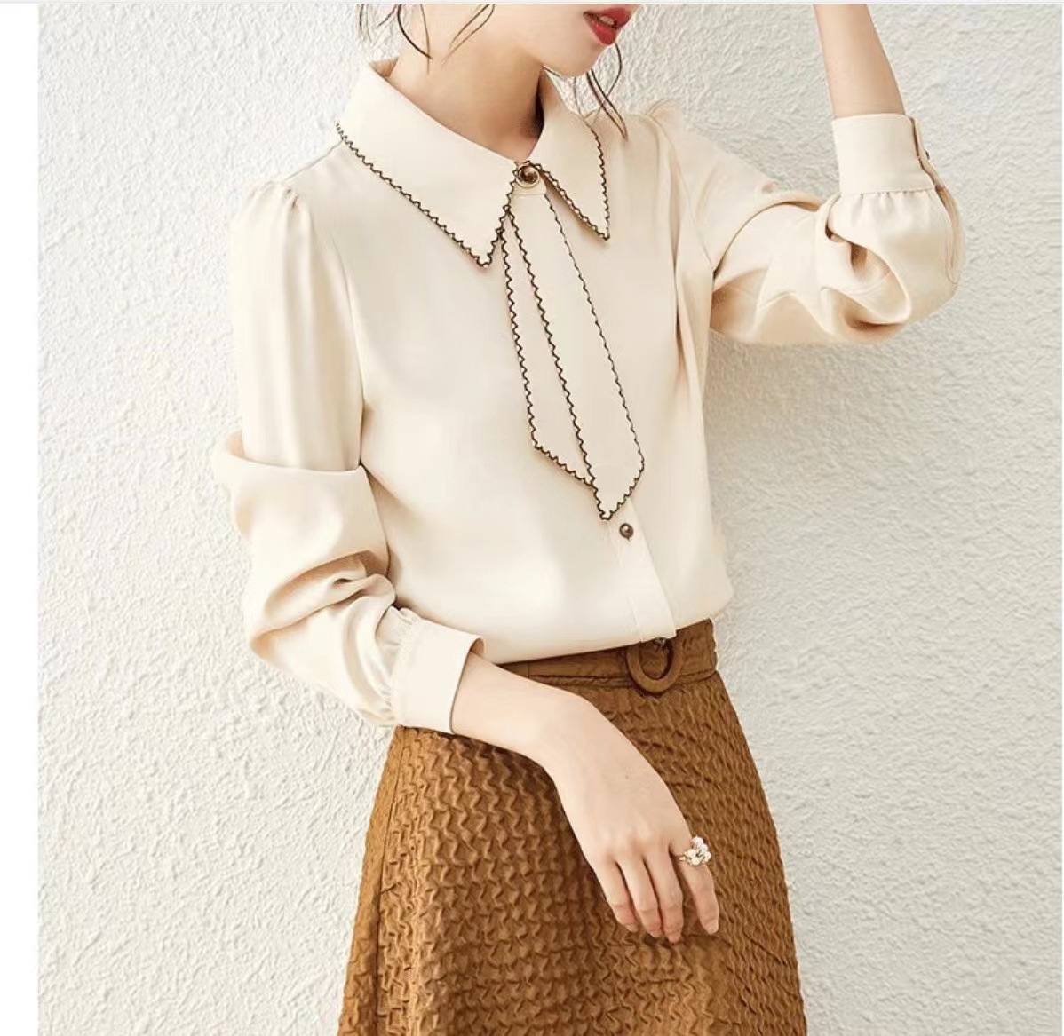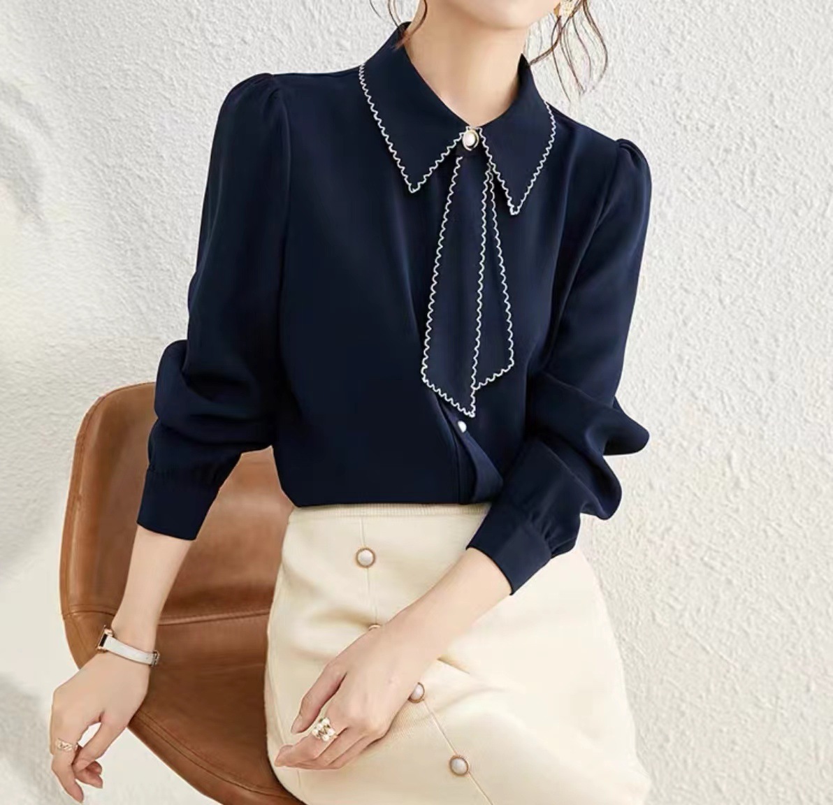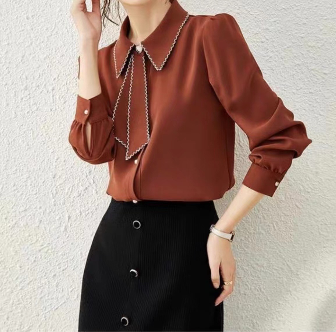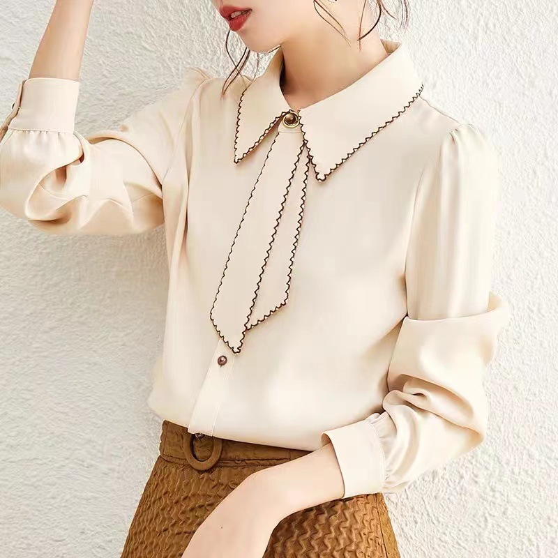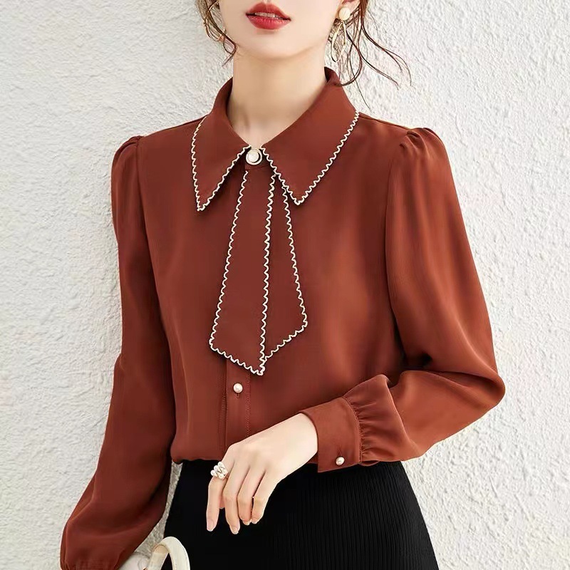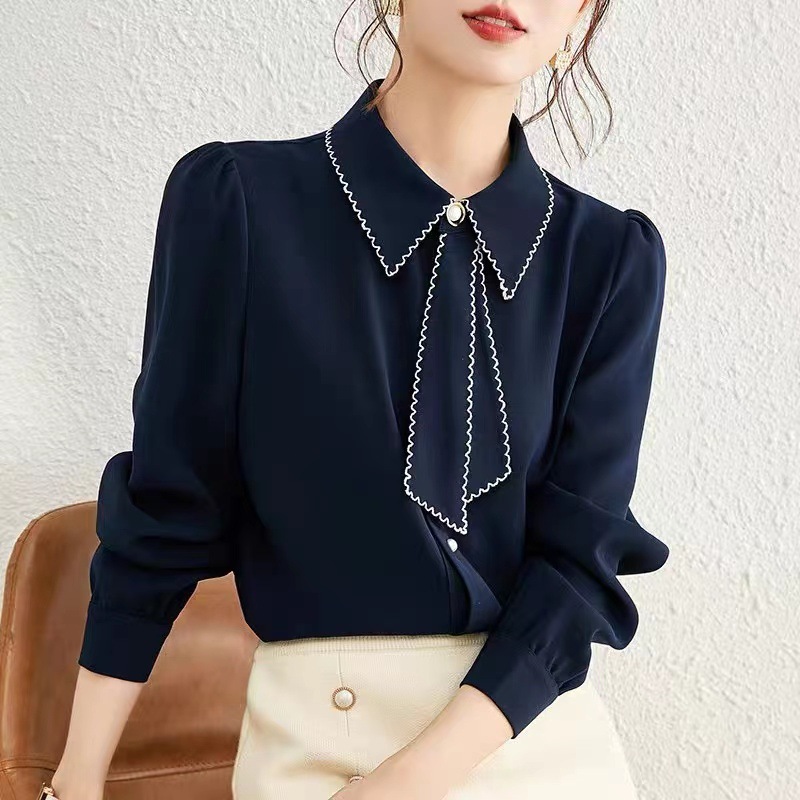 패션 통근 벨트 인형 칼라 셔츠 여성의 봄과 가을 새로운 우아한 틈새 올 매치 쉬폰 긴팔 베이스 탑스토어 가기