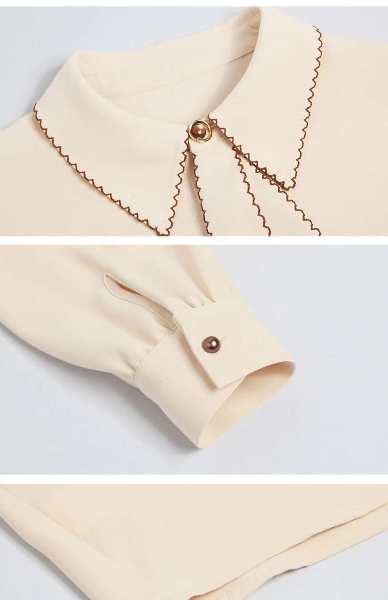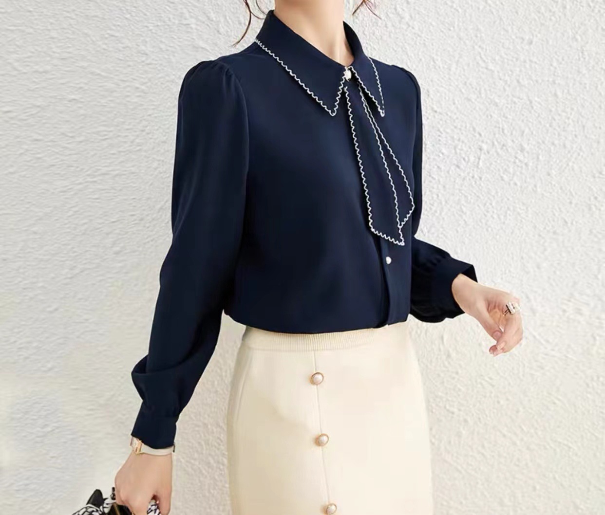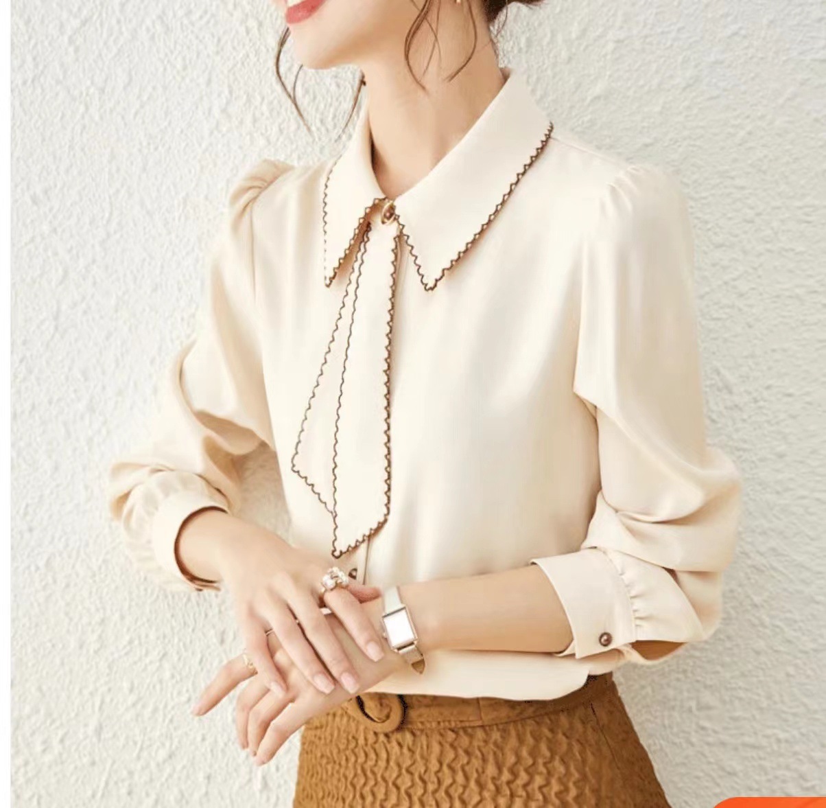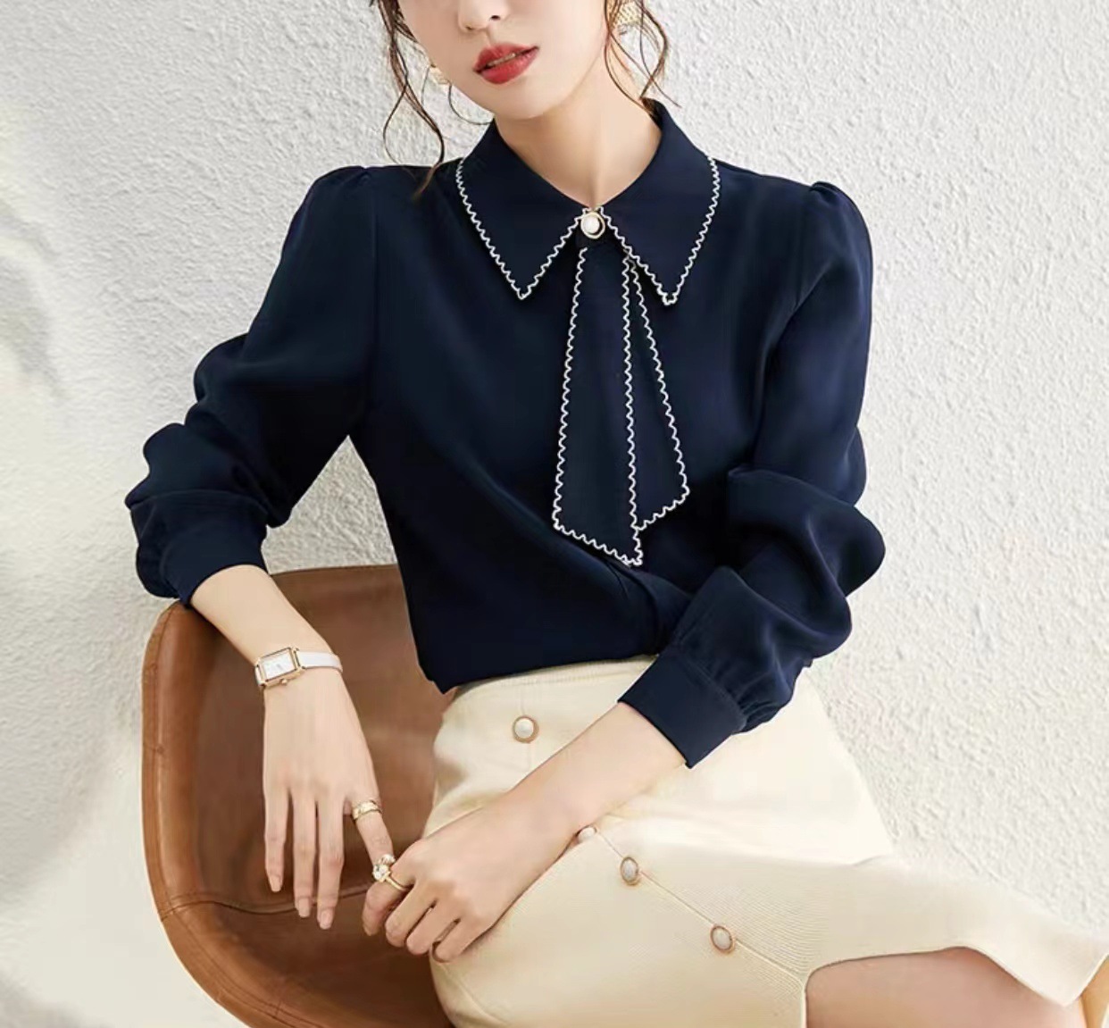 패션 통근 벨트 인형 칼라 셔츠 여성의 봄과 가을 새로운 우아한 틈새 올 매치 쉬폰 긴팔 베이스 탑스토어 가기