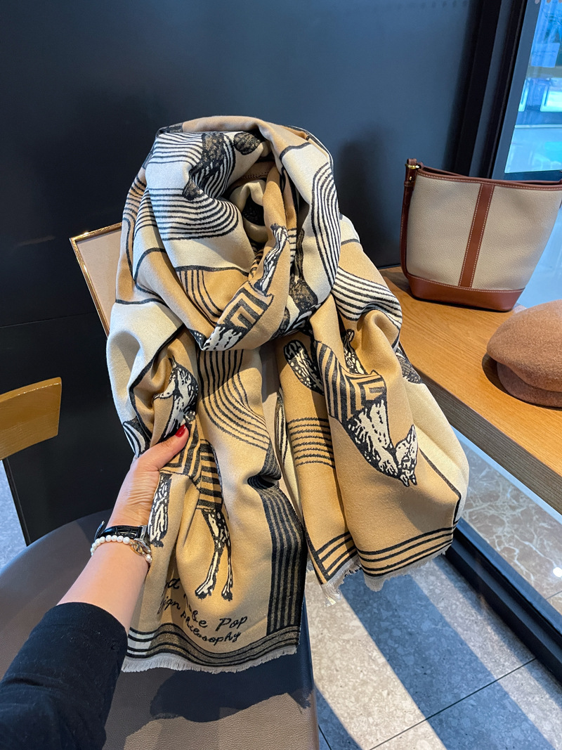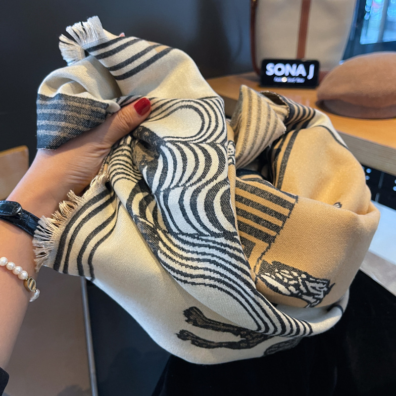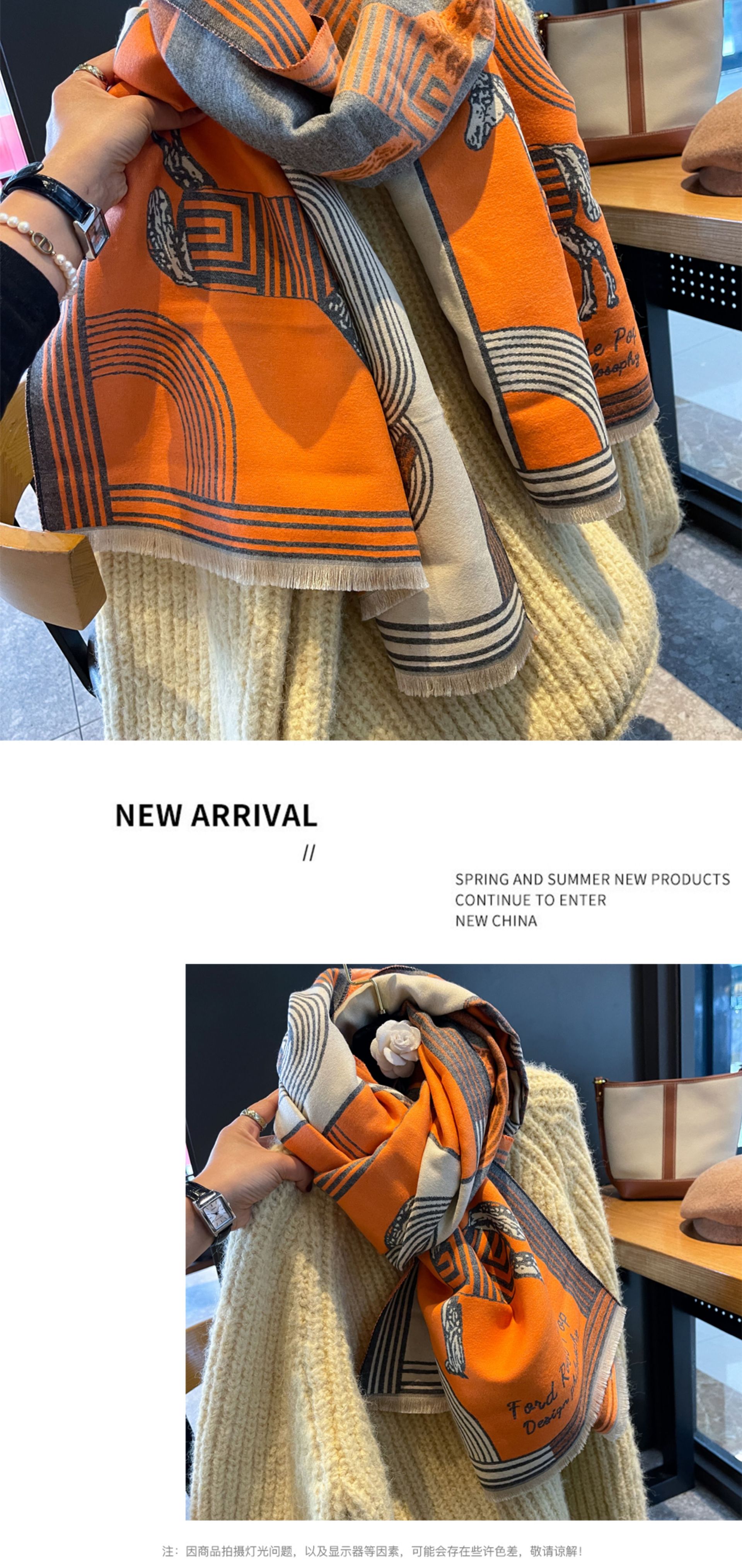 轻奢简约线条骏马厚双面仿羊绒围巾女冬季韩版围脖长款保暖大披肩