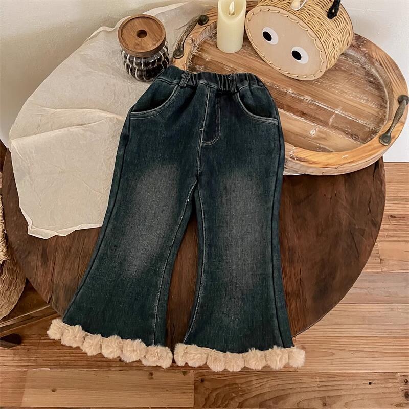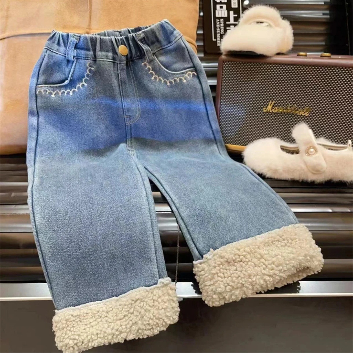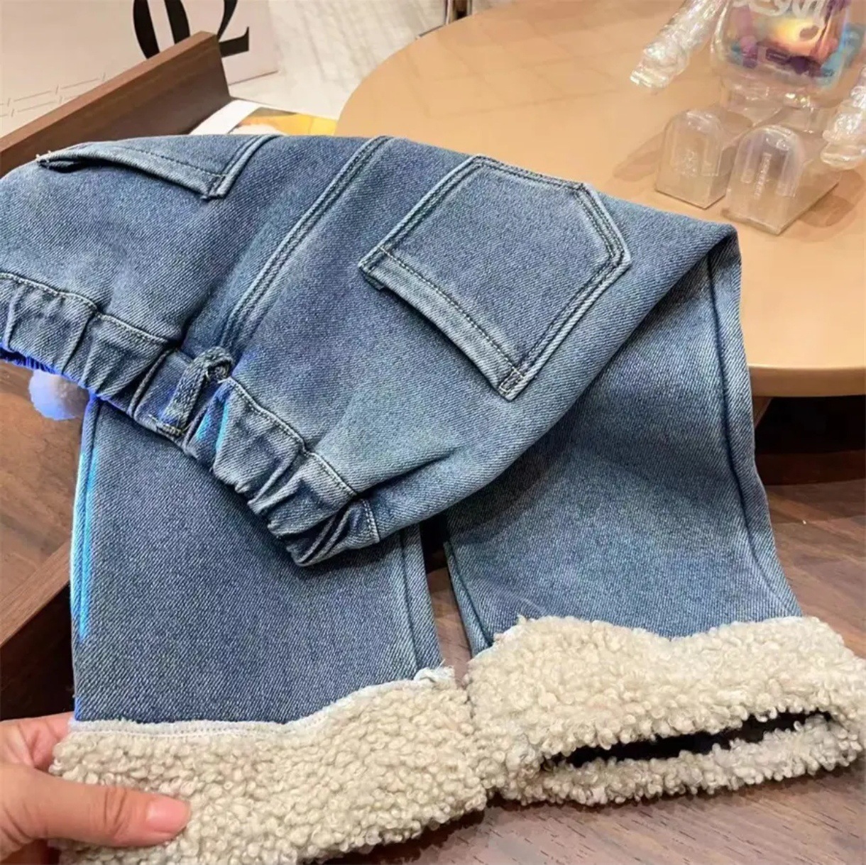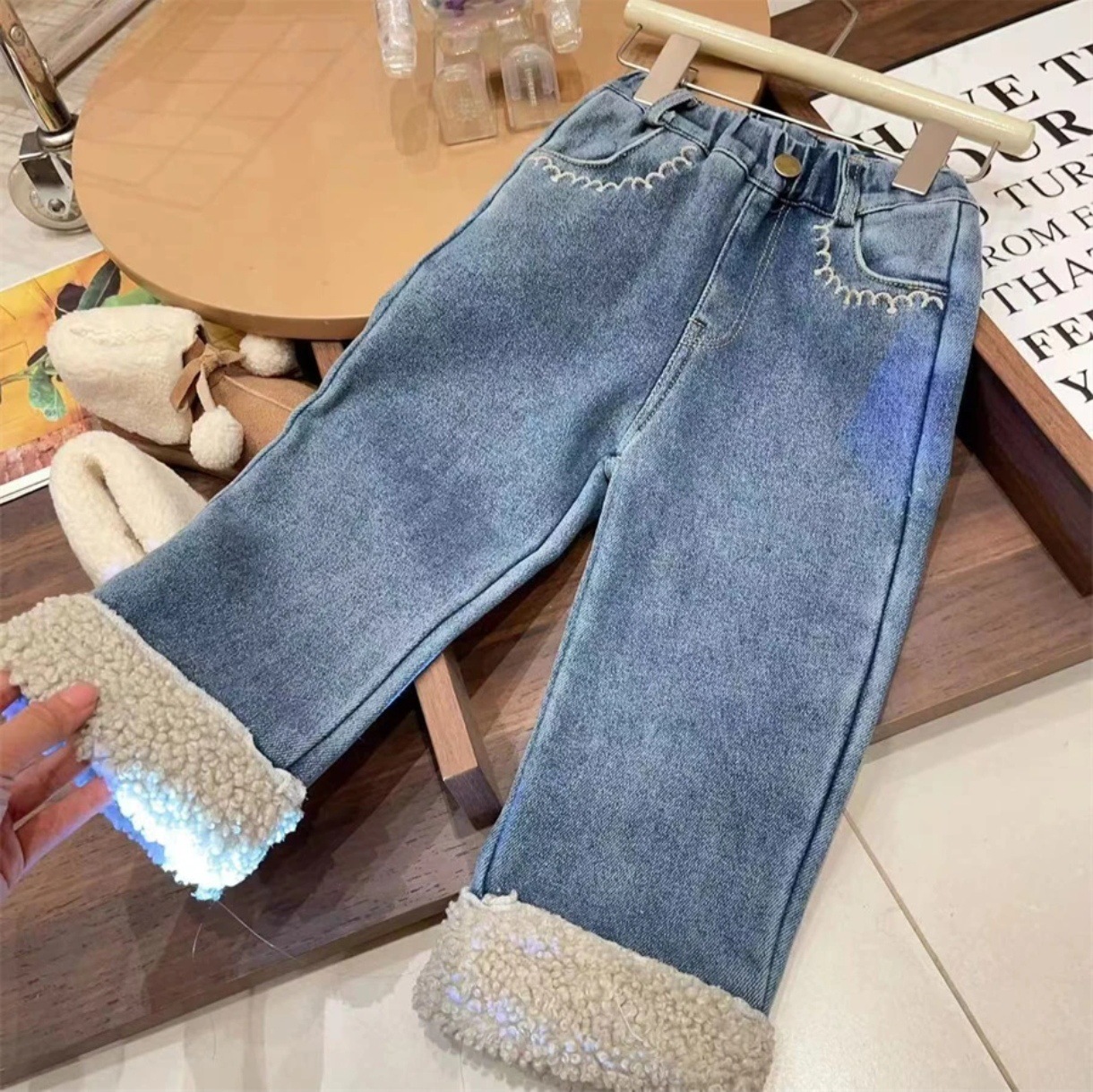 Ningli 소녀 가을과 겨울 새로운 스타일 모든 경기 합성 오스트리아 곡물 양털 스트레이트 청바지 어린이 기모 두꺼운 바지스토어 가기