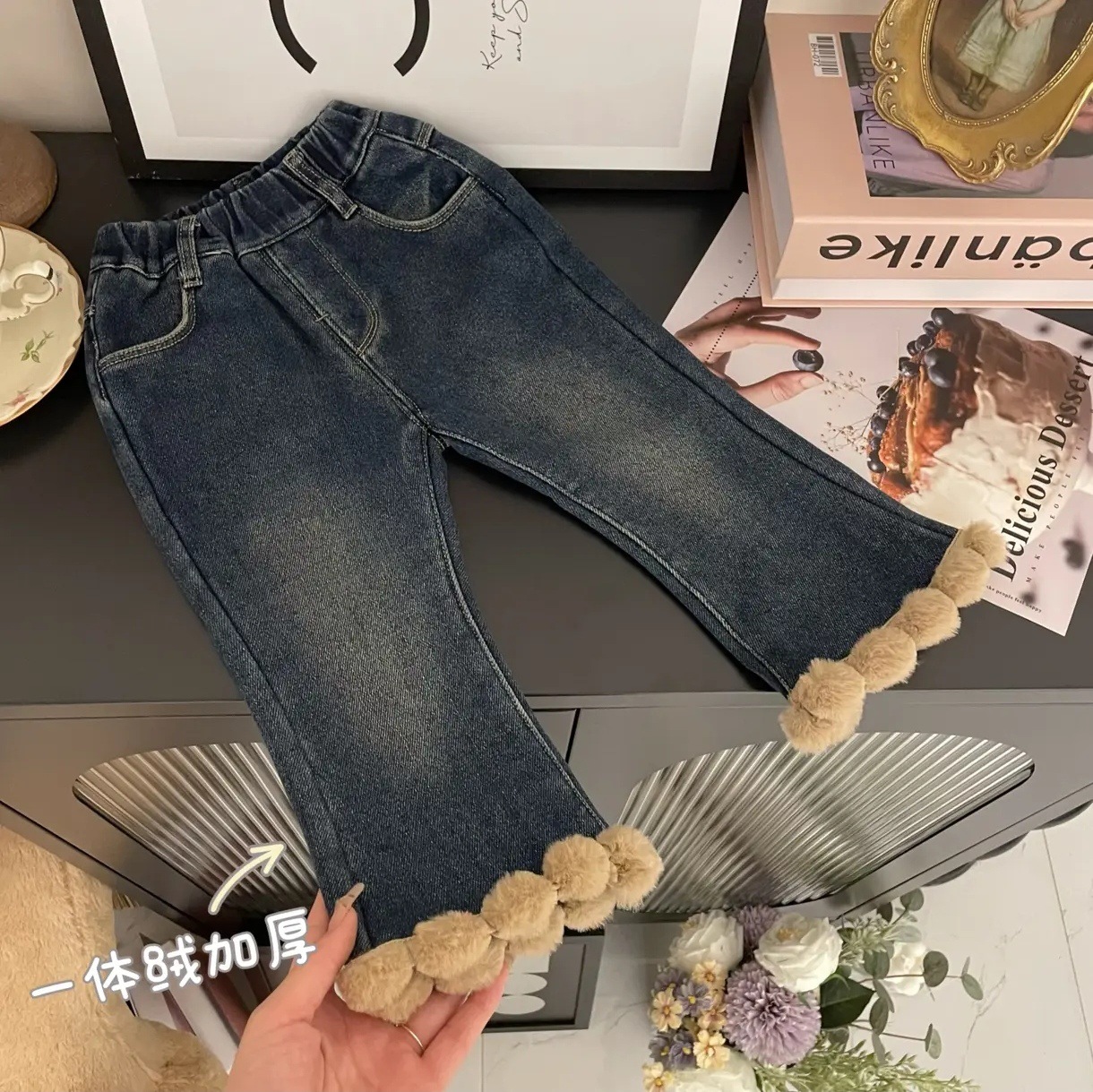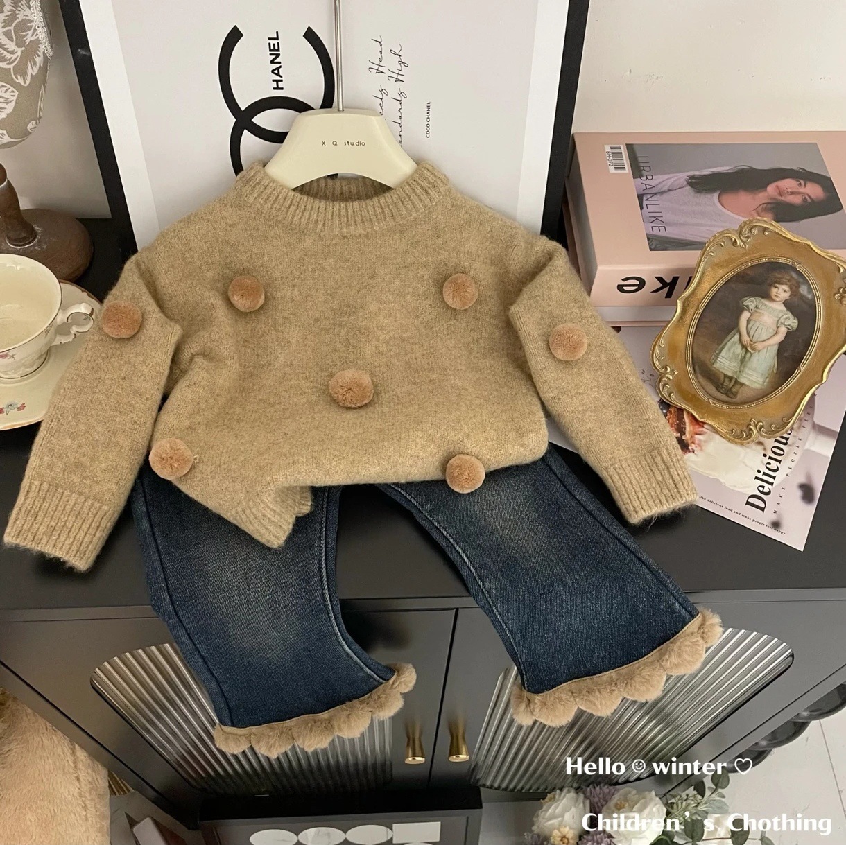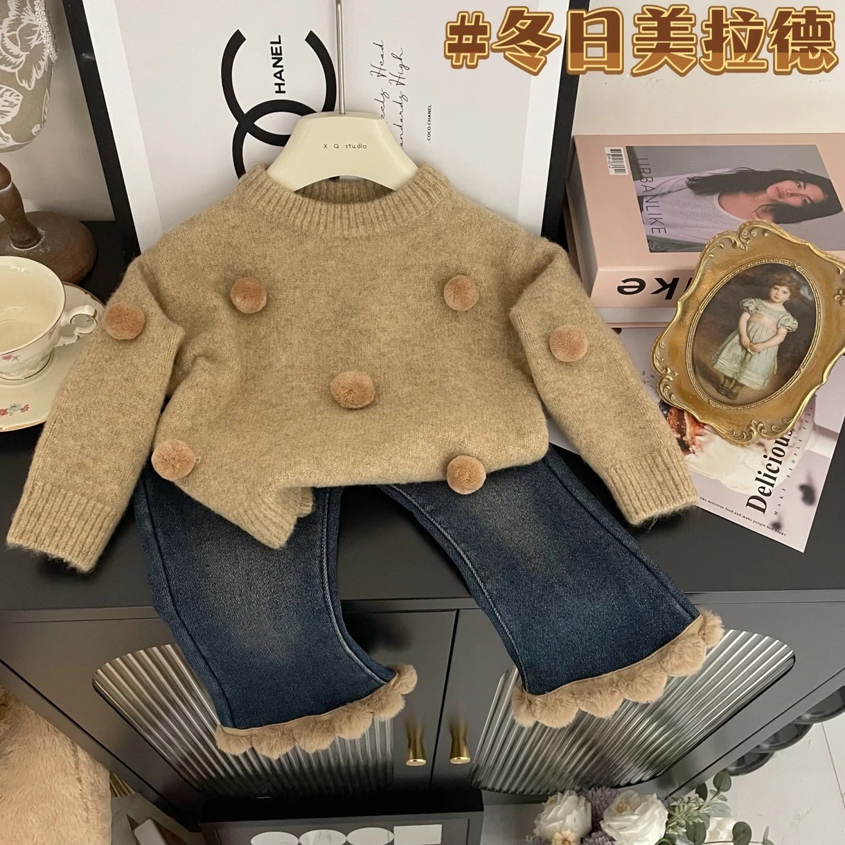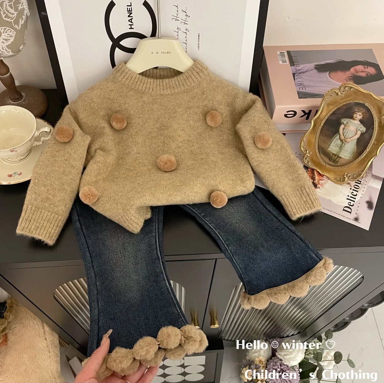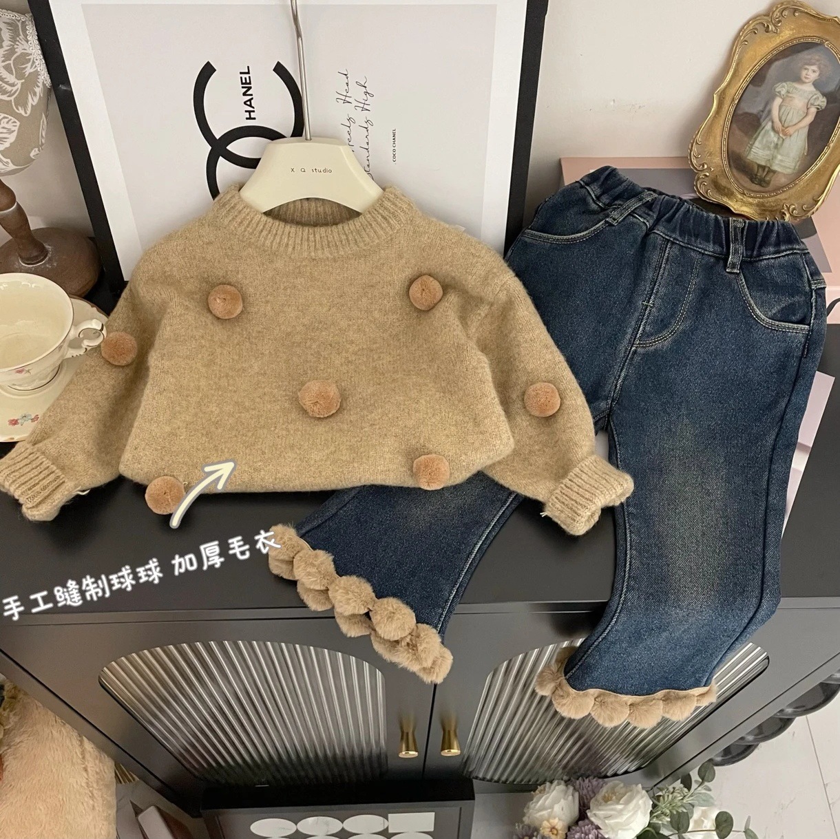 Tong Xingyuan 여아 스웨터 새로운 세련된 한국 두꺼운 니트 스웨터 가을과 겨울 세트 트렌디 한 청바지