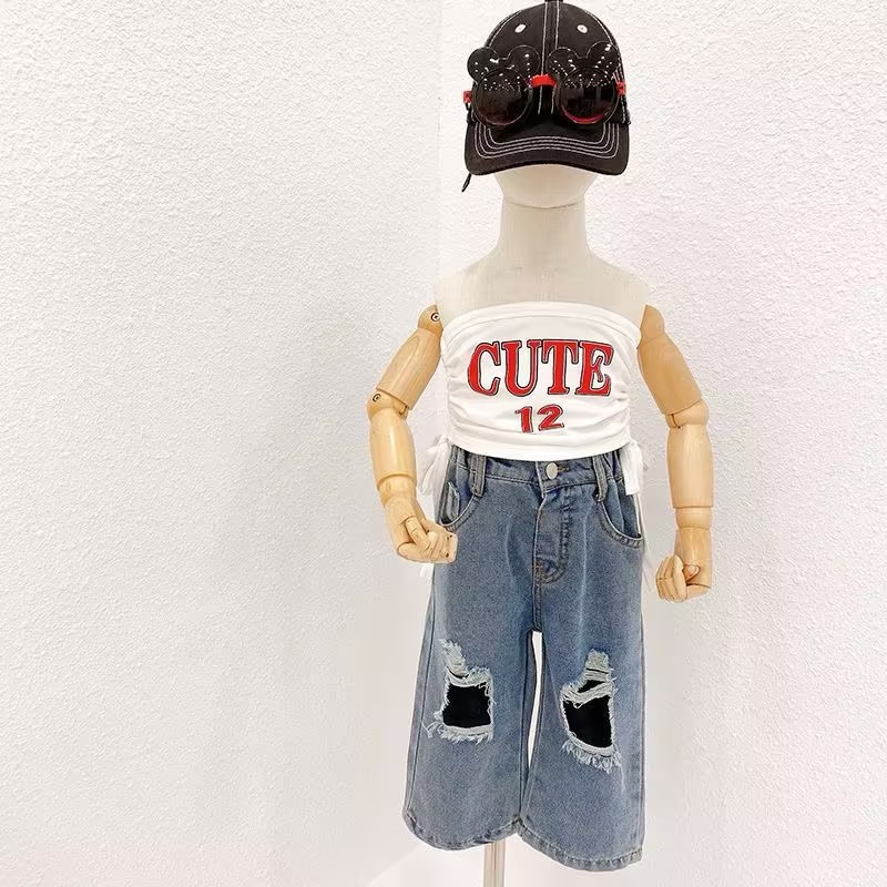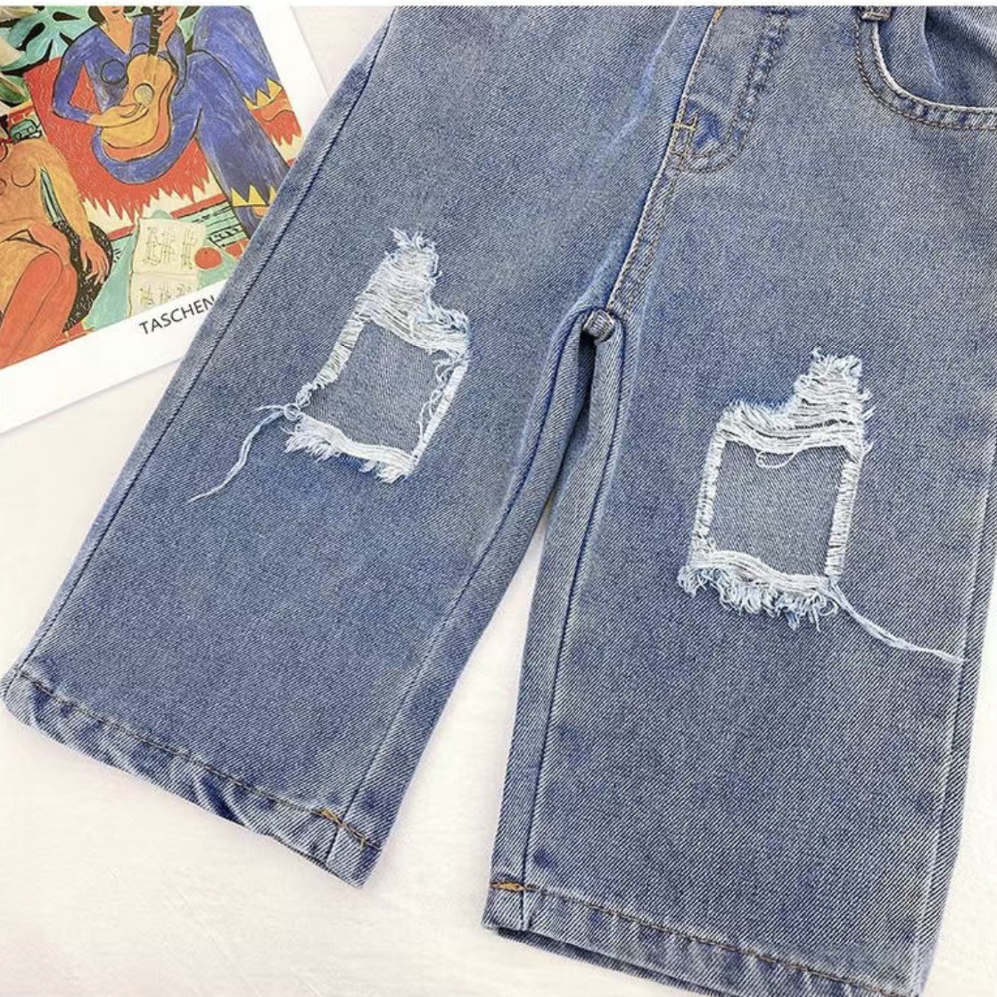 MDD 여자 가을 바지 2024 새로운 아기 느슨한 넓은 다리 바지 봄과 가을 스타일 어린이 찢어진 청바지