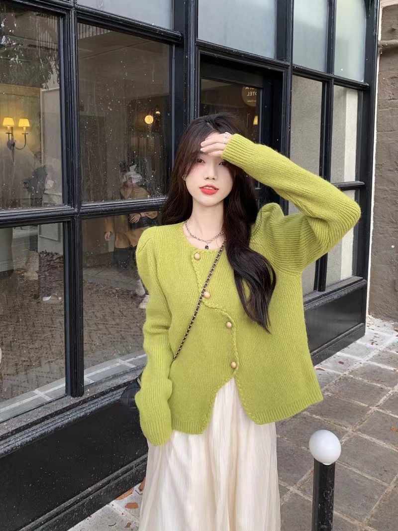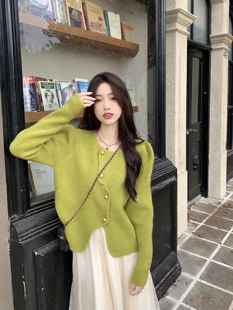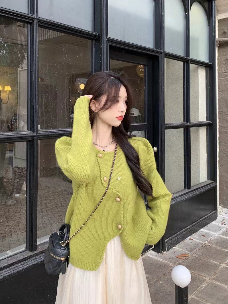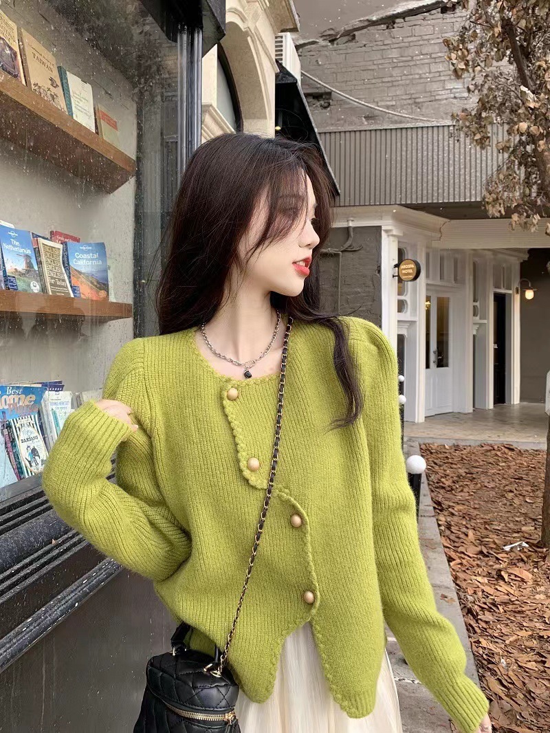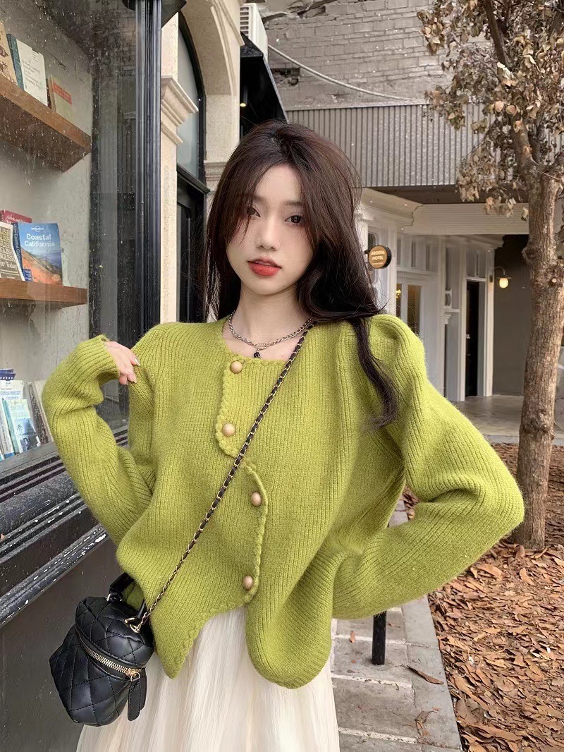 불규칙한 샤넬 스타일 니트 카디건 여성의 봄과 가을 디자인 틈새 부드러운 왁스 느슨한 짧은 스웨터 코트