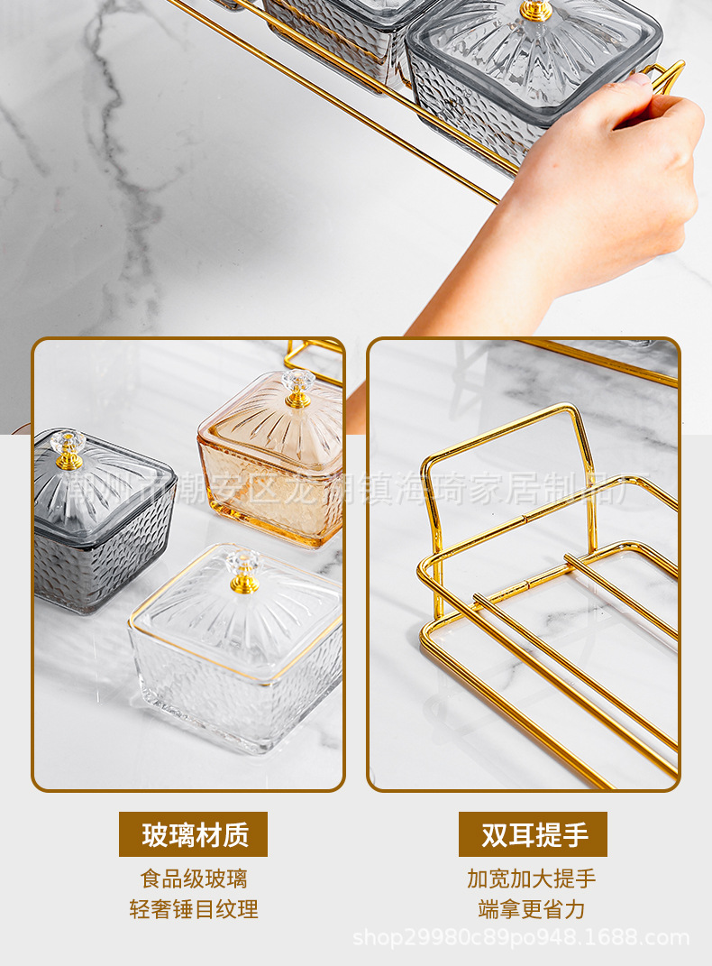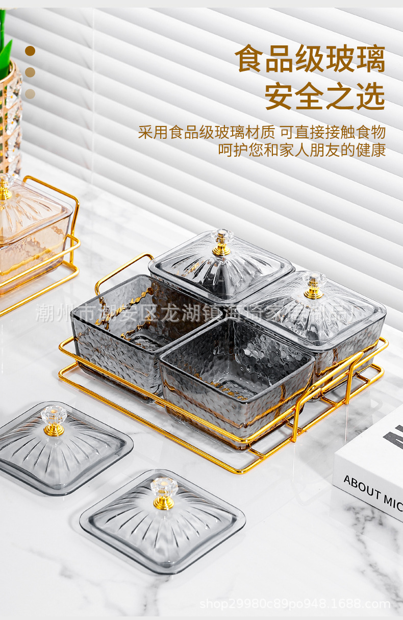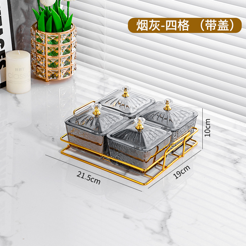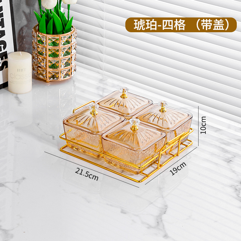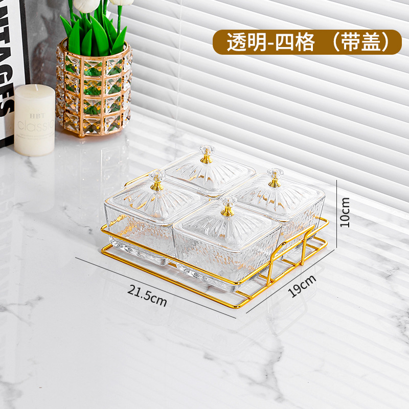 • 뚜껑이있는 황금 프레임 [4 그리드 투명 해머 텍스트 유리 사각형 접시]