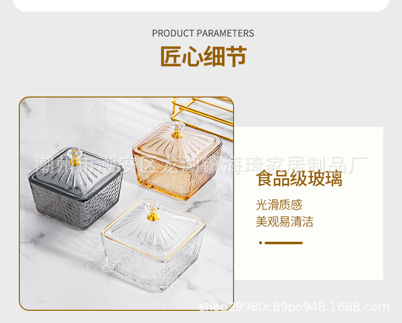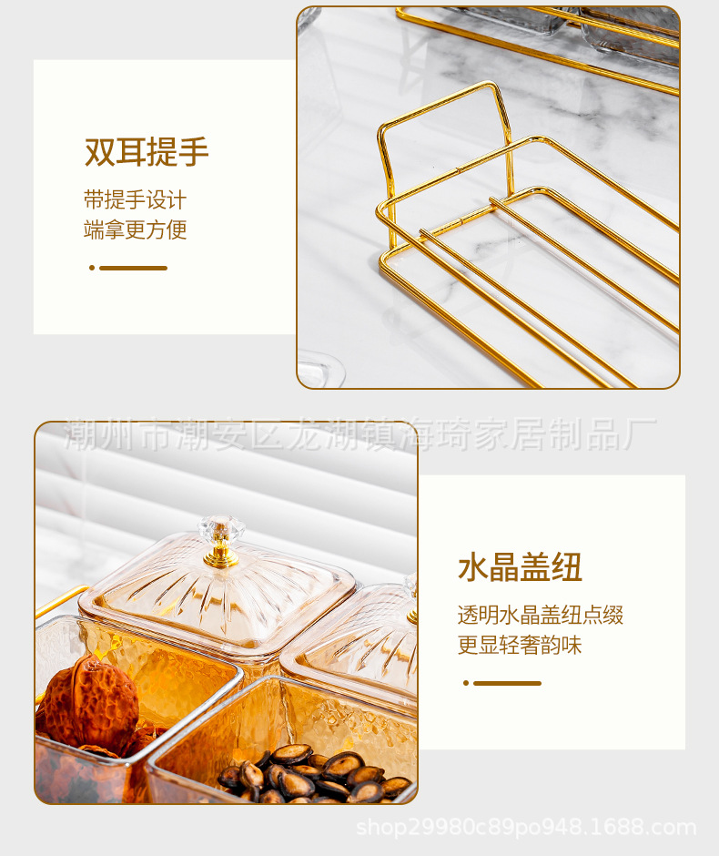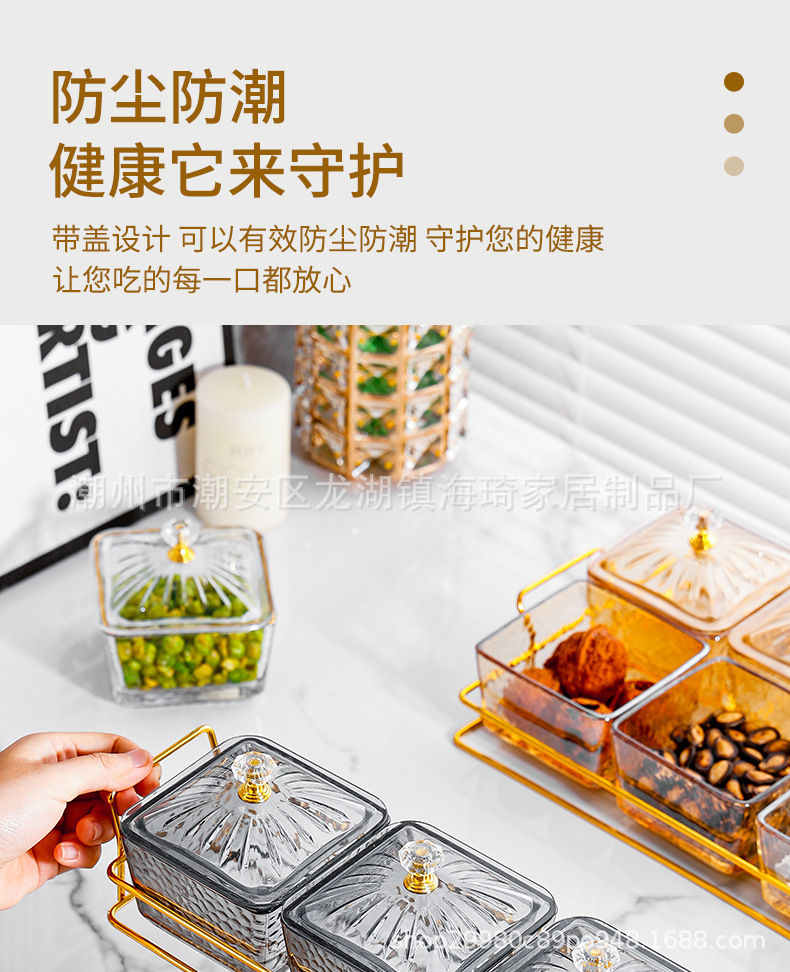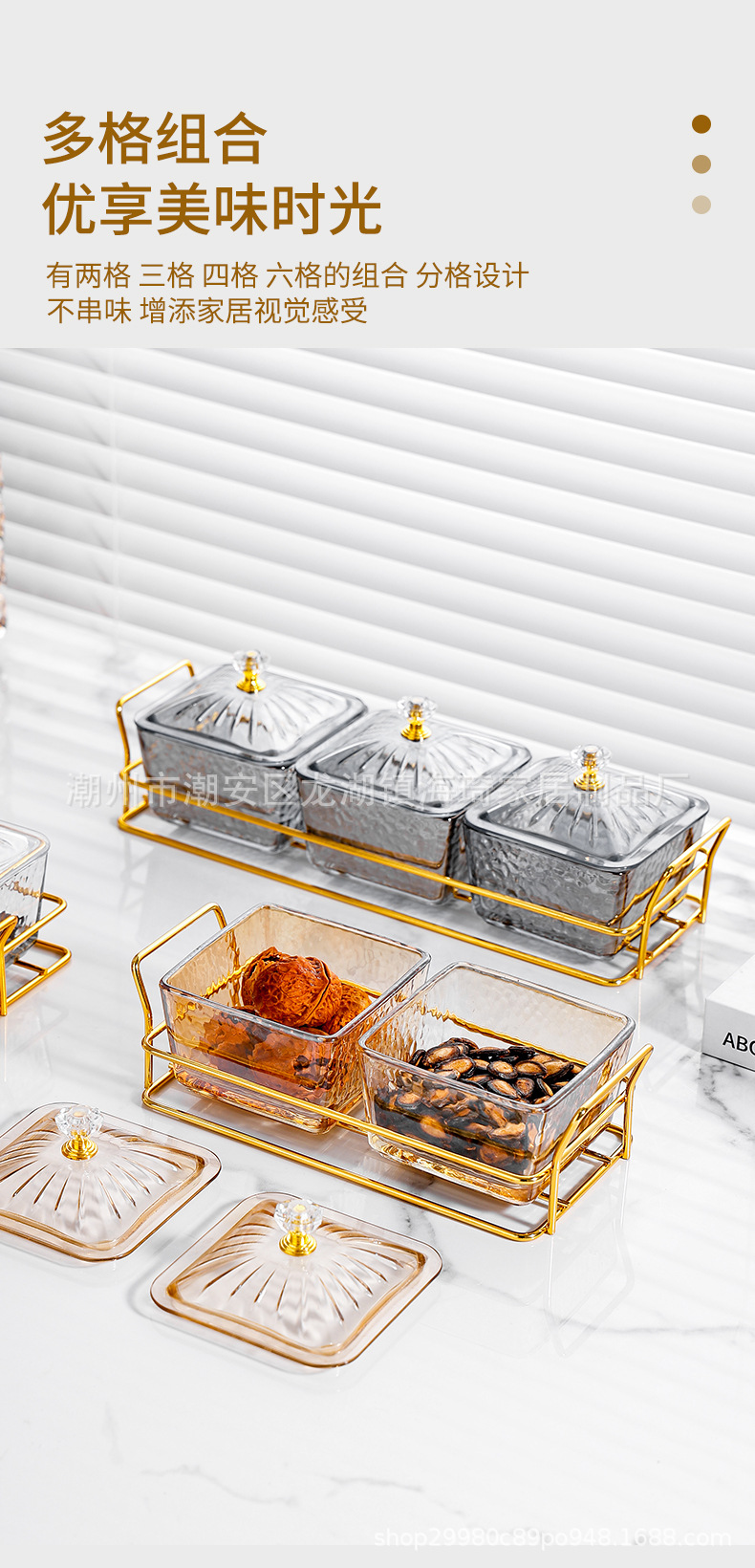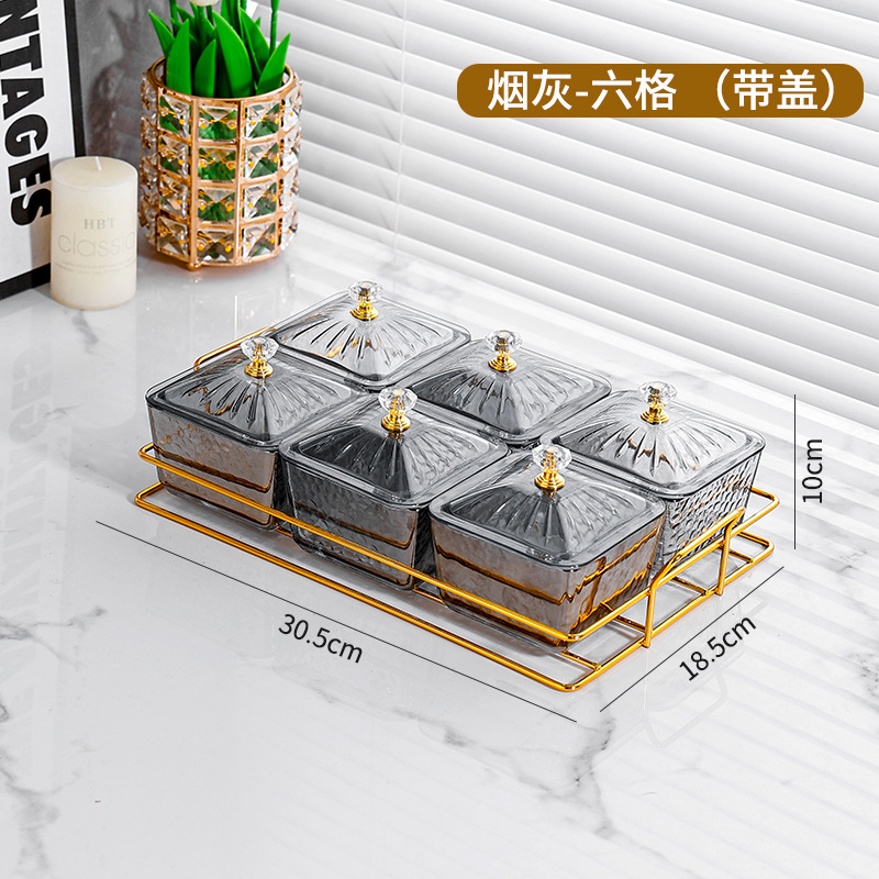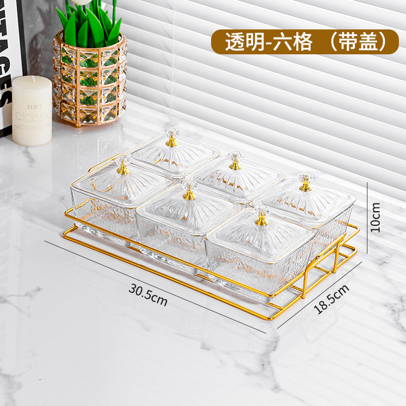 • 뚜껑이있는 황금 프레임 [6 그리드 투명 해머 텍스트 유리 사각형 접시]