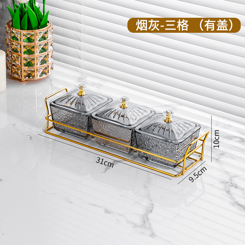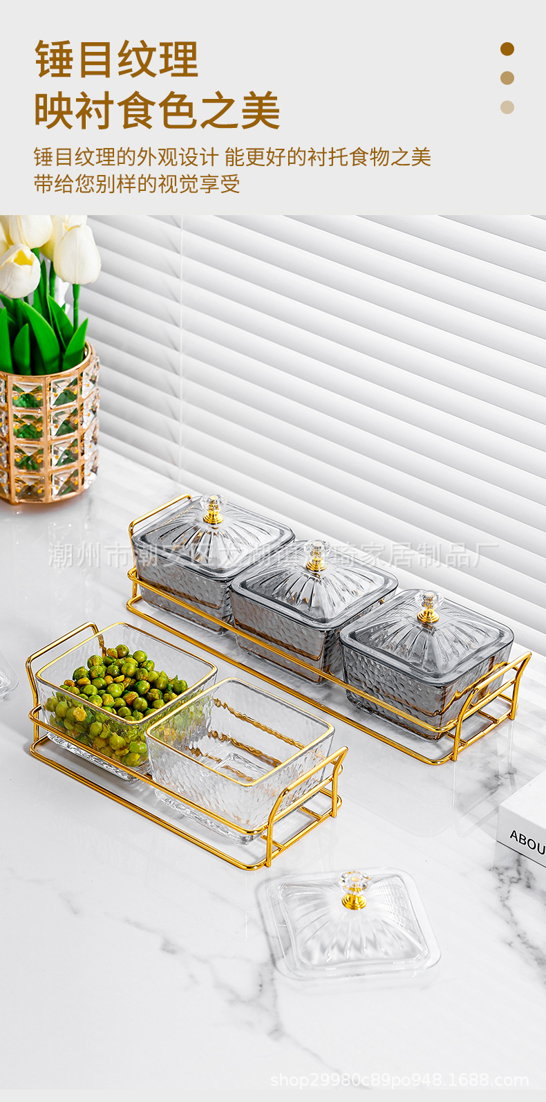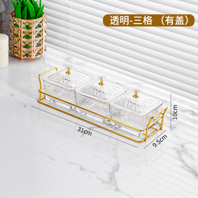 • 뚜껑이있는 황금 프레임 [3 그리드 투명 해머 텍스트 유리 사각형 접시]