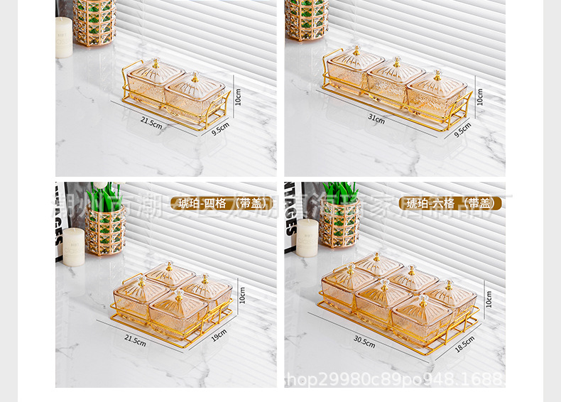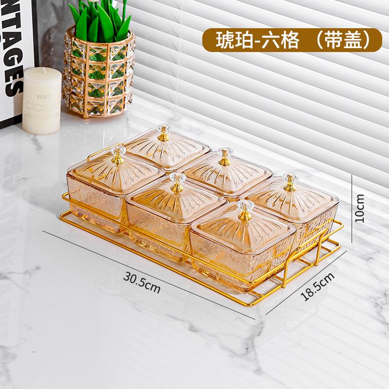 • 뚜껑이있는 황금 프레임 [6 그리드 앰버 해머 텍스트 유리 사각형 접시]