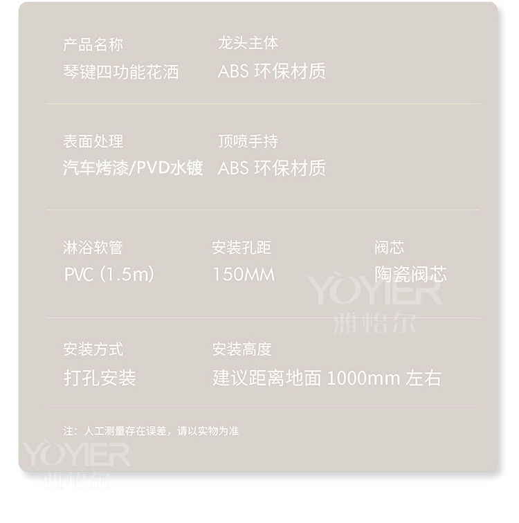 二、花洒套装主体,龙头主体,角阀主体,洗衣机龙头主体,产品使用功能质保2年【注:主体是控制面板 出水功能】,配套配件质保半年 此保证以购买产品日期生效,寄回维修,本店无安装服务。