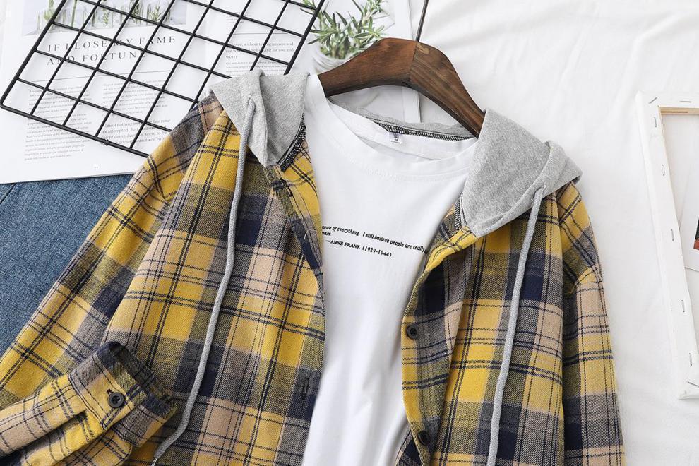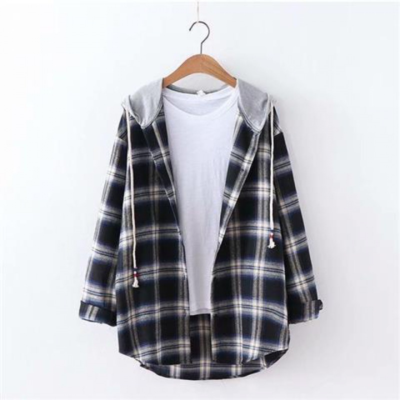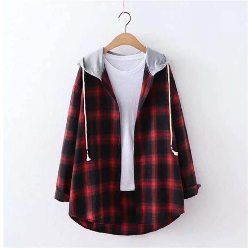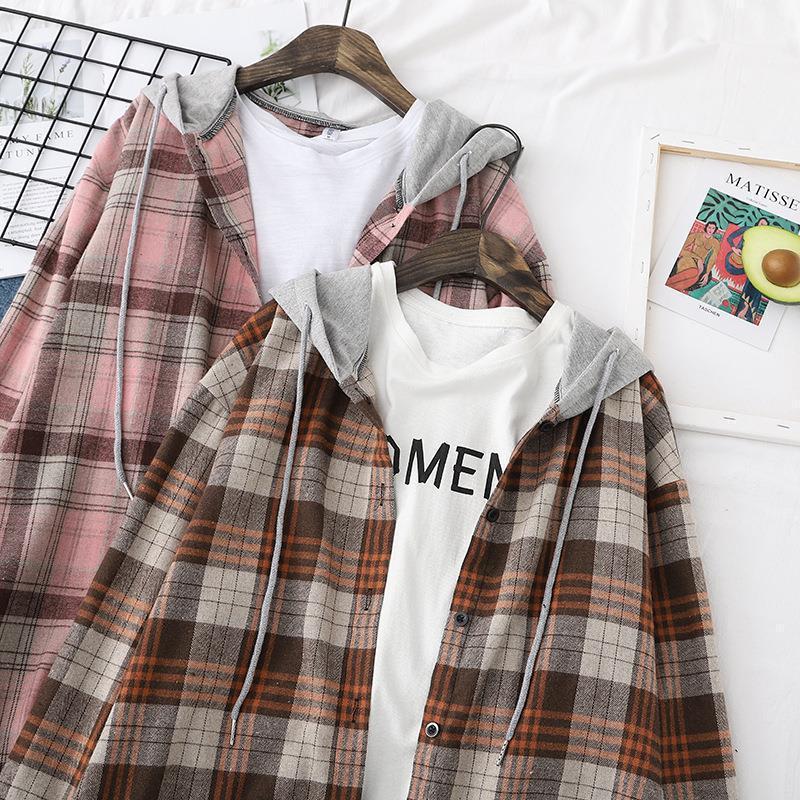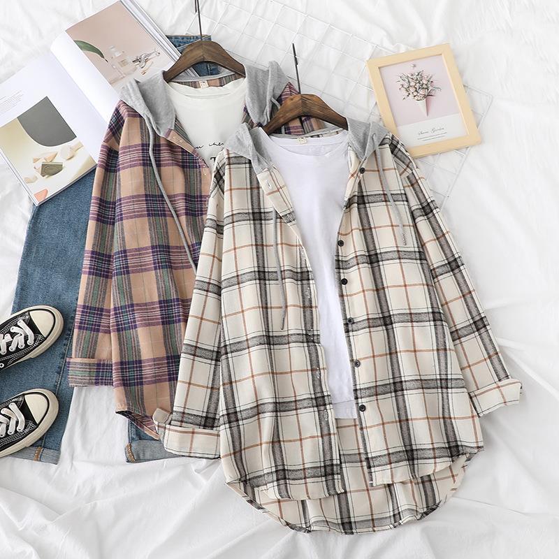 봄 여름 가을 격자 무늬 셔츠 여성용 레트로 홍콩 스타일 Ins 느슨한 후드 카디건 재킷 셔츠