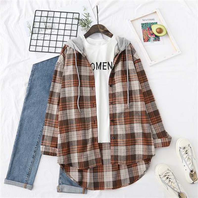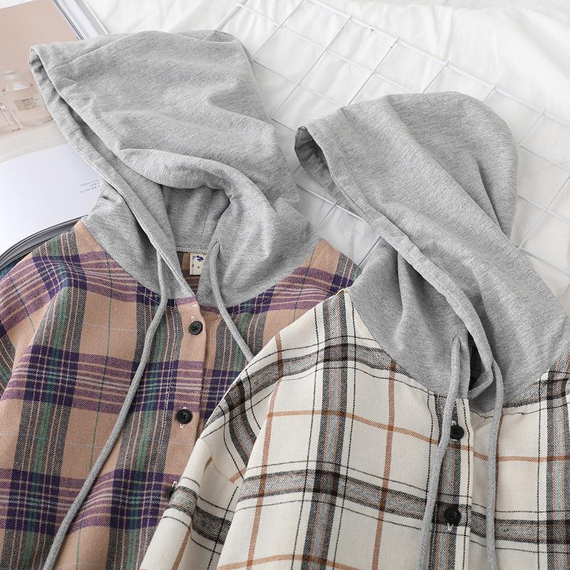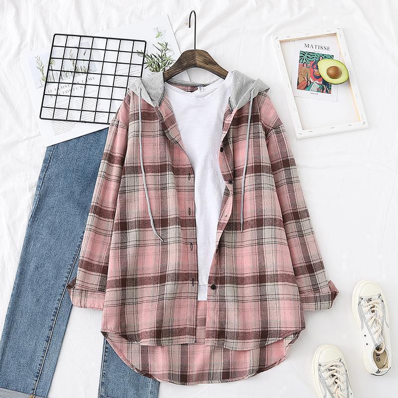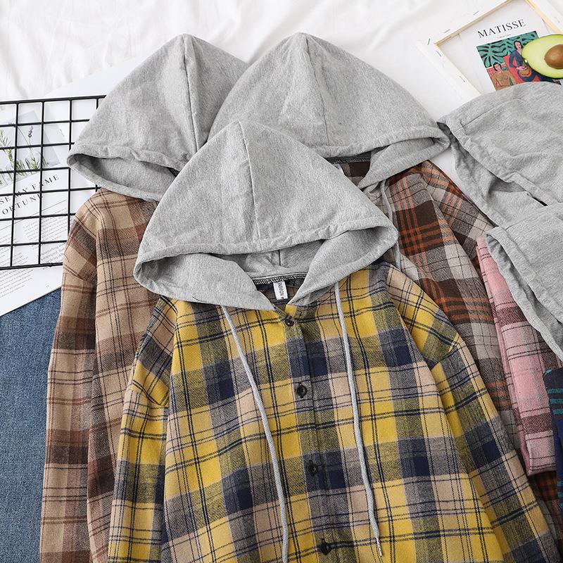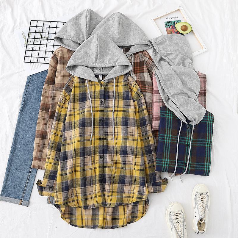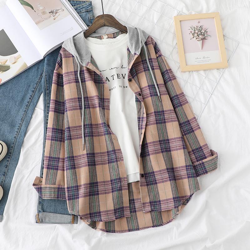 봄 여름 가을 격자 무늬 셔츠 여성용 레트로 홍콩 스타일 Ins 느슨한 후드 카디건 재킷 셔츠스토어 가기