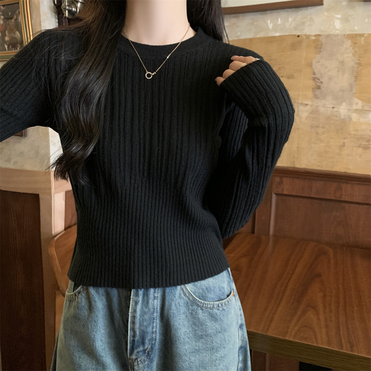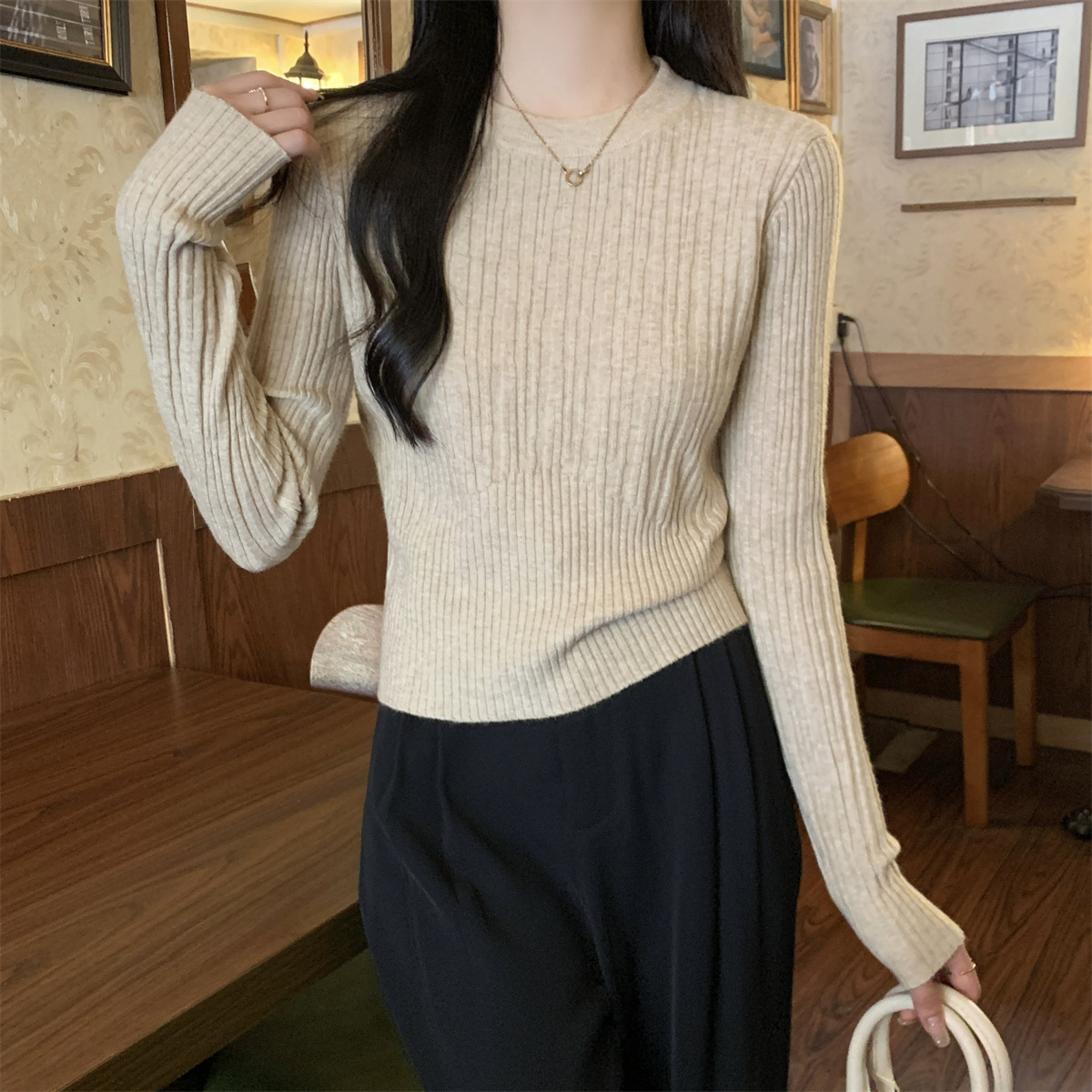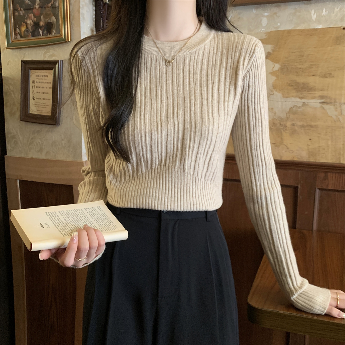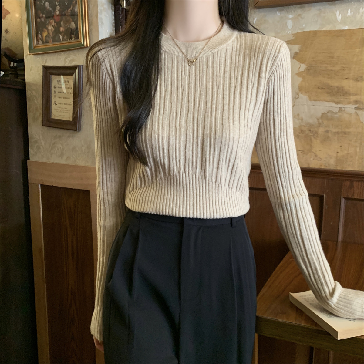 한국식 핏 스트립 어깨 화이트 니트 베이스 셔츠 여성용 봄 디자인 센스 슬림 핏 슬림 핏 얇은 스웨터 내부 쇼트 탑스토어 가기