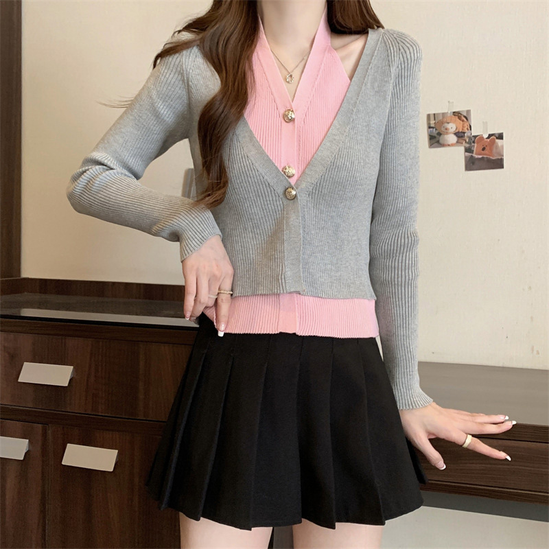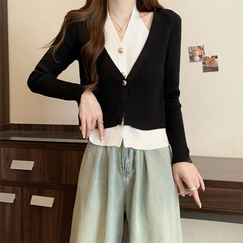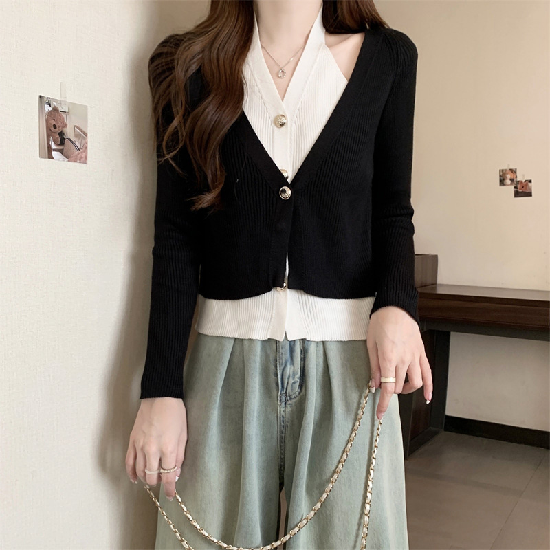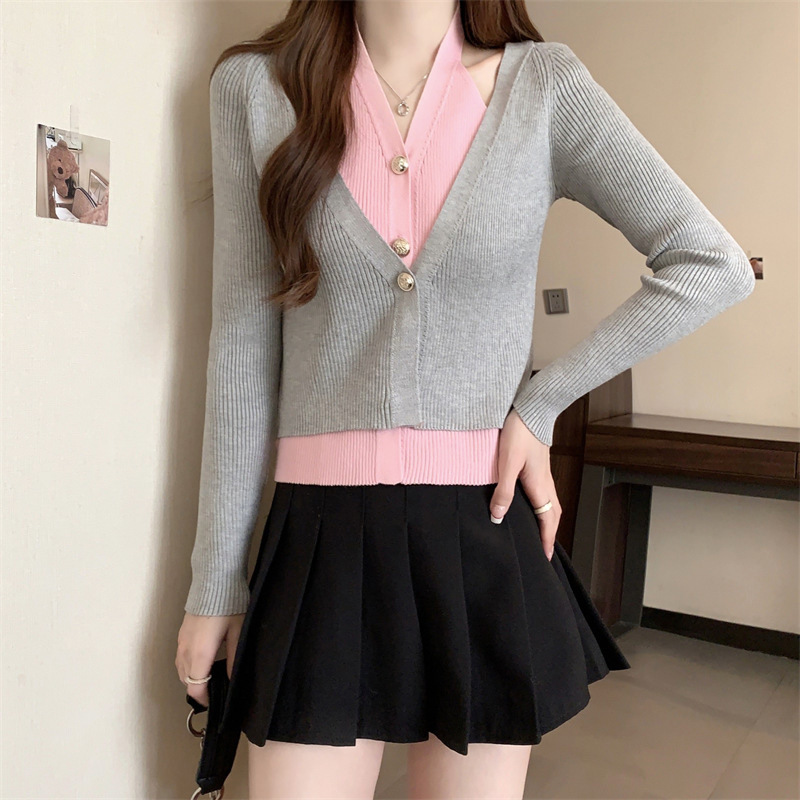 가을과 겨울 새로운 프랑스 스타일 순수한 욕망 스타일 교수형 목 슬링 가짜 투피스 조끼 여성의 디자인 감각 틈새 니트 가디건 탑