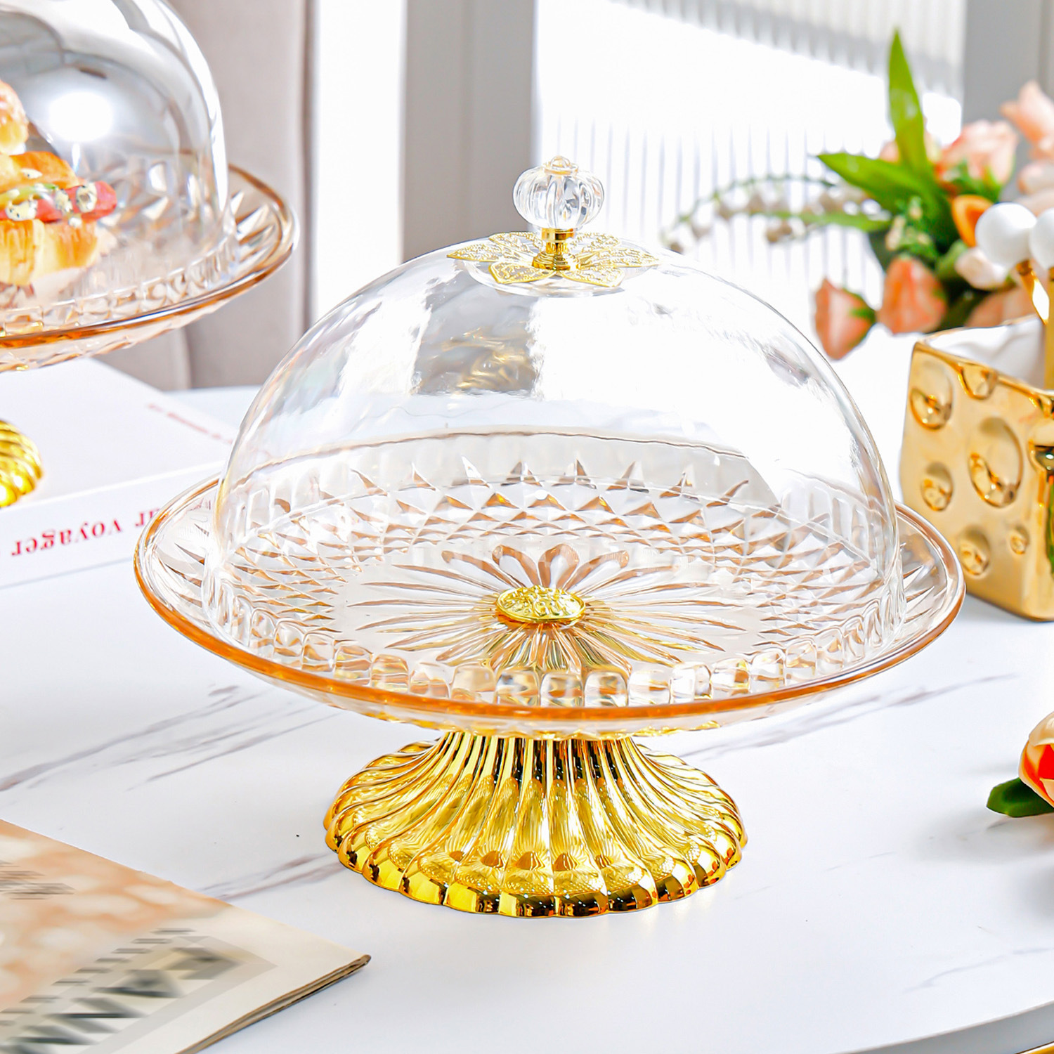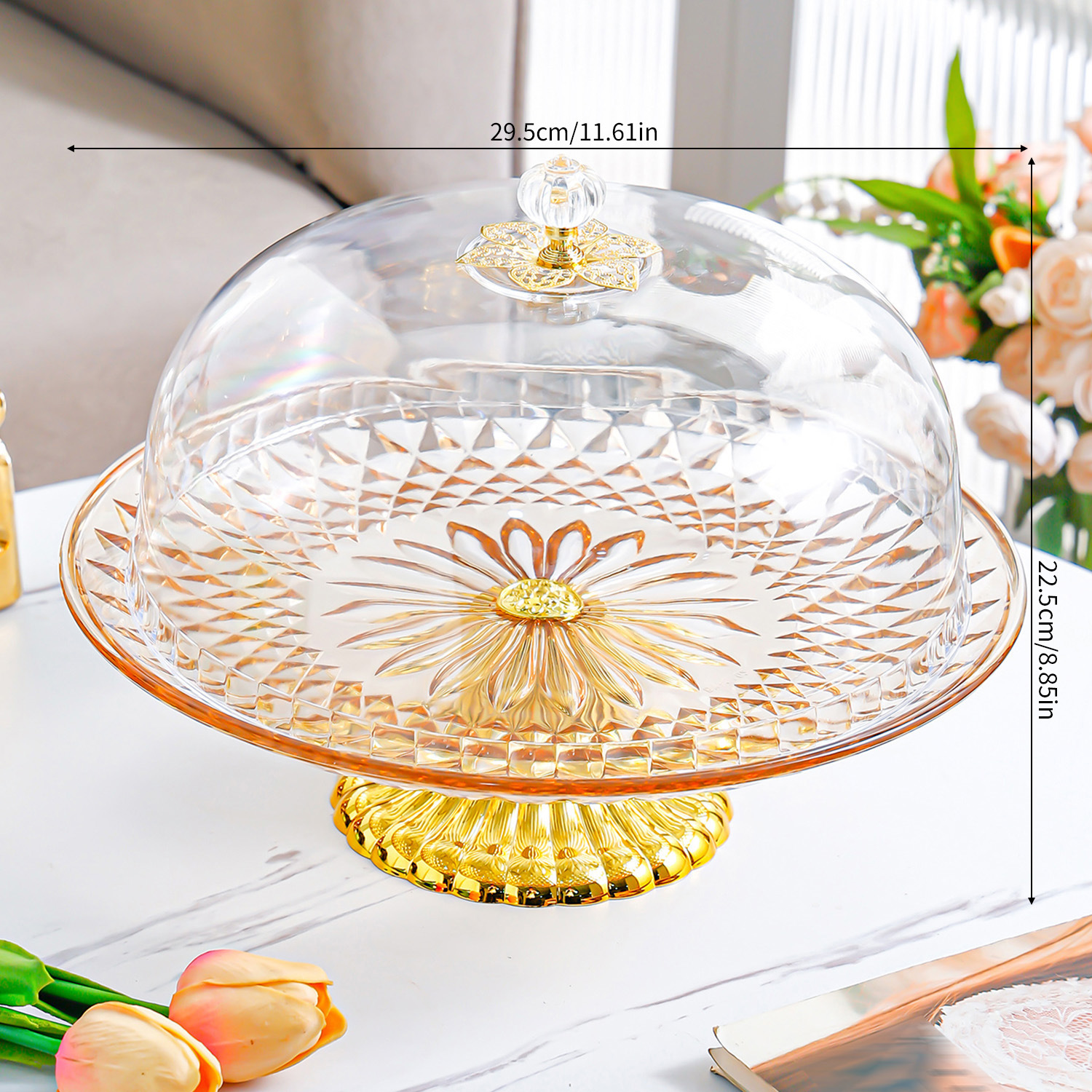 • 뚜껑이 달린 키 큰 호박색 케이크 접시 -- S