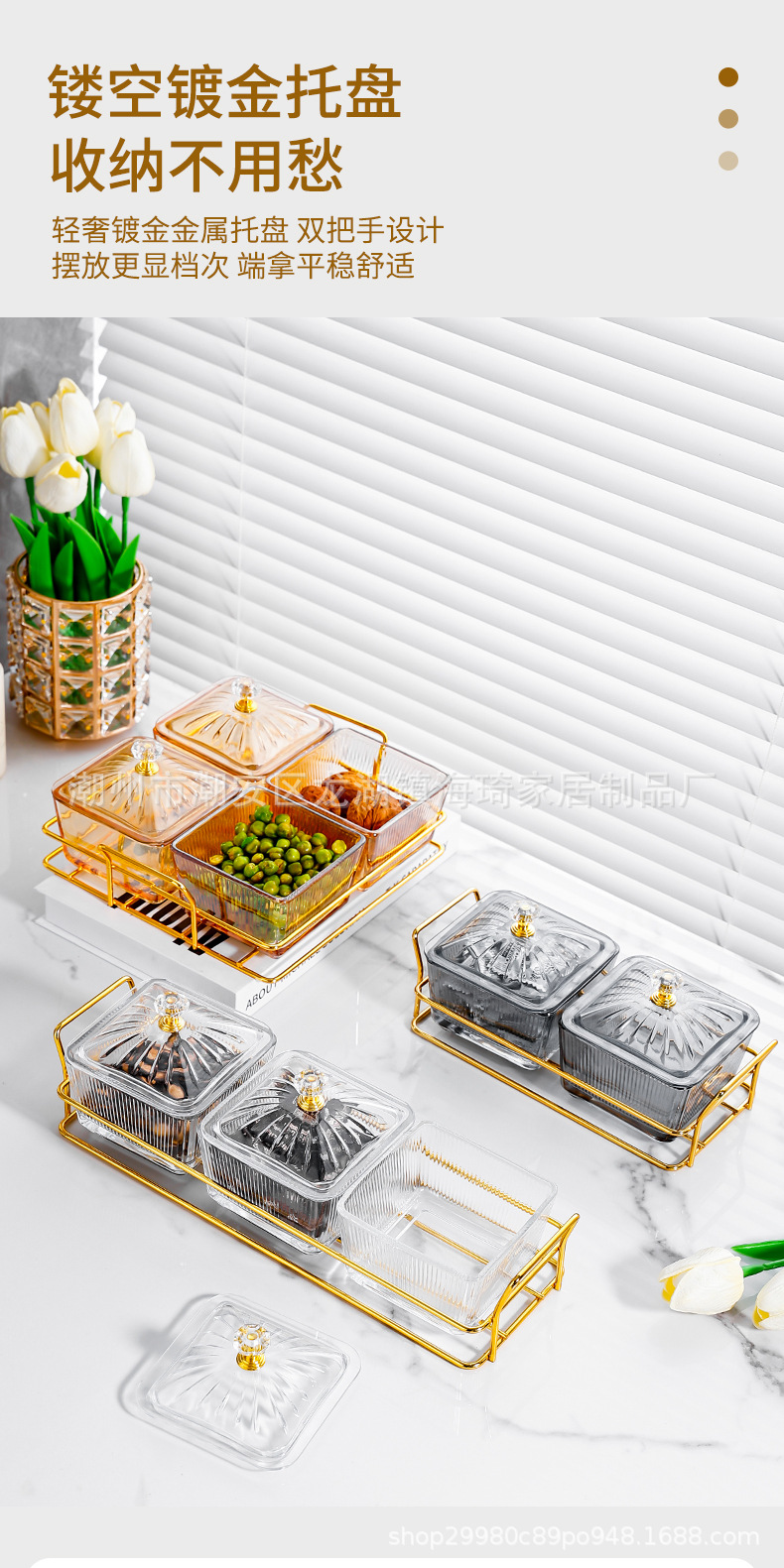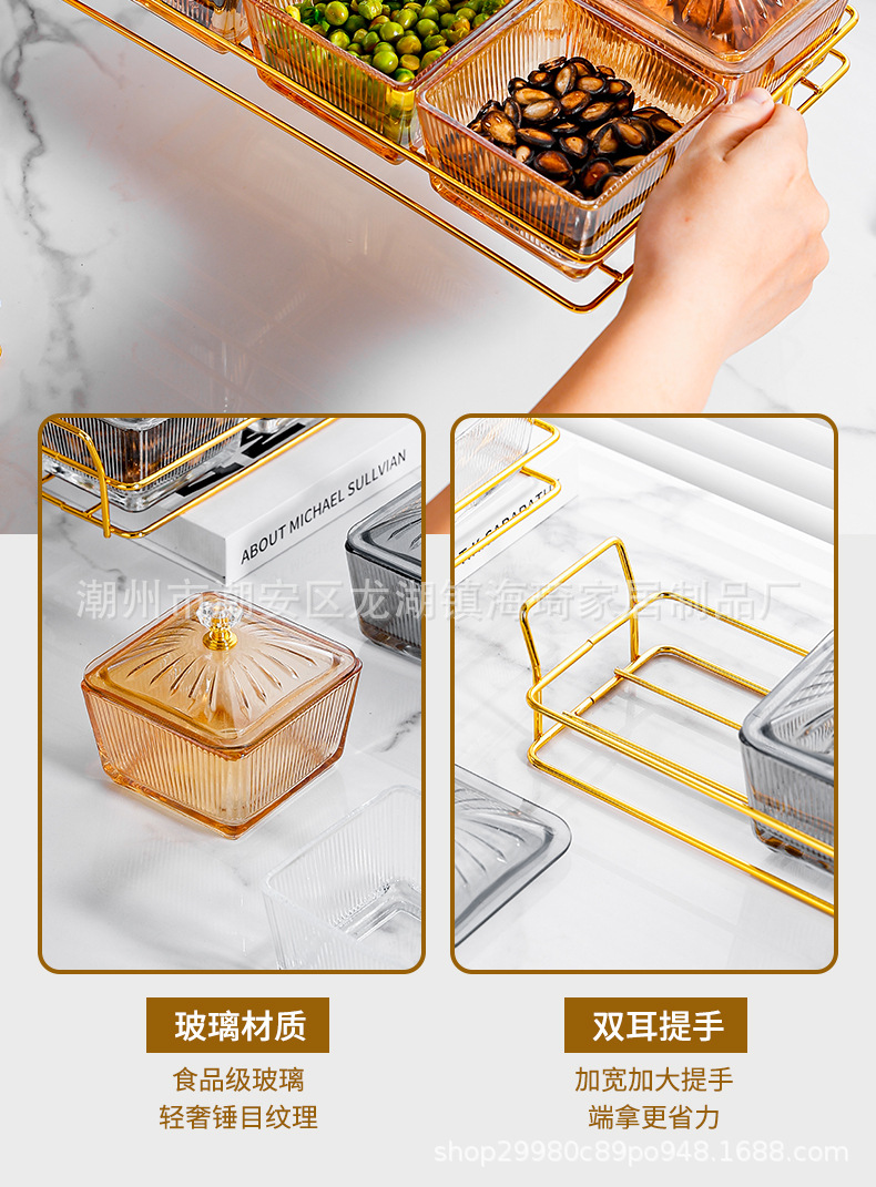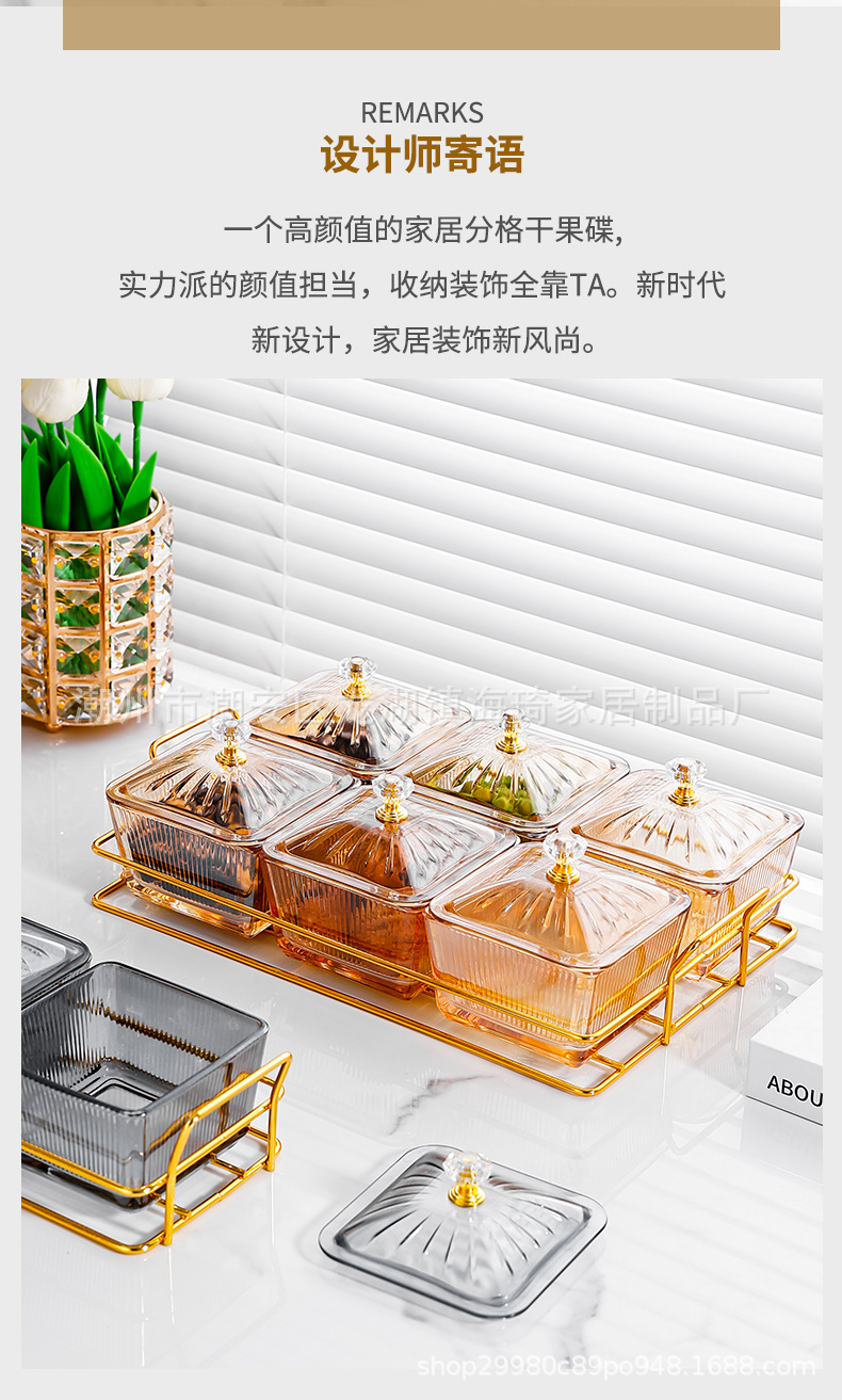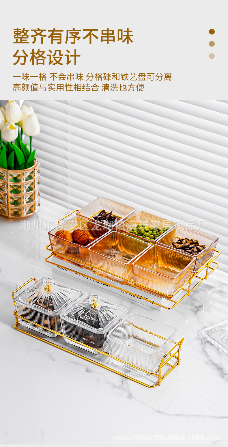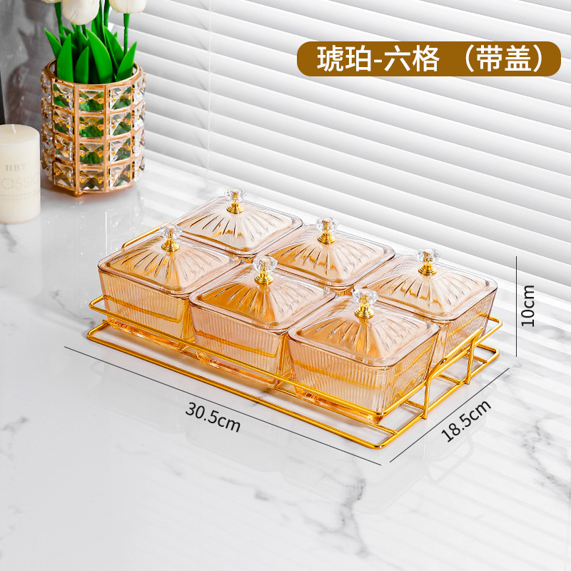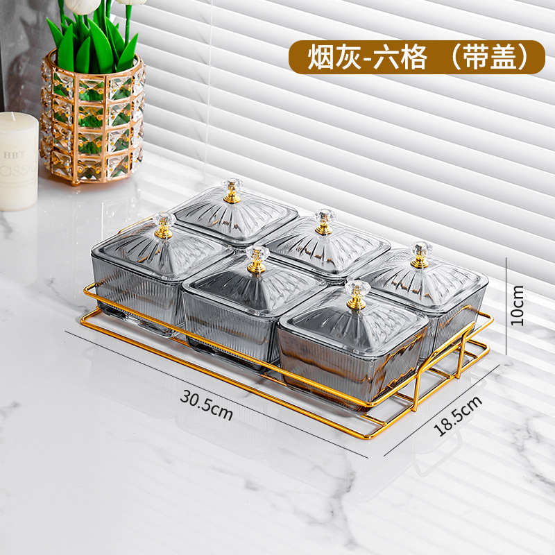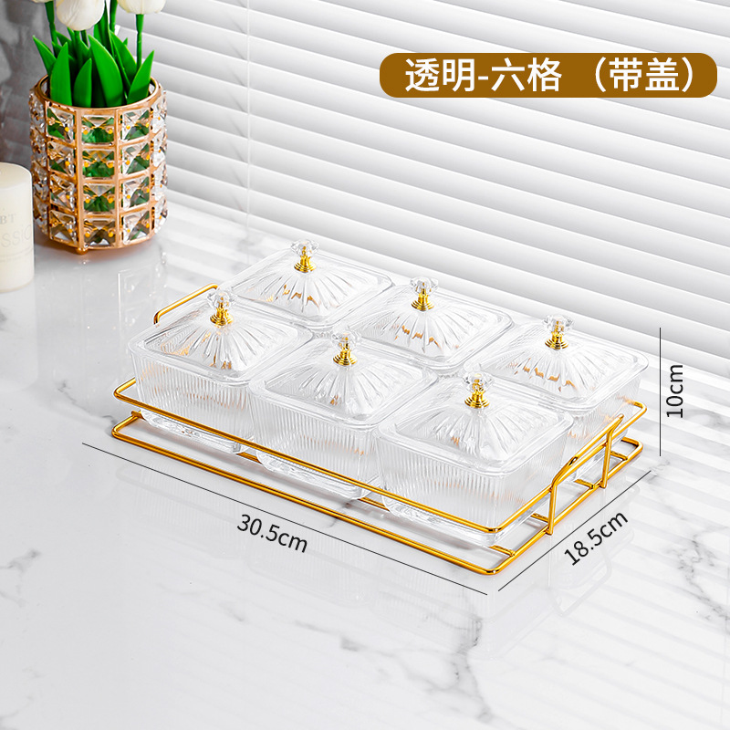 • 뚜껑이있는 황금 랙 [6 그리드 투명 줄무늬 유리 사각형 접시]