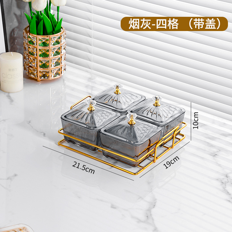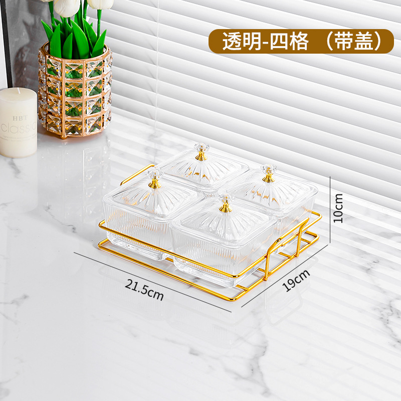 • 뚜껑이있는 황금 랙 [4 그리드 투명 줄무늬 유리 사각형 접시]