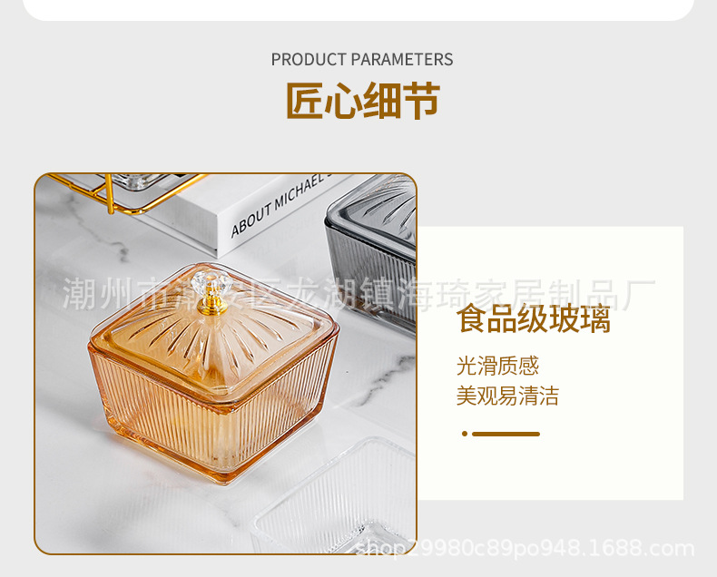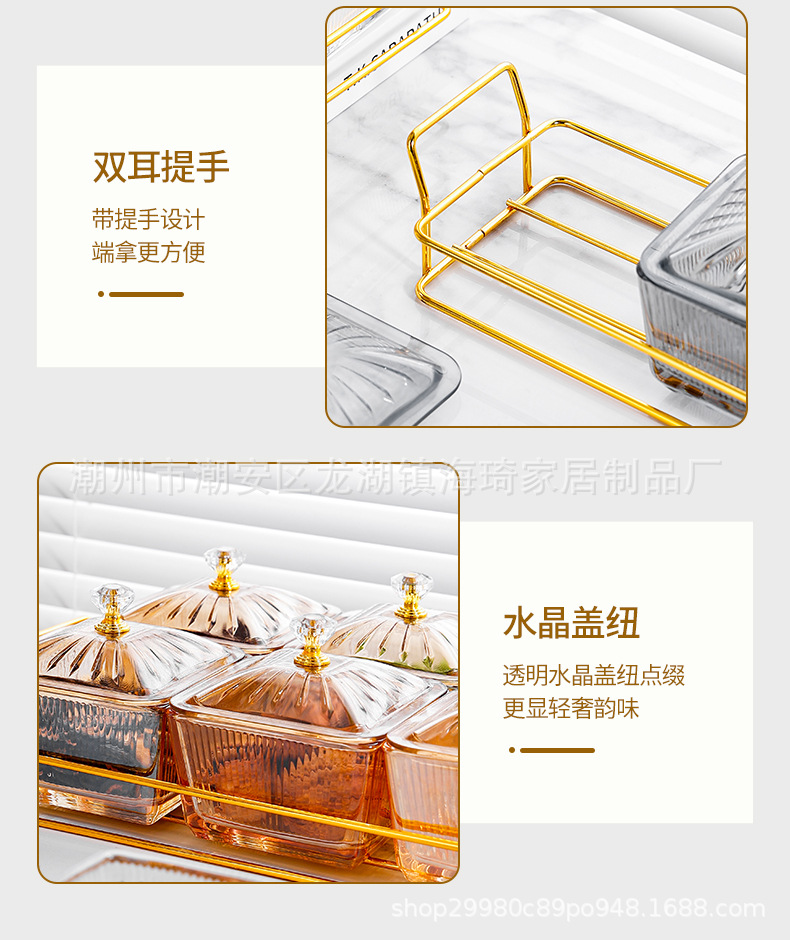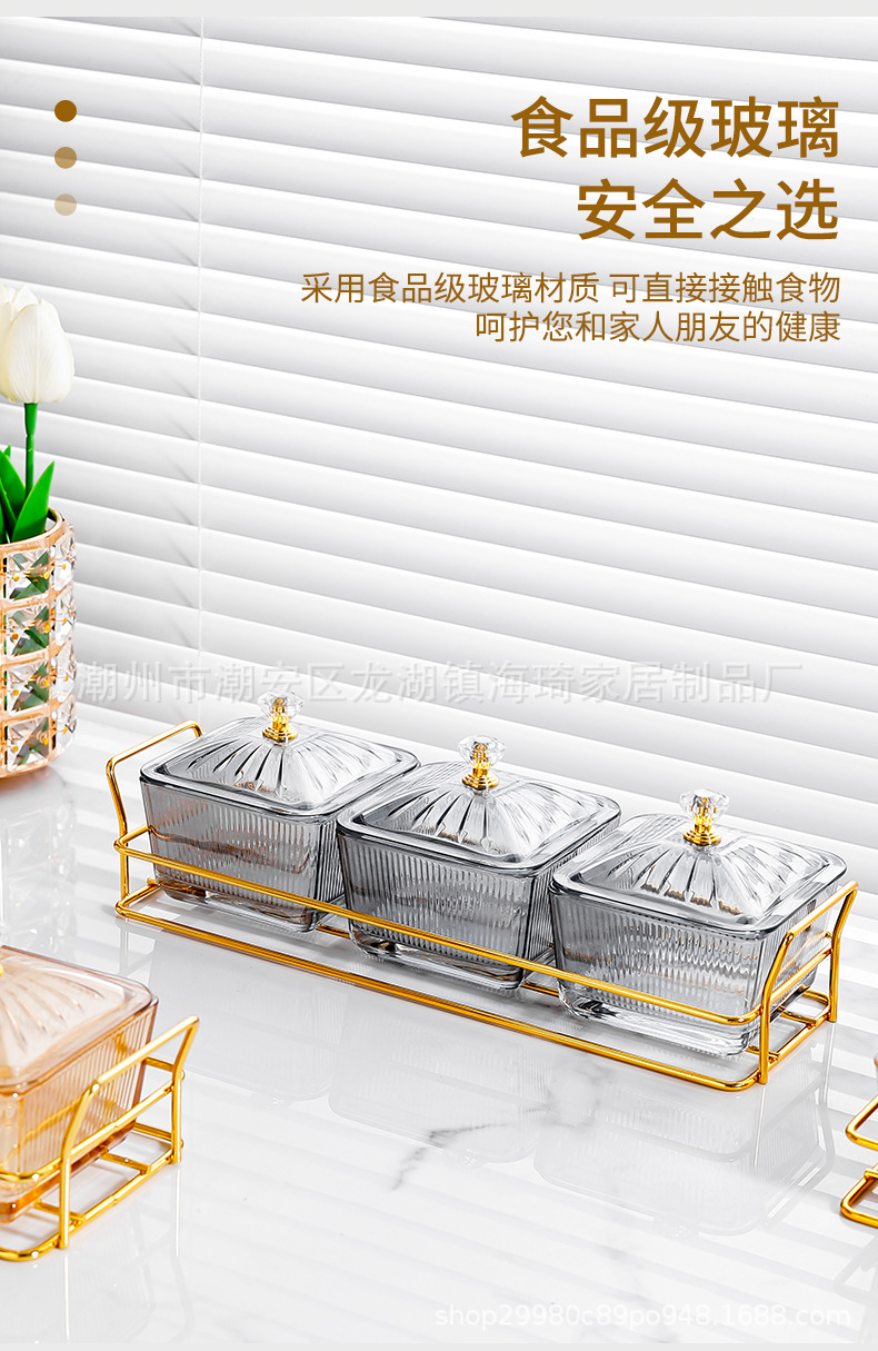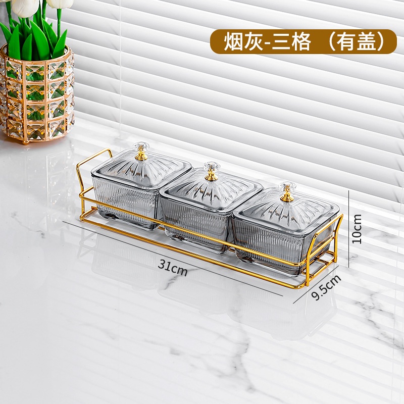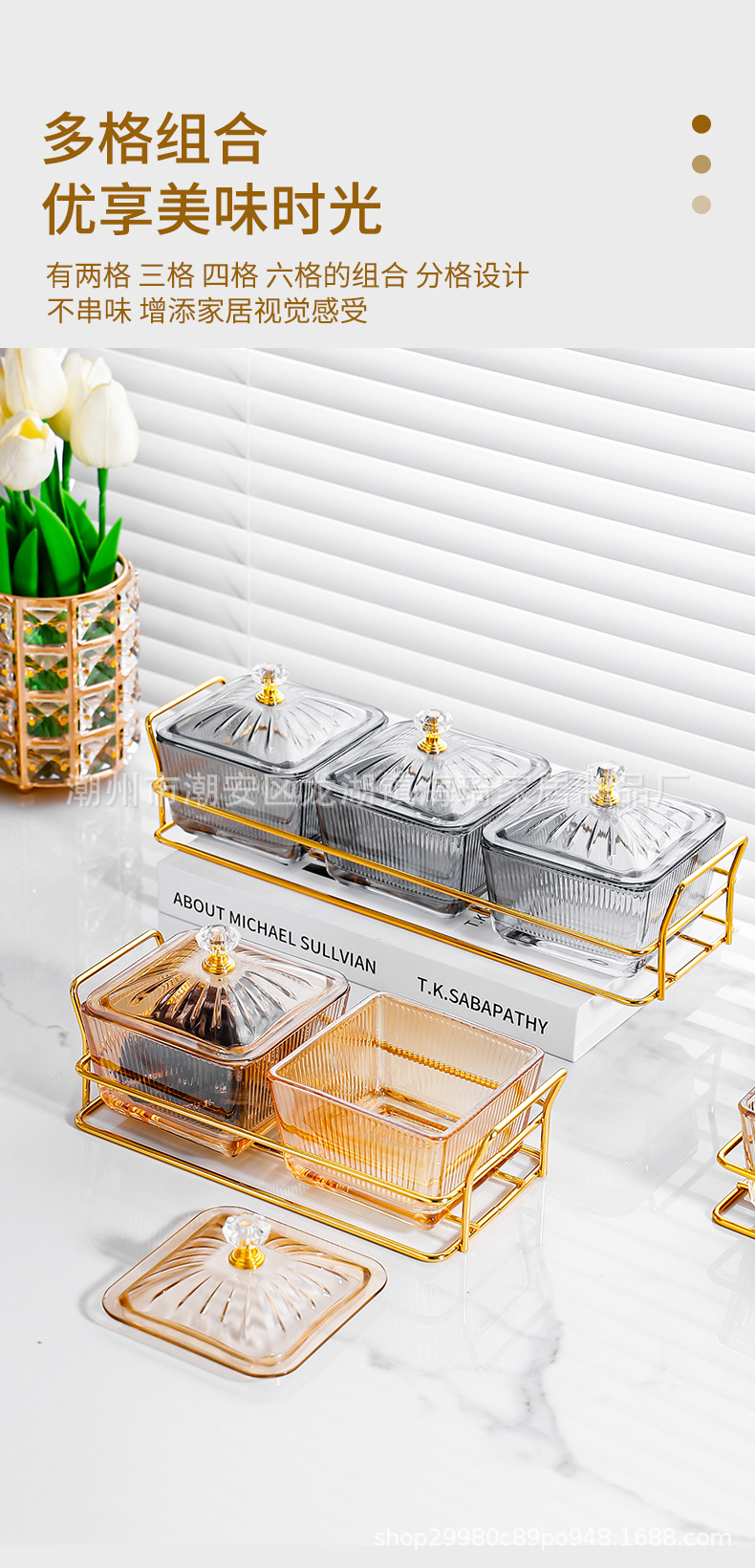 • 뚜껑이있는 황금 랙 [3 그리드 투명 줄무늬 유리 사각형 접시]