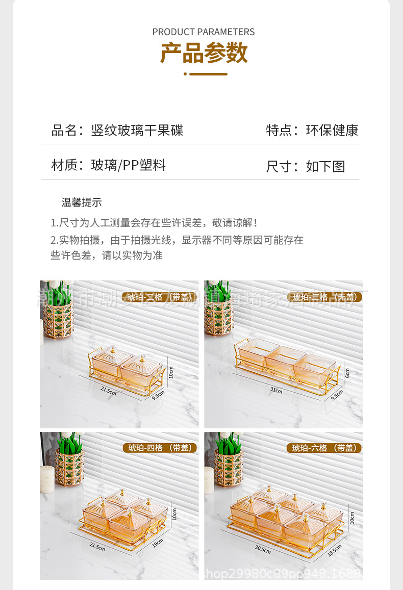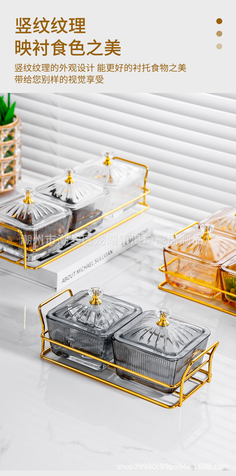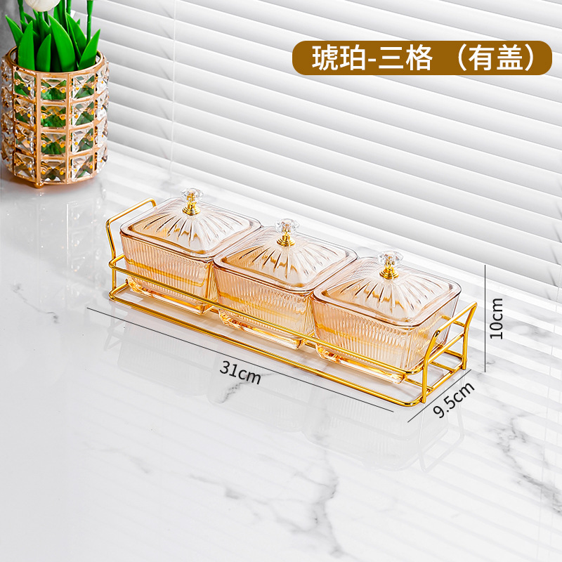 • 뚜껑이있는 황금 프레임 [3 그리드 호박색 줄무늬 유리 사각형 접시]