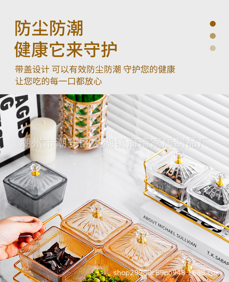 • 뚜껑이있는 황금 프레임 [4 그리드 호박색 줄무늬 유리 사각형 접시]