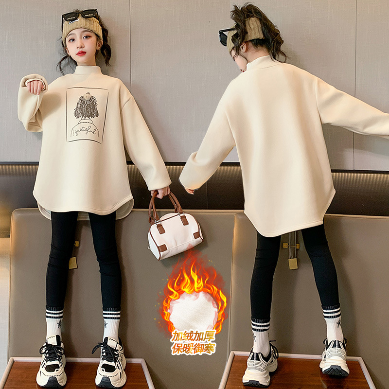 여아 두꺼운 원피스 벨벳 스웨터 2023 새로운 가을 겨울 중대형 아동용 기모 중간 길이 세미 하이 칼라 베이스 셔츠