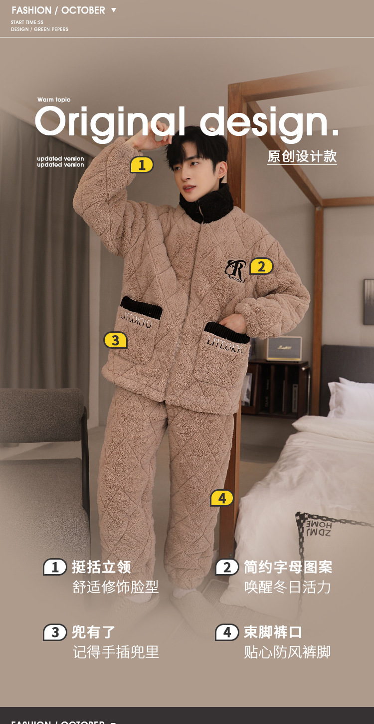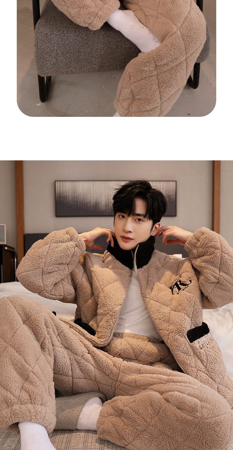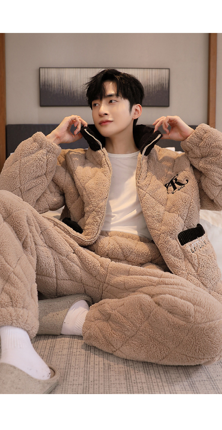 카디건 플란넬 3 층 퀼트 가을과 겨울 남성 잠옷 높은 칼라 두꺼운 따뜻한 겉옷 착용 가정용 세트 머리스토어 가기