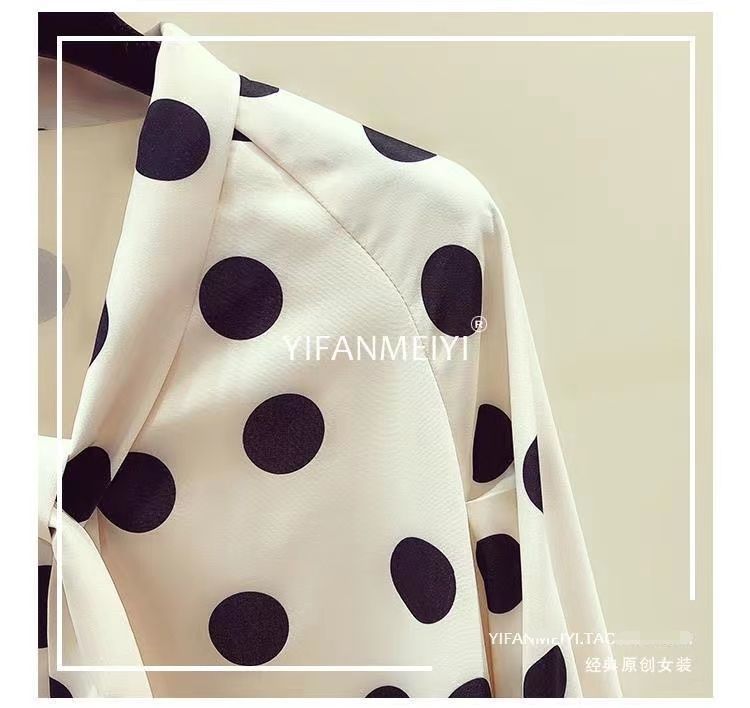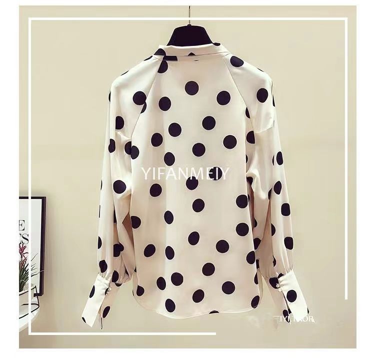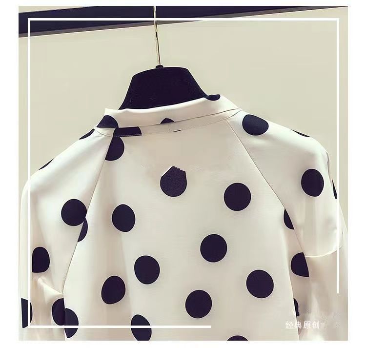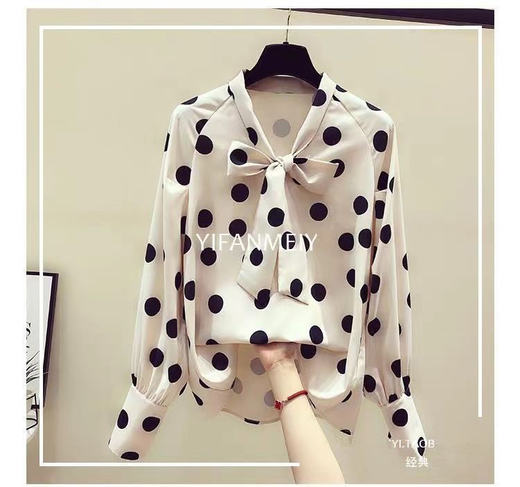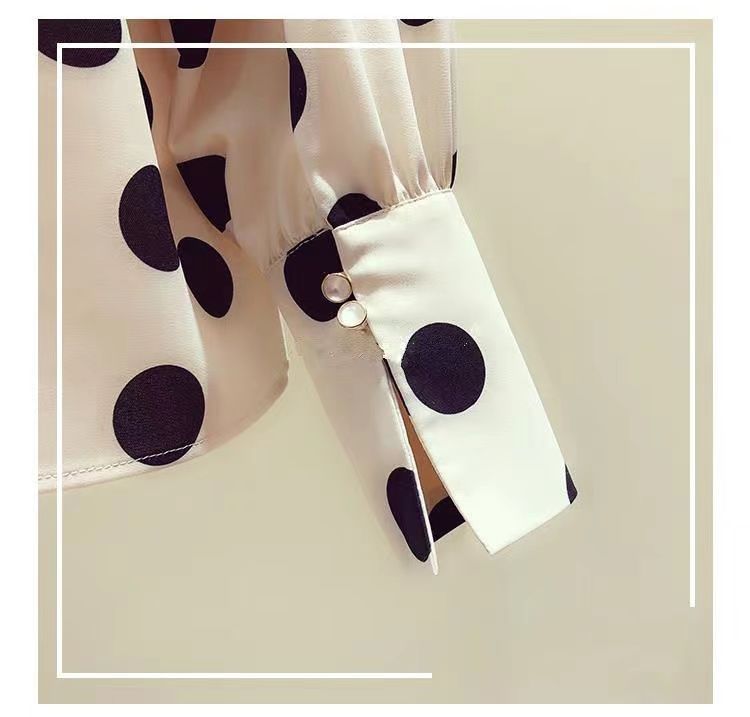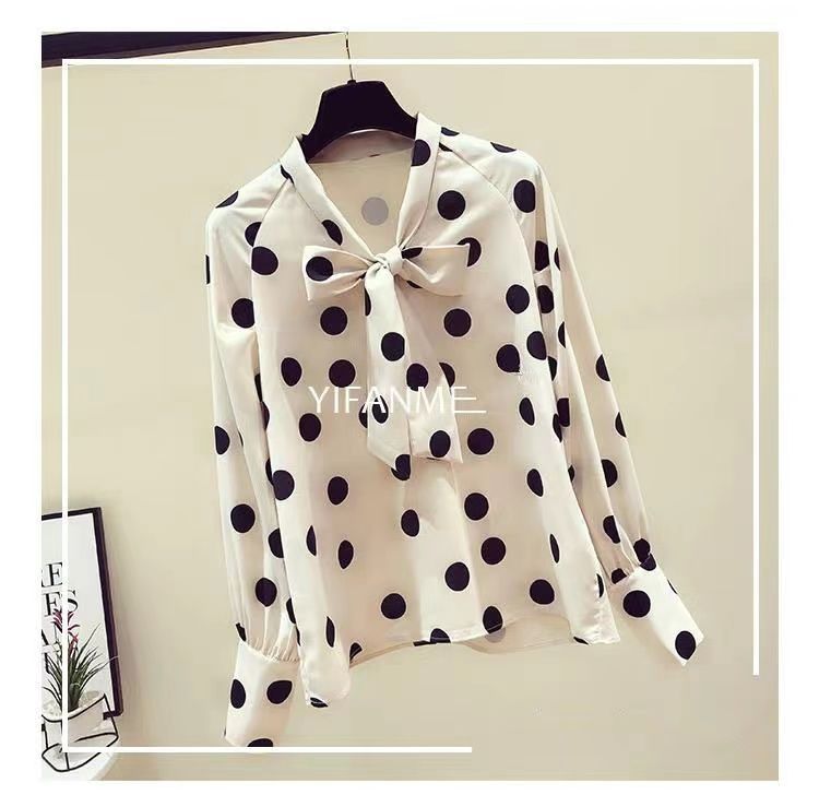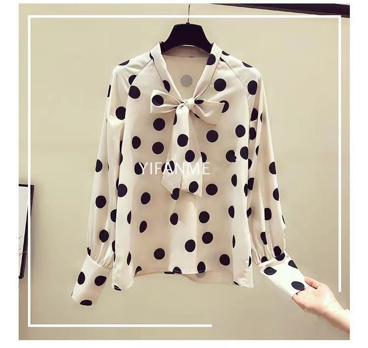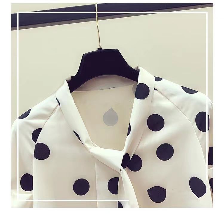세련된 홍콩 스타일 빈티지 폴로 도트 나비 타이 쉬폰 셔츠 세트 코트 여성용 긴 소매 루즈 셔츠스토어 가기